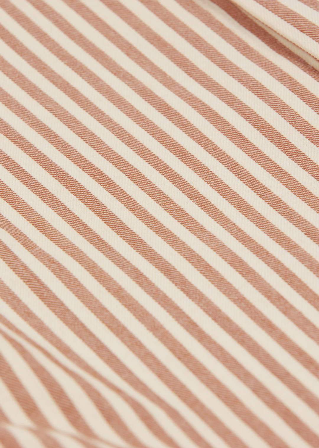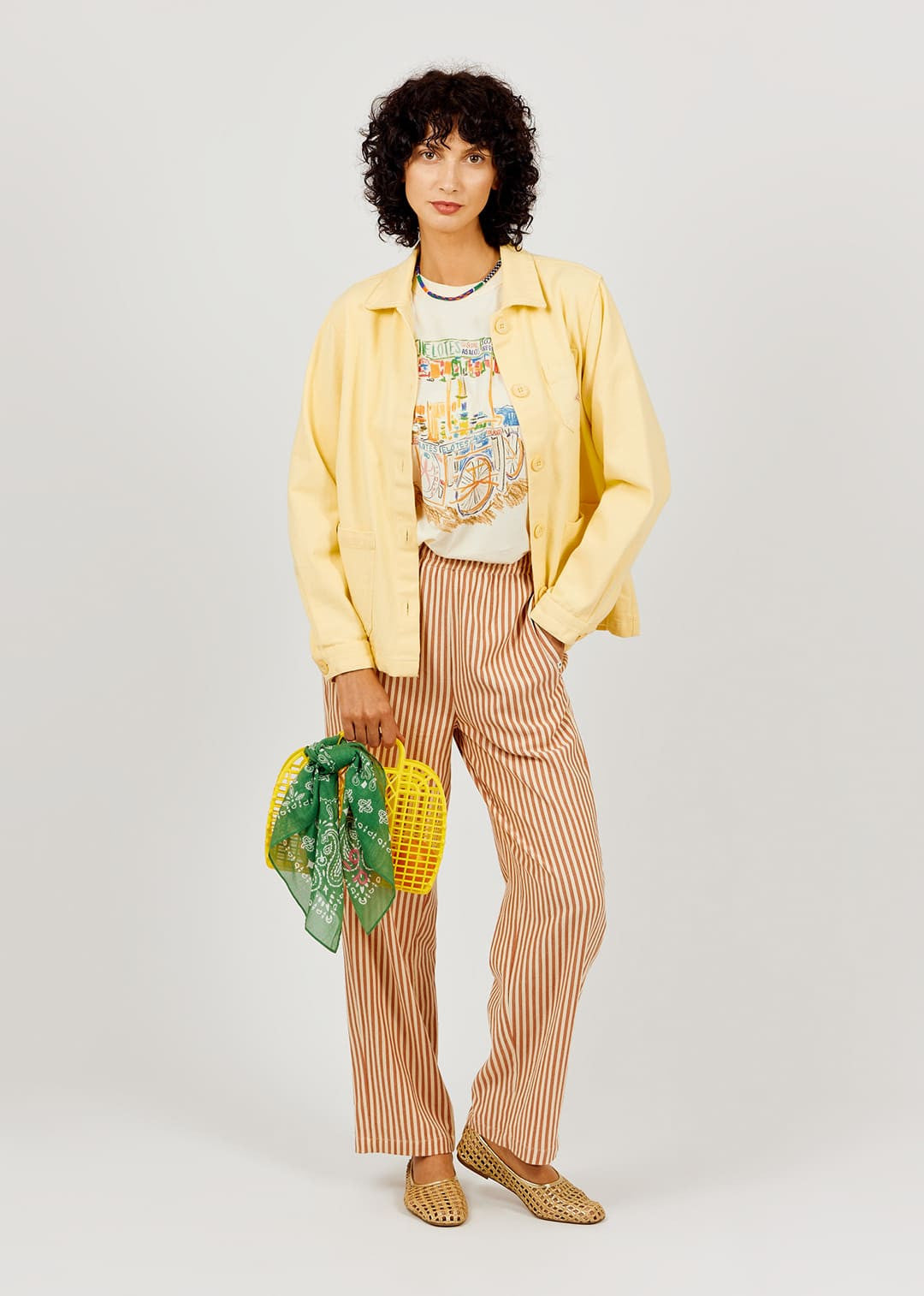 Women's striped denim trousers. • 100% cotton striped denim fabric. • Elasticated waist. • Pockets in the front seam. • Patch pocket at the back with AP & Co patch. • Blue polka dot label inserted on the front pocket. • Available in pink, brown, and cobalt. • Stefania is 1.78 m tall and wears a size 36. • E26WP03