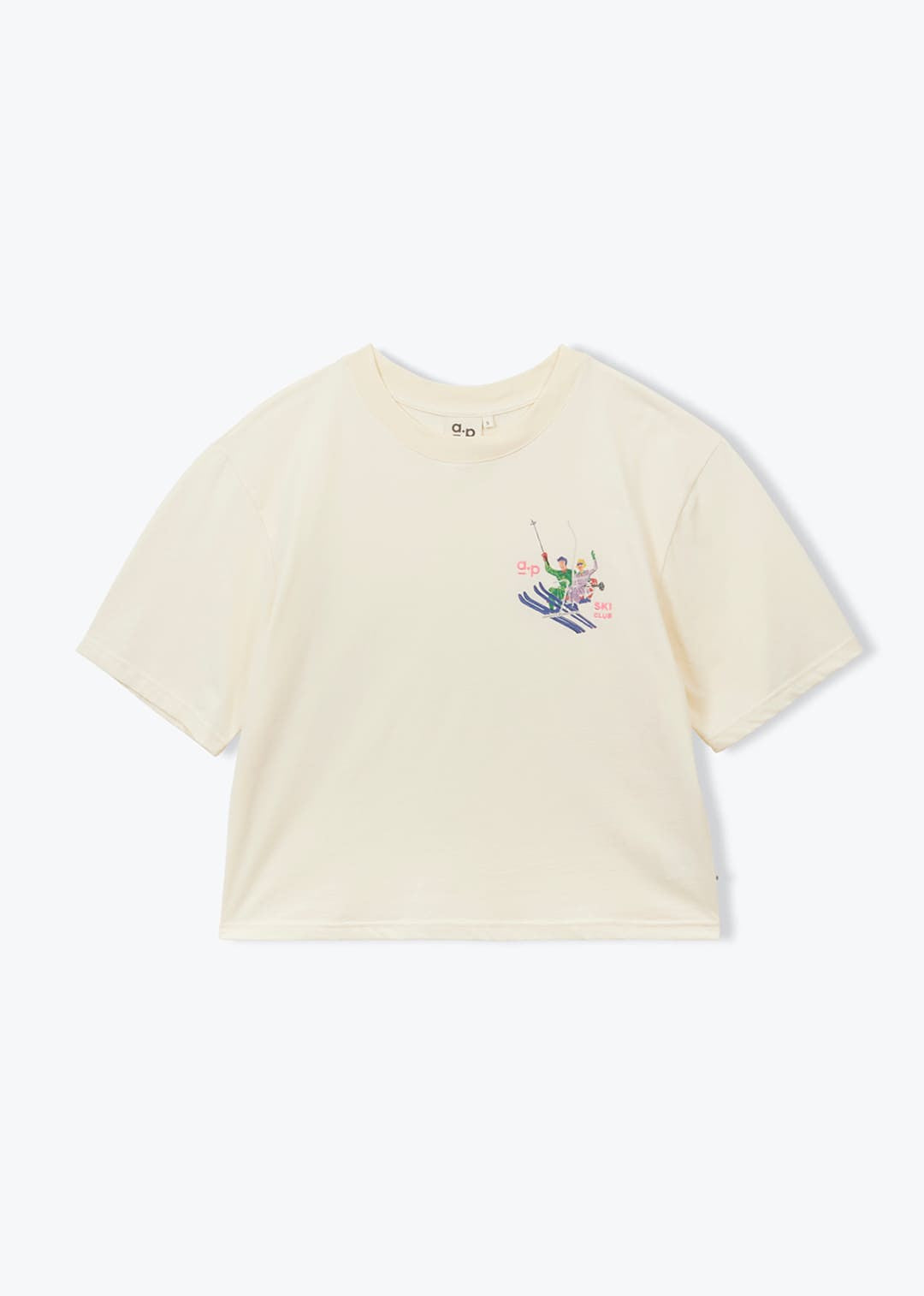 Ariane measures 1m78 and carries the ecru t-shirt in a size S (studio photo).