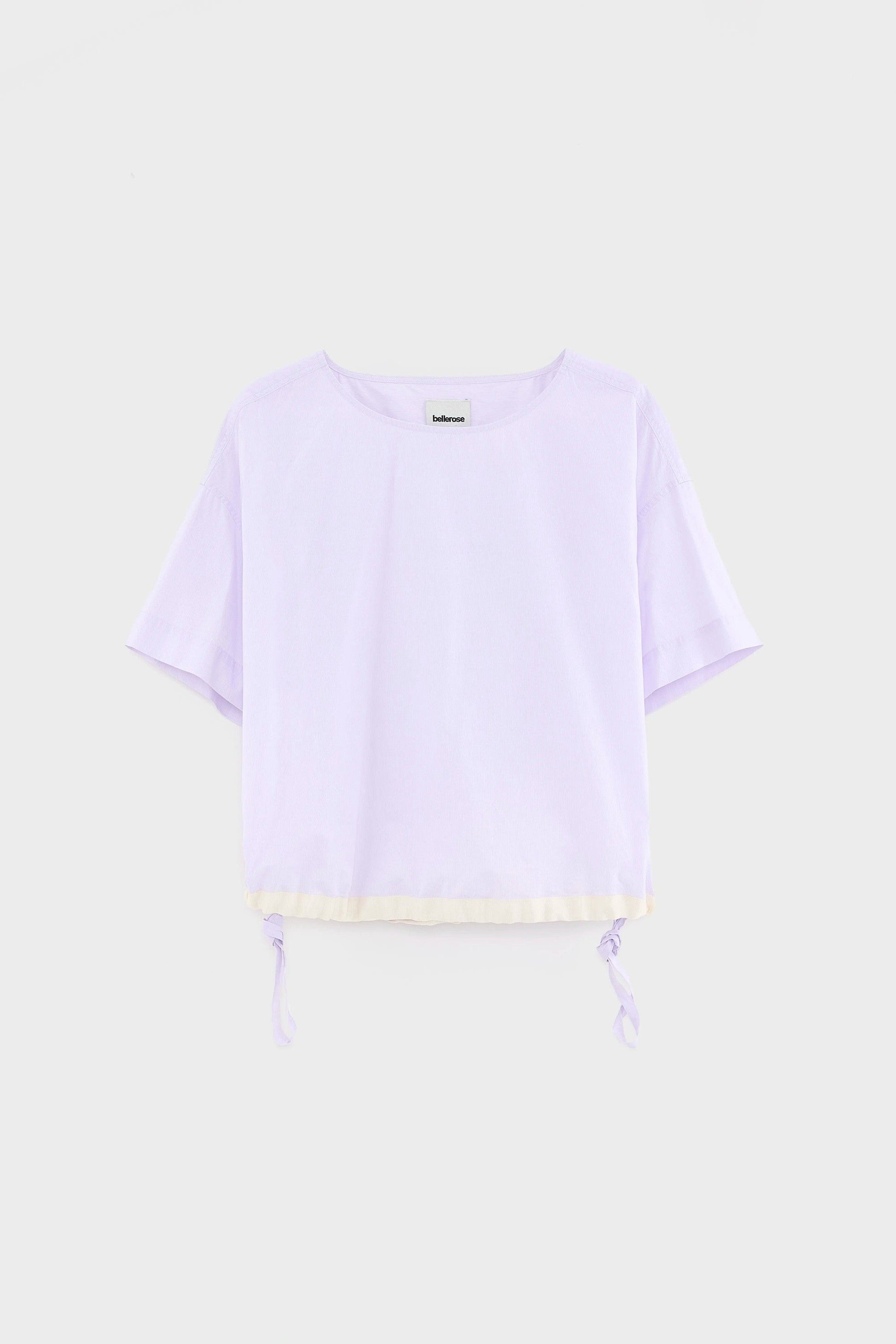 Relaxed short-sleeve blouse in lightweight lilac cotton with a boxy cut, adjustable drawstring hem, and contrast trim.