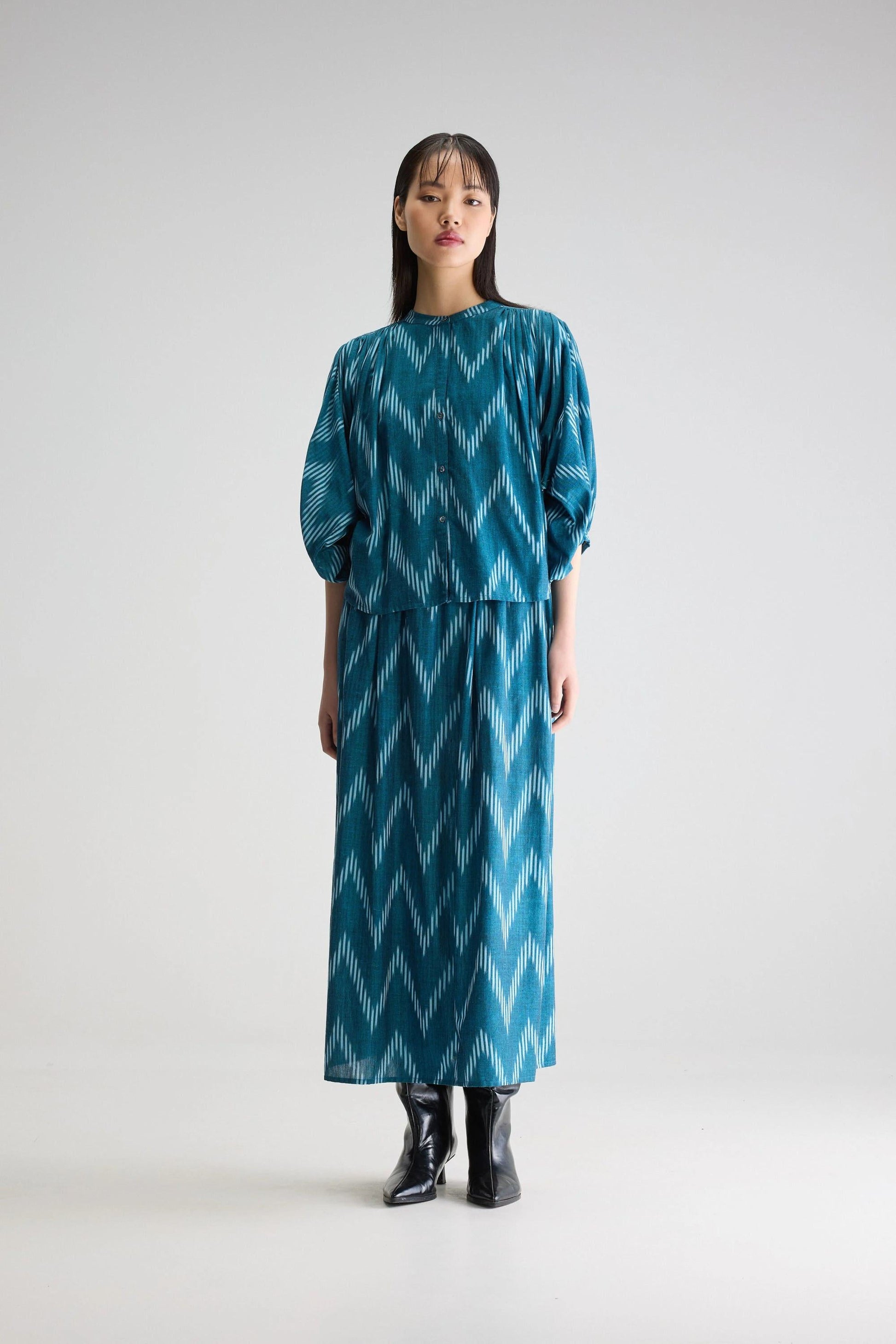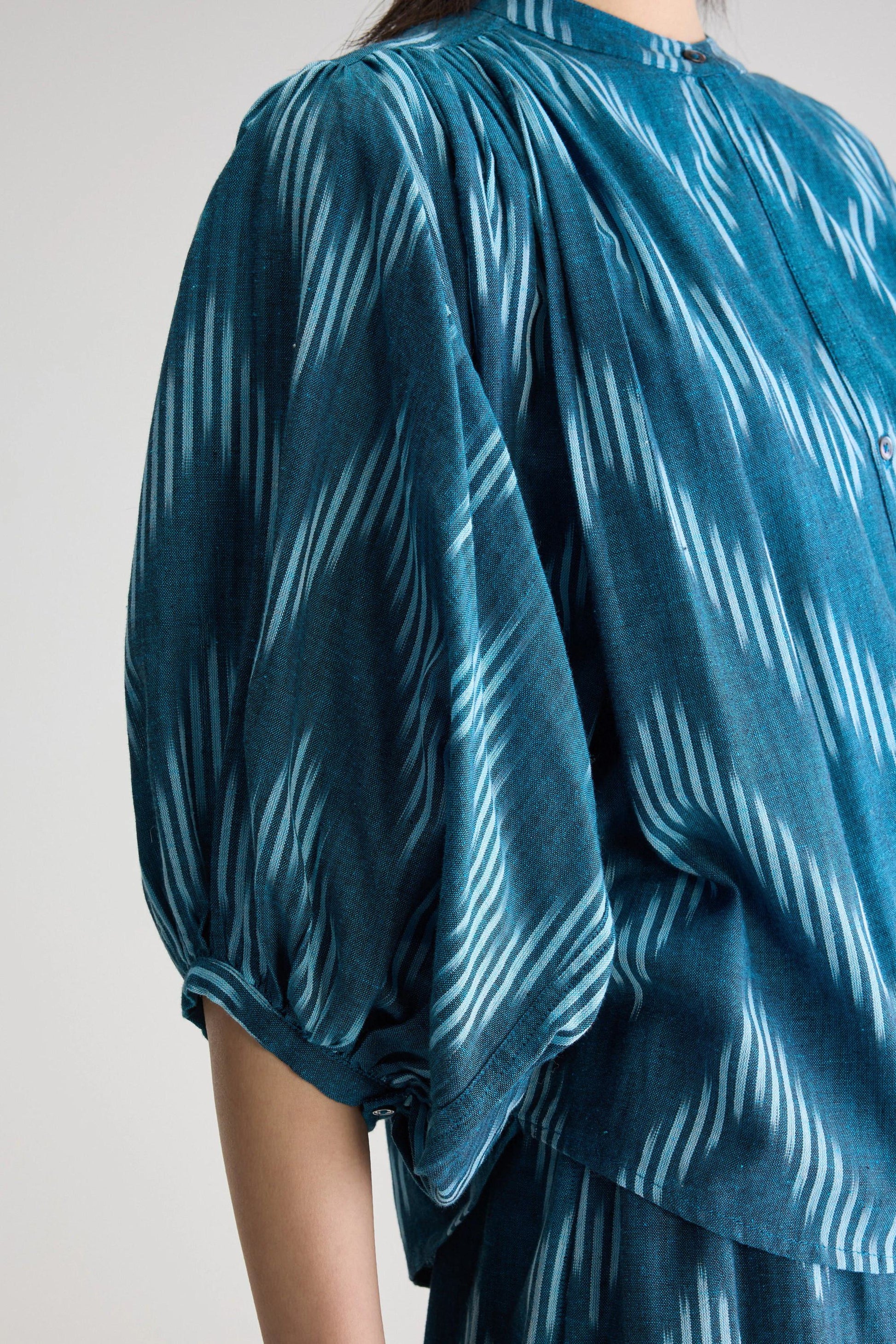 Oversized button-up blouse with gathered details and batwing sleeves, made from ikat cotton in blue hues.