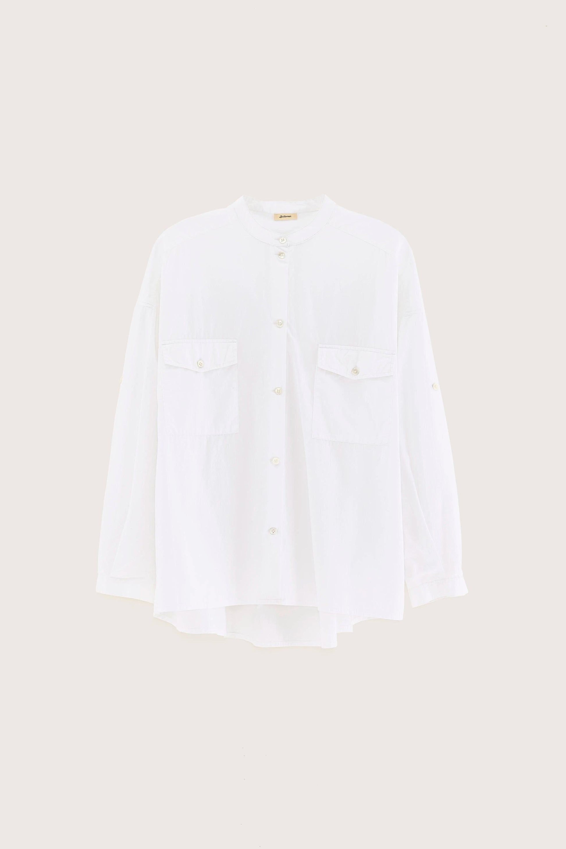 Relaxed shirt with a small stand-up collar and patched pockets, made from white cotton poplin with a light crinkled finish.