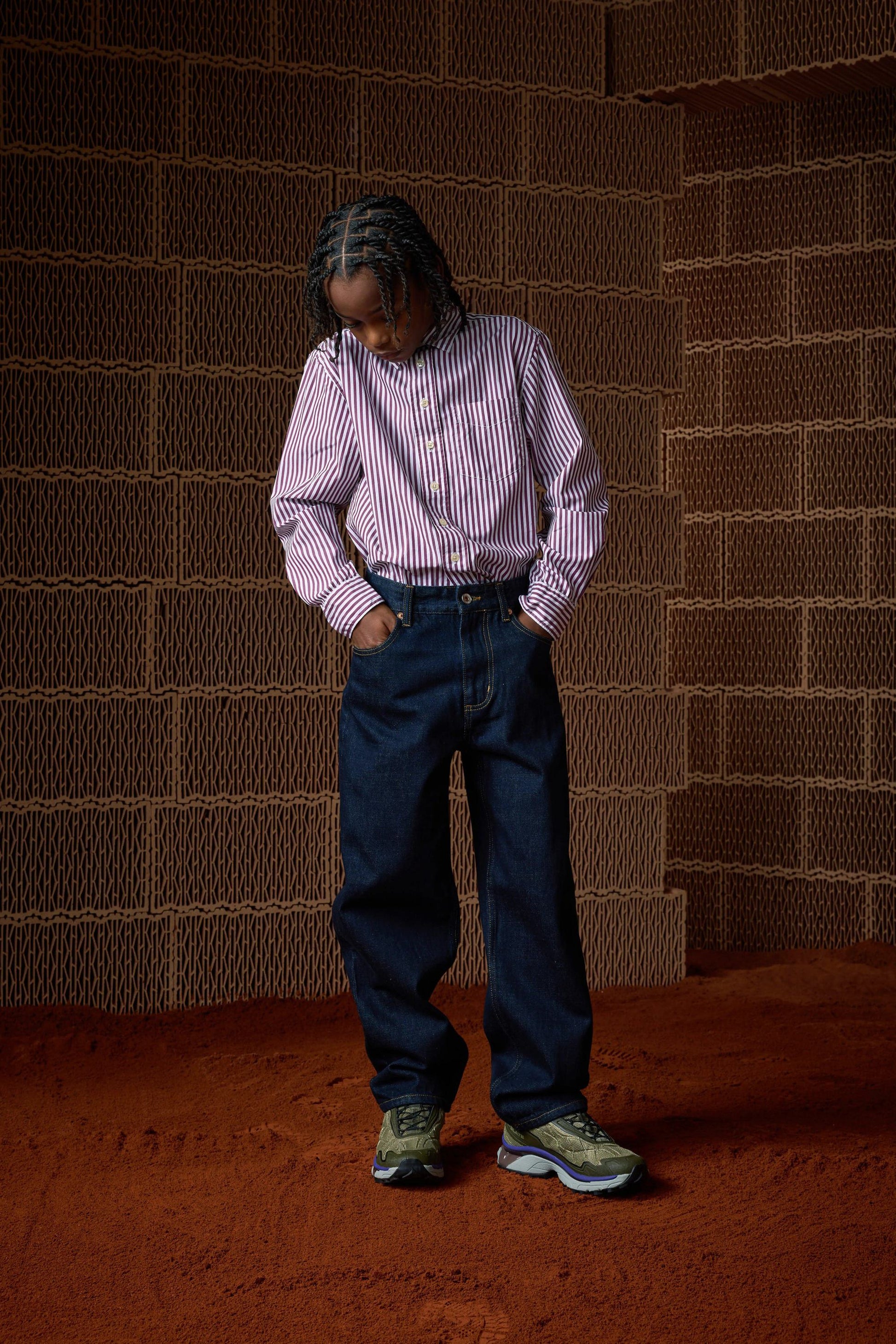 Classic dark blue denim jeans with a relaxed fit, contrast stitching, and slightly tapered legs.