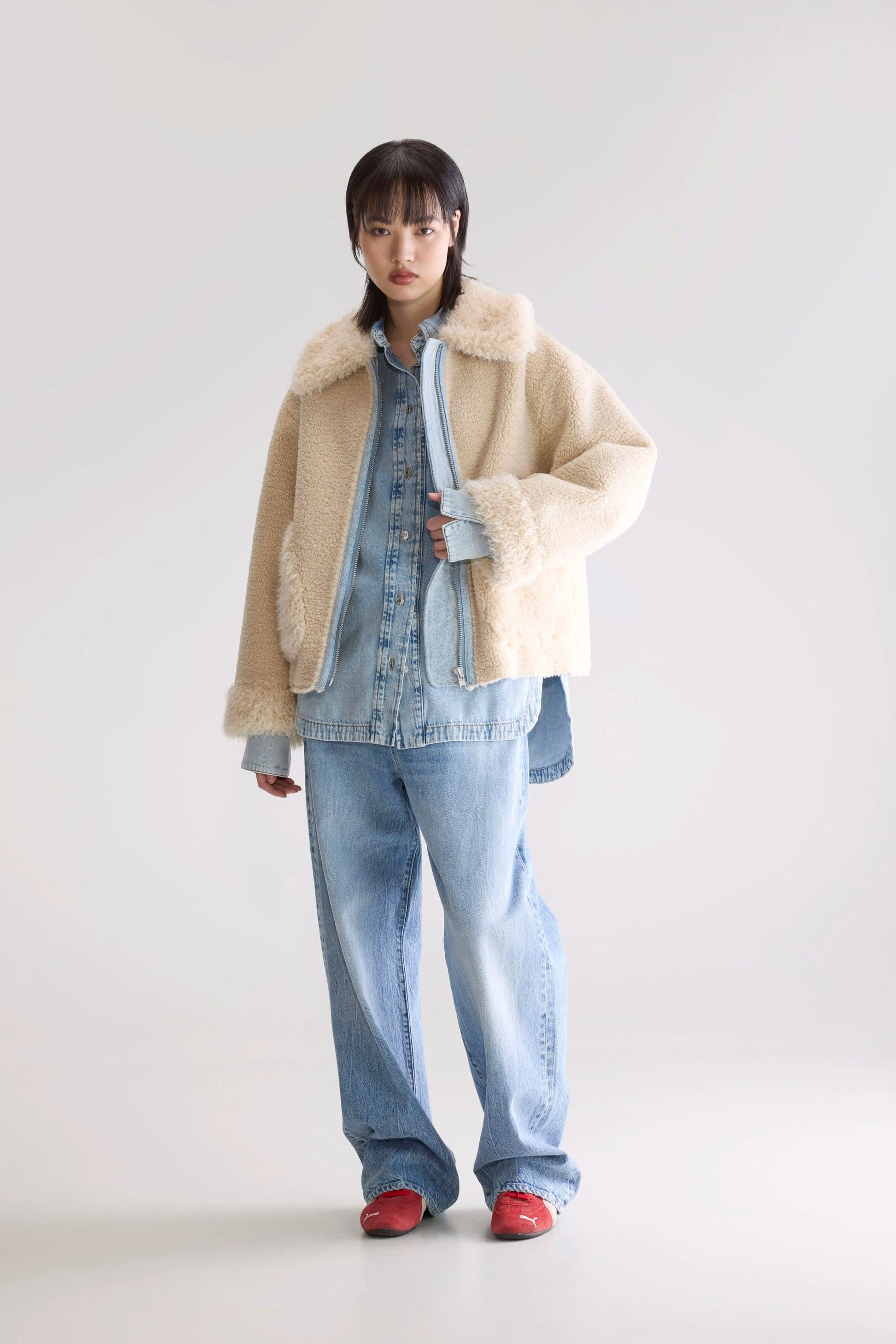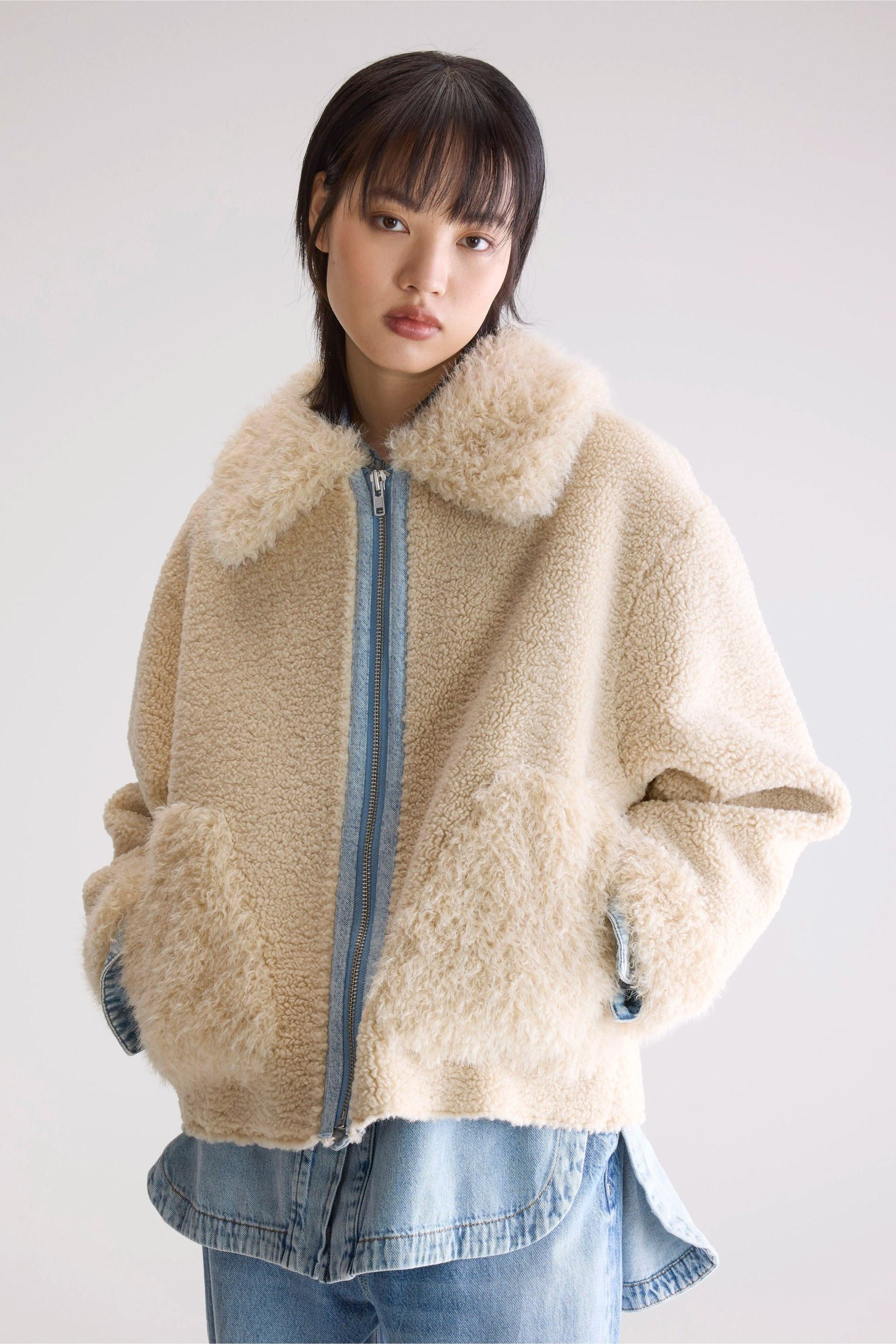 Contrasting curly faux shearling on the collar, pockets, cuffs