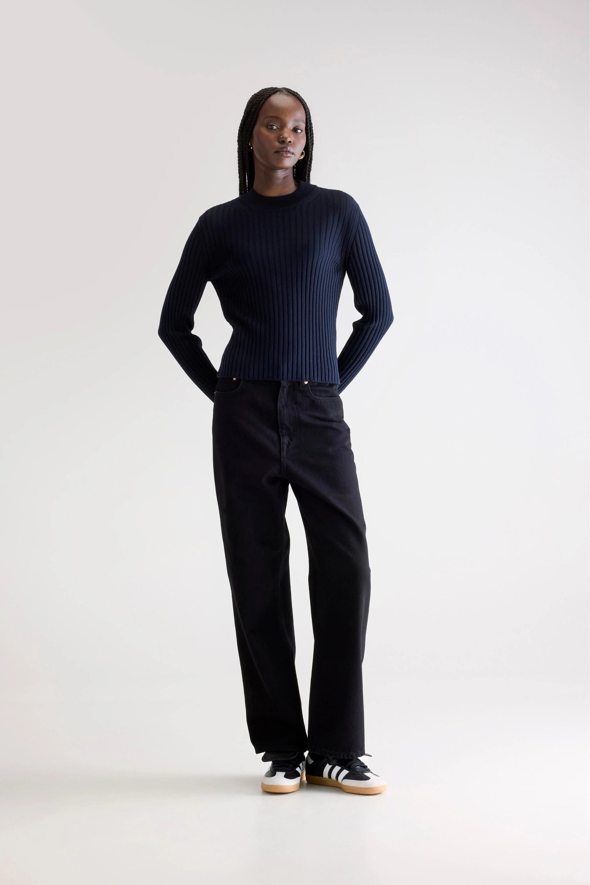 Slim fit ribbed sweater in navy blue, with a high-rounded neckline.