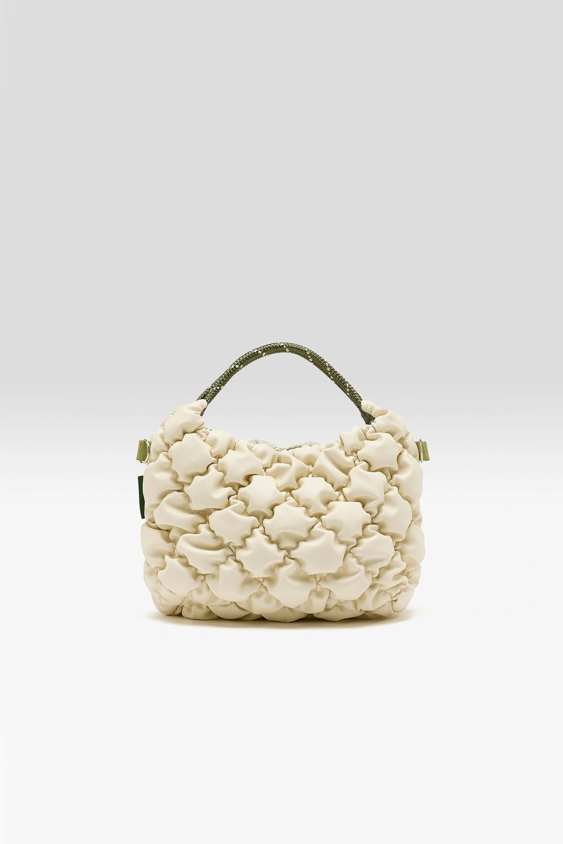 Padded shoulder bag in cream faux leather with a textured finish, khaki lining, and double set of handles.