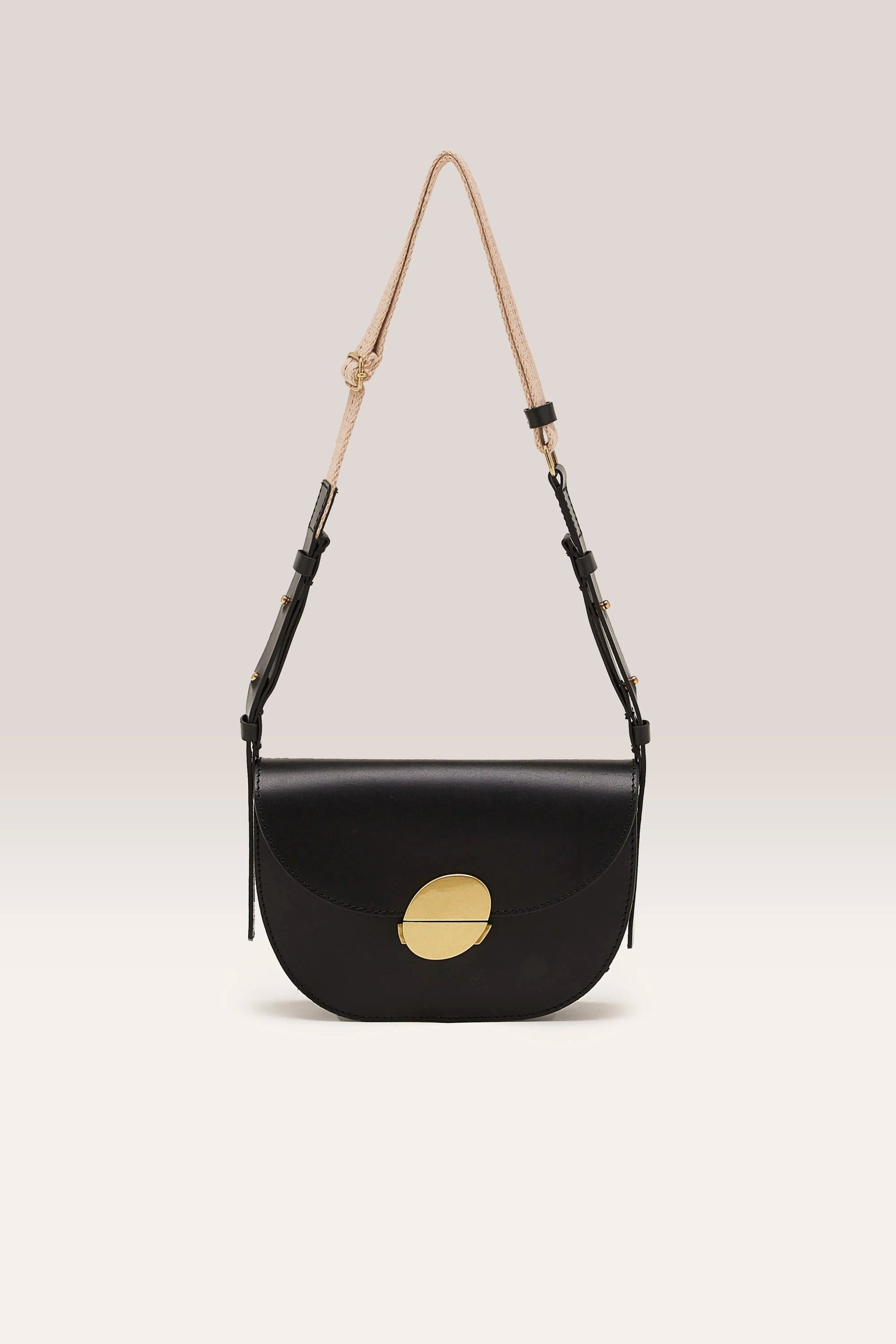 Half-moon shoulder bag with polished snap clasp closure and cotton and leather strap made from cognac, smooth leather.
