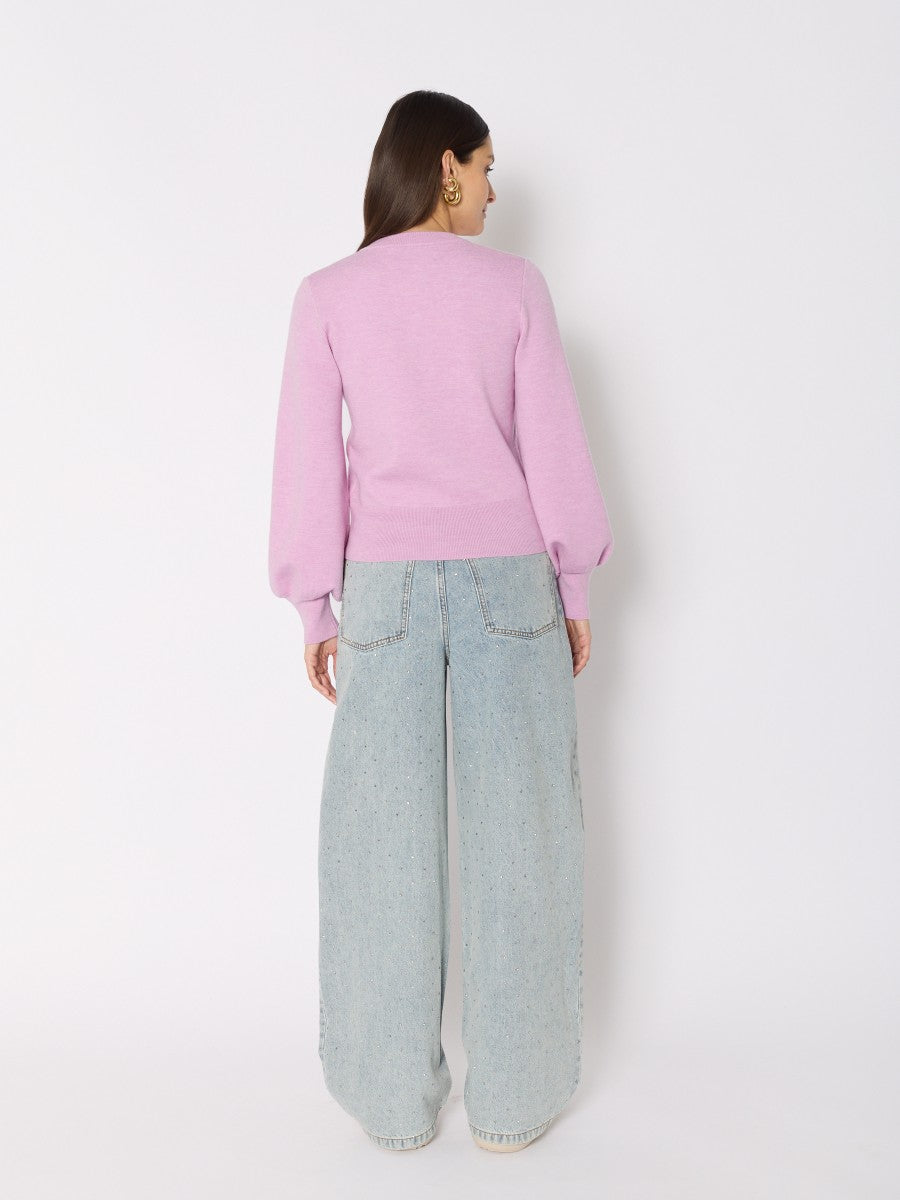 A 1 essential for your wardrobe, the MGALIA cardigan seduces with its modern and feminine design. This model with balloon sleeves and round neck is perfect for mid-season. Its elegant cut is enhanced by silver snap buttons, which add a refined and distinguished touch. Made in a fine merino wool knit and in a delicate pink shade, this cardigan will be perfect for your summer evenings.