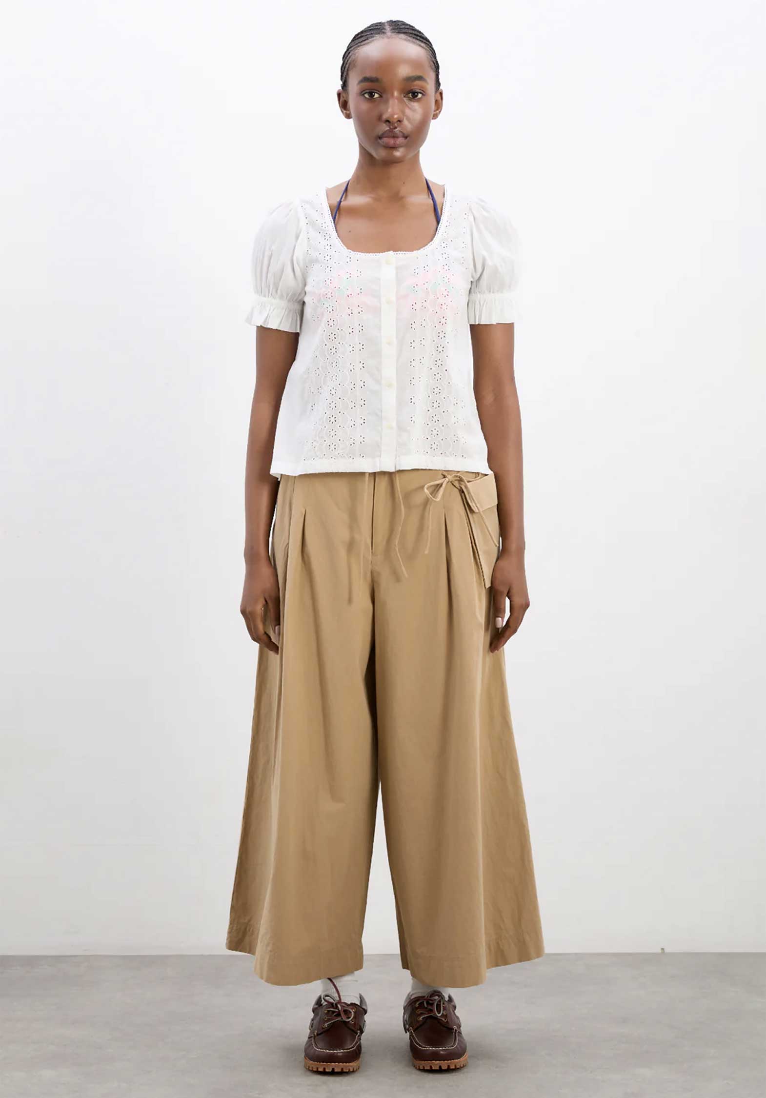 Oversized, structured and cropped, the Tatianna Culottes in tan are made from 100% organic cotton. Featuring a removable pocket, pleat detailing and custom DM embroidery on the back pockets.
