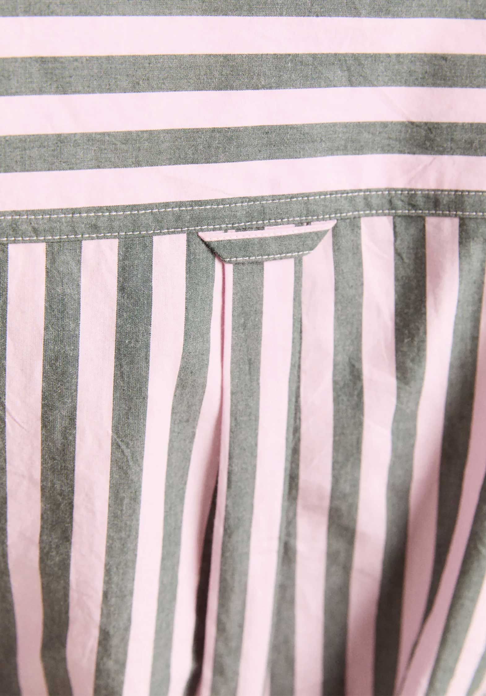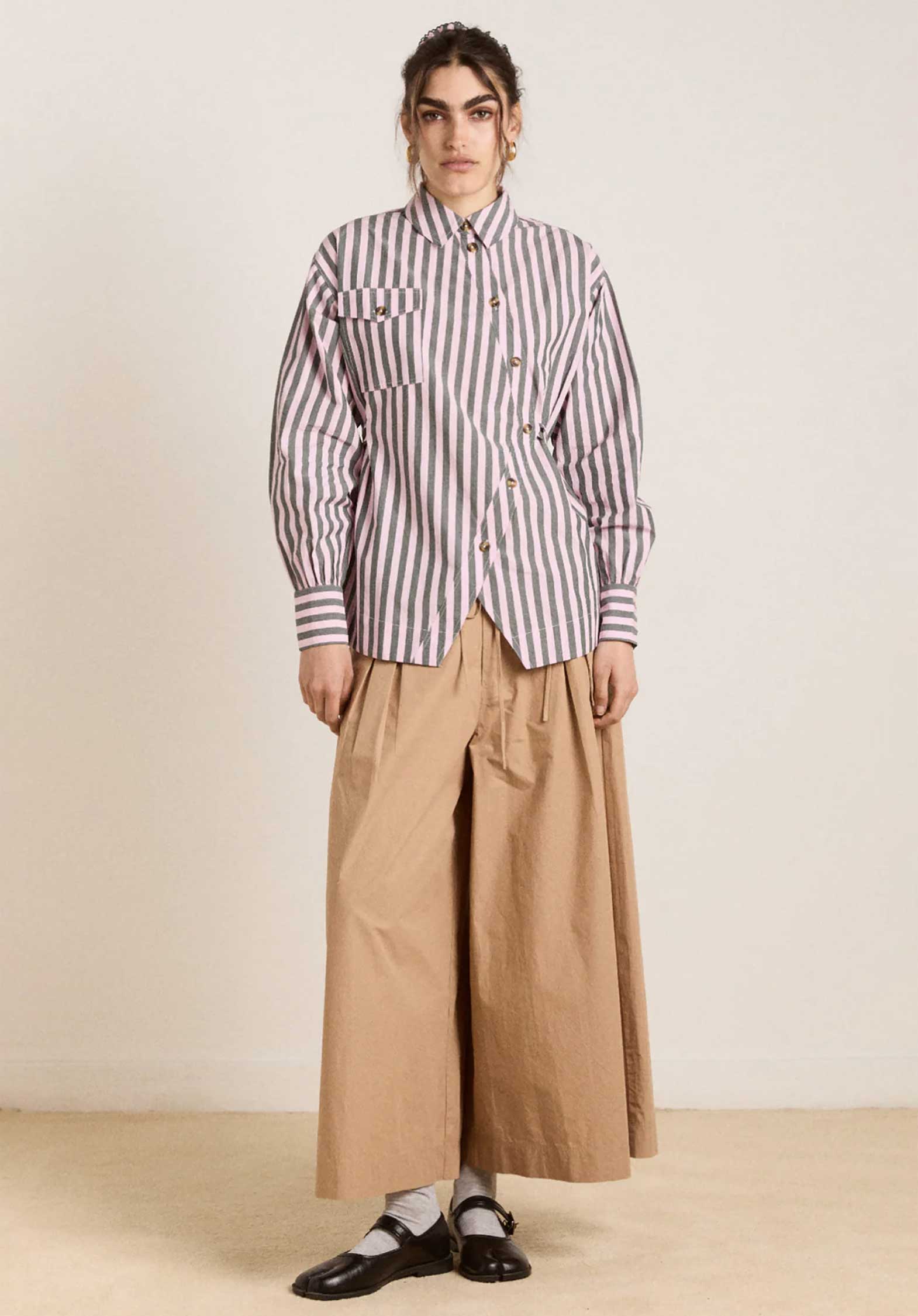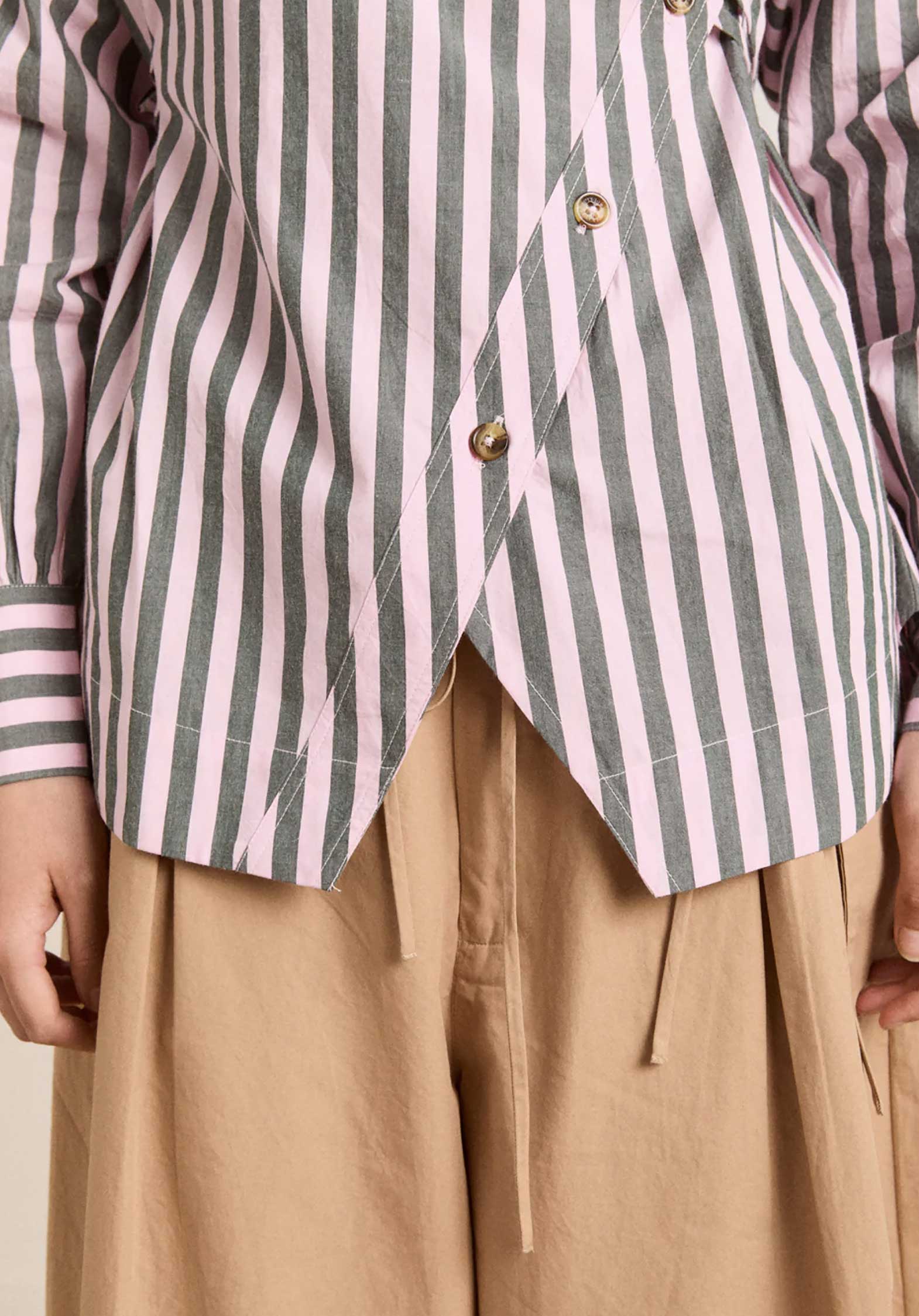 The Lux Shirt in Garden Tulle Stripe is cut from crisp 100% organic cotton and is defined by its dramatic asymmetric button placket.