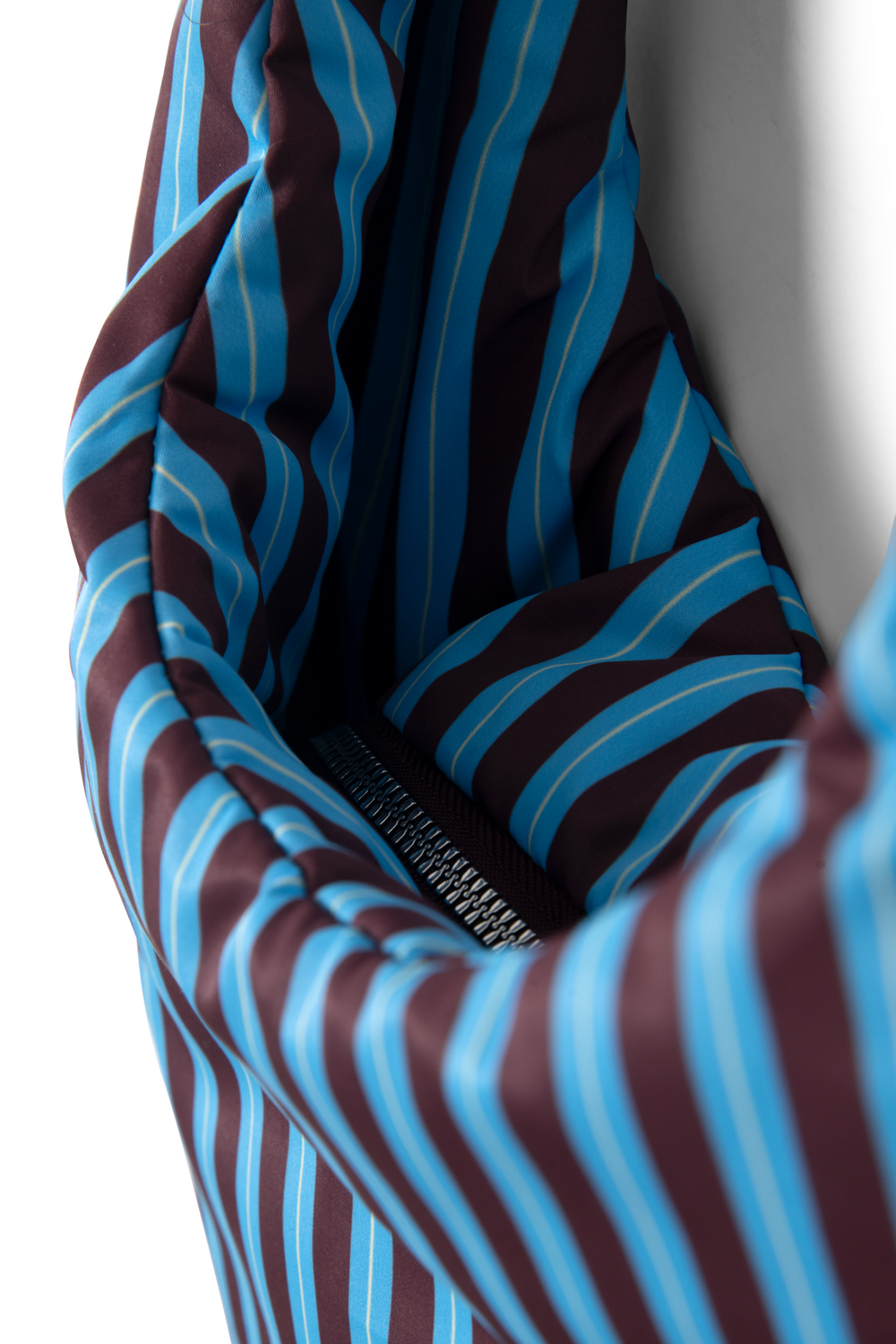 New minimal update of our best-selling Quinn Bag Metal zip Custom choc and blue stripe Adjustable strap, can be worn cross body or as a shoulder bag 100% recycled polyester