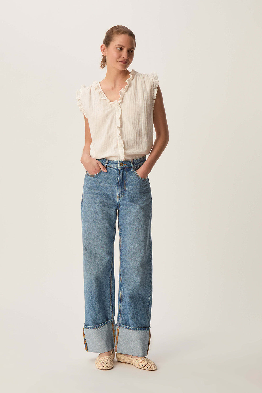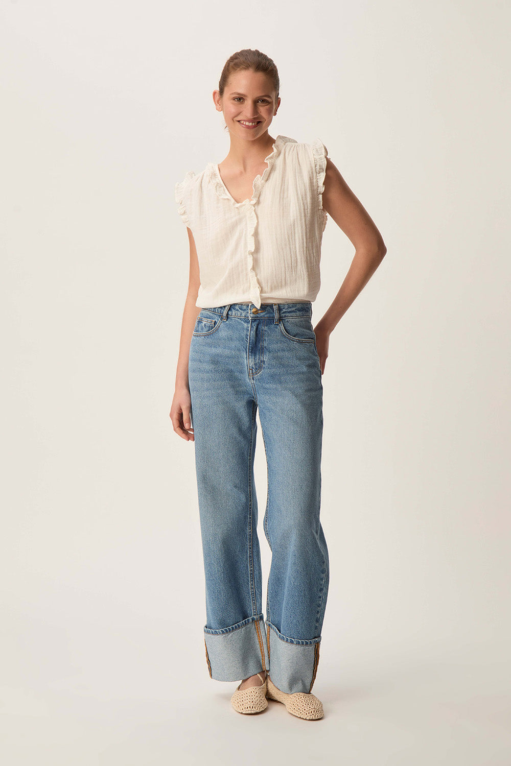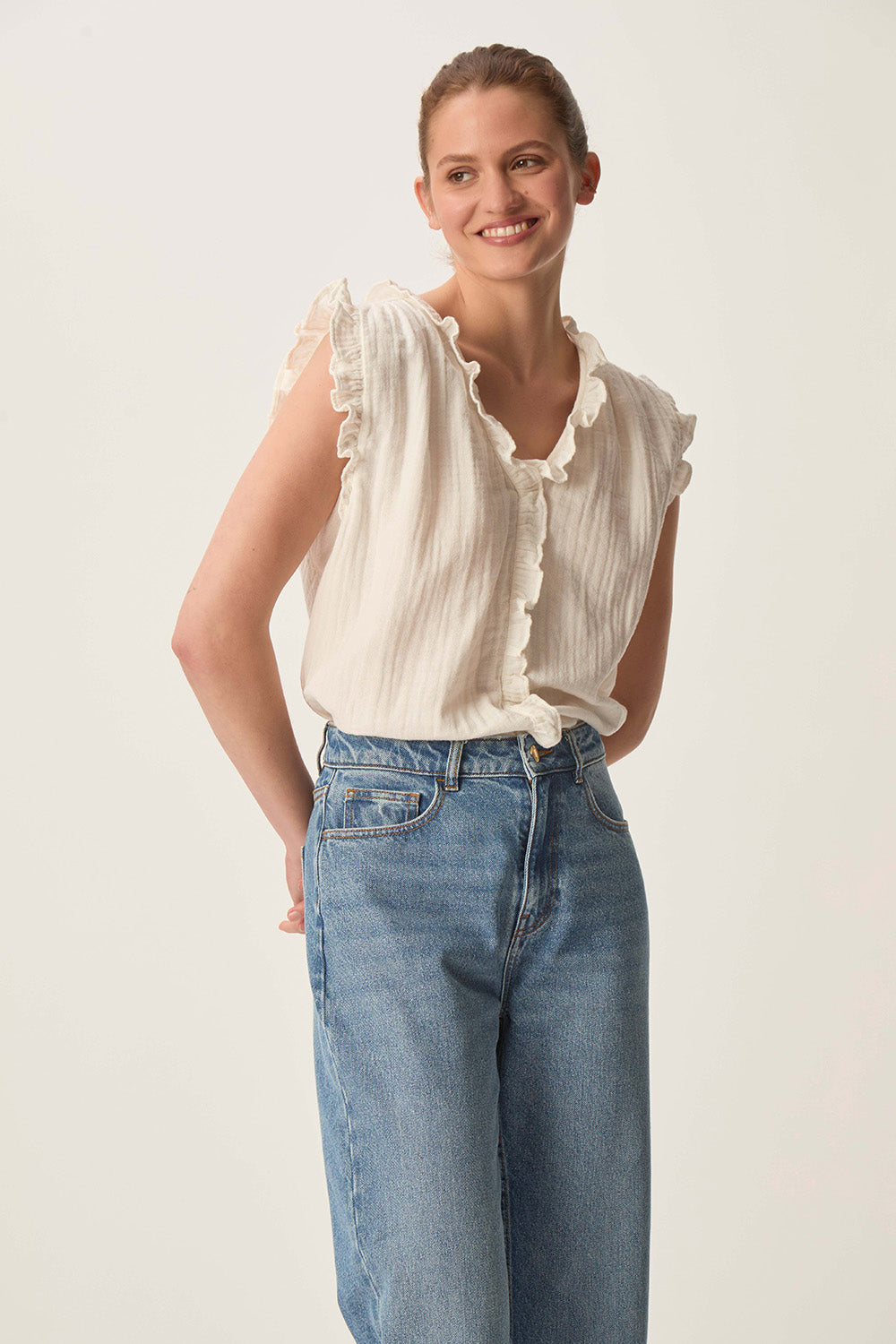 Double cotton gauze is everywhere this season, starting with this Soprano top. Featuring ruffles and gathers for a casual boho chic vibe, it looks great with trousers or a skirt.