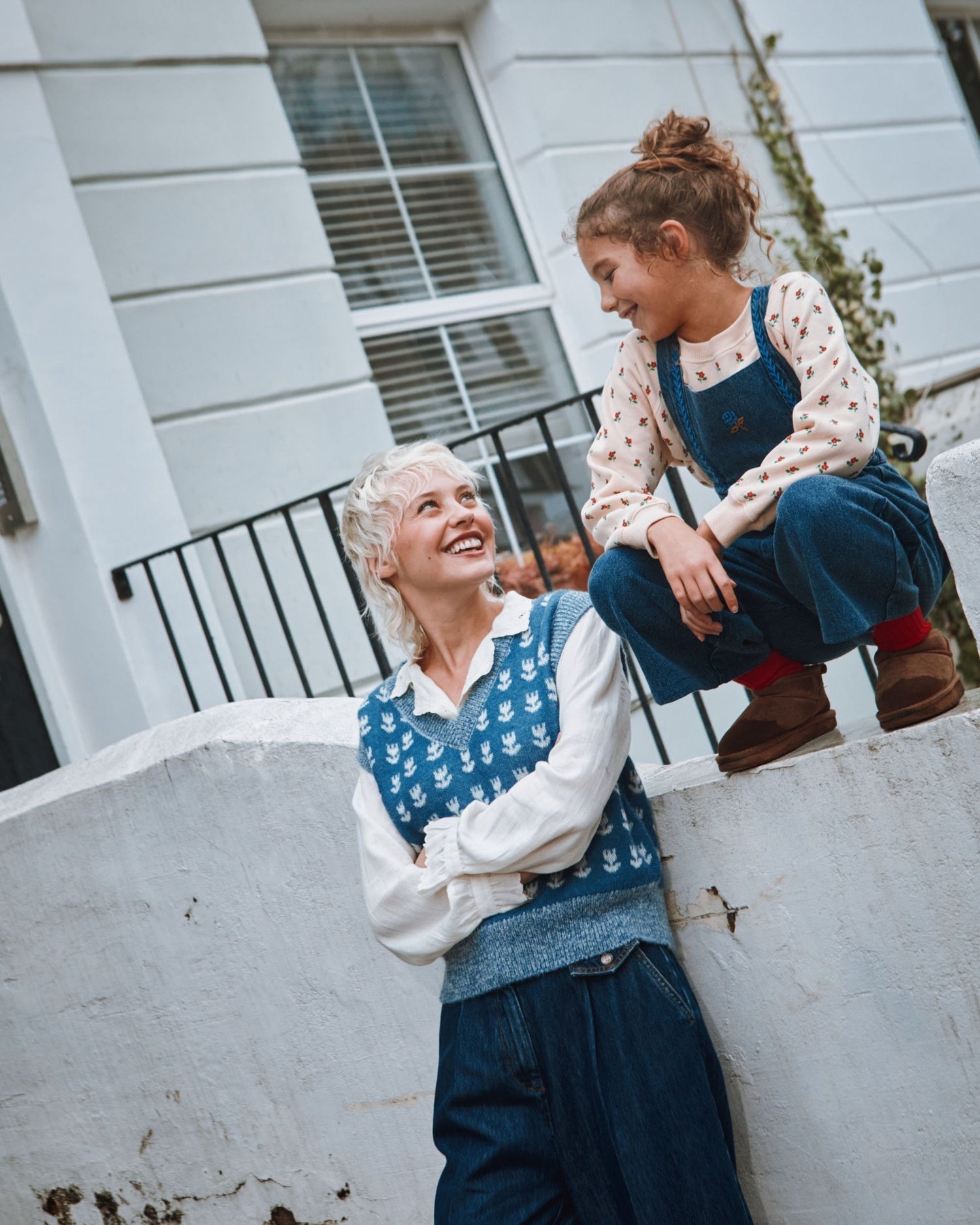 Blue sleeveless sweater in blended sheep's wool. Rows of white tulips, as neatly aligned as in a French garden, enliven the front and back of the cardigan.