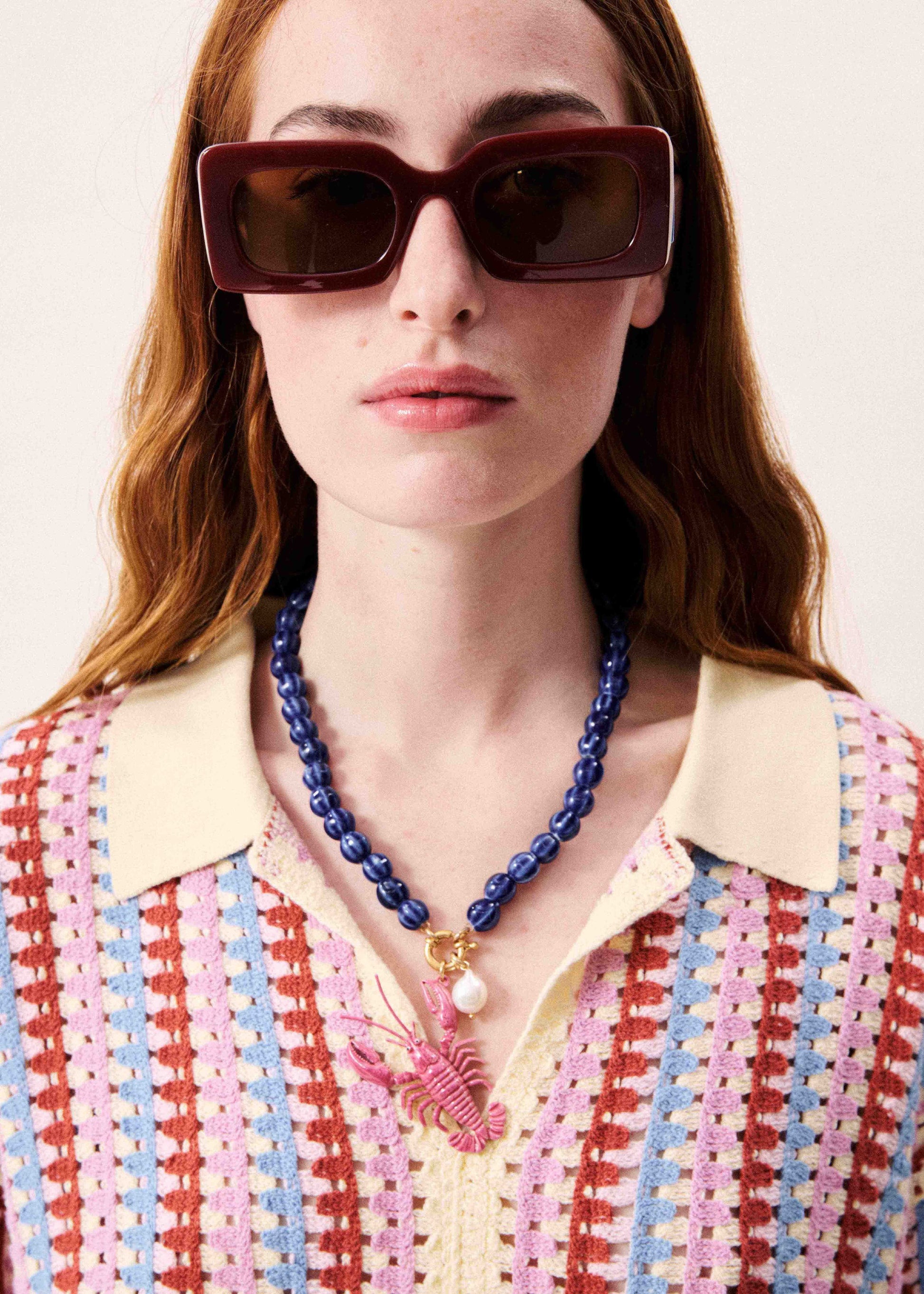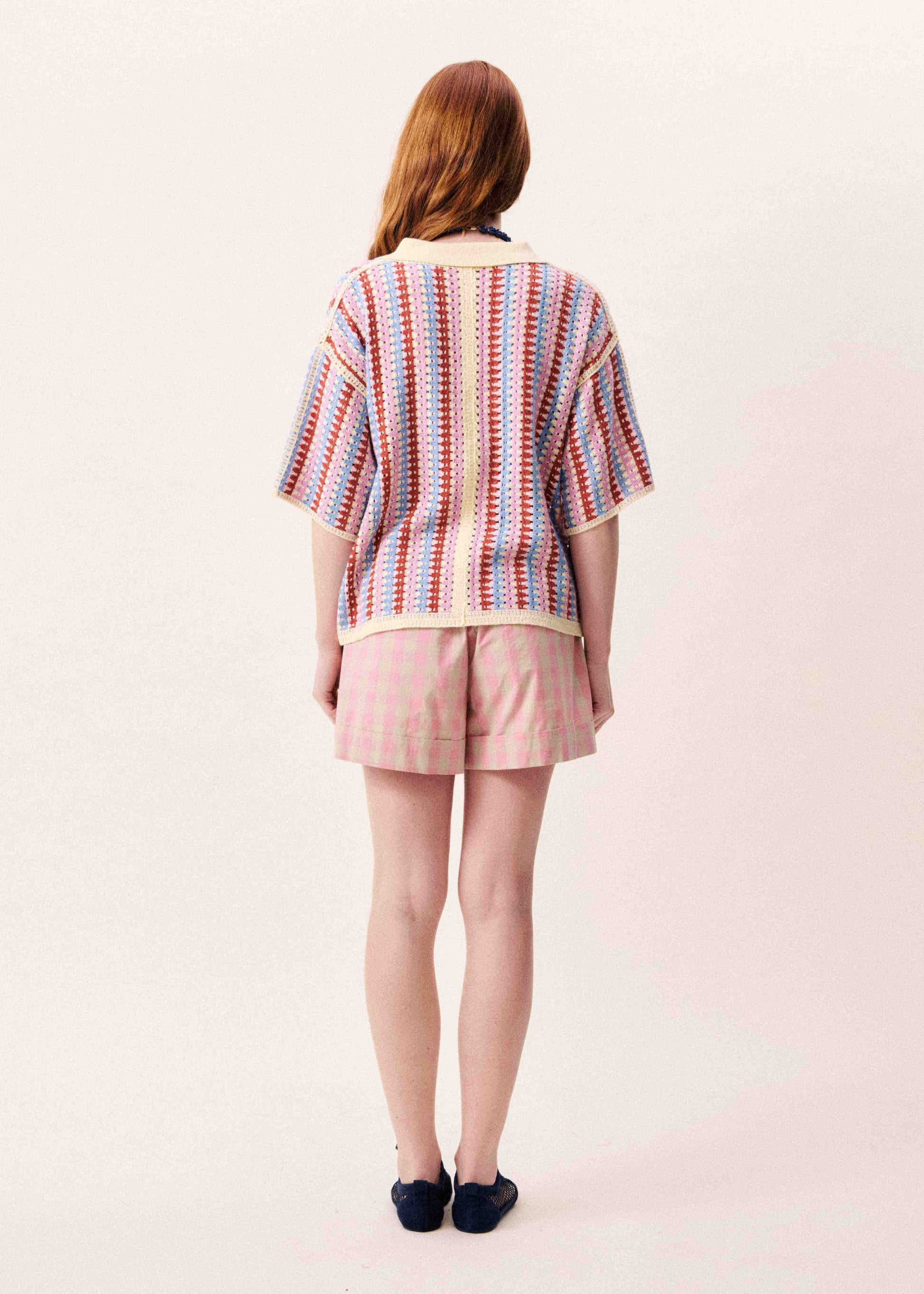 Polo shirt in jacquard knit with multicolored geometric patterns • Short-sleeved polo shirt in fine knit • Contrasting ecru shirt collar with button placket • Vertical striped jacquard patterns in red, blue and pink • Tone-on-tone ribbed trim at the neckline and cuffs • Straight, mid-length cut