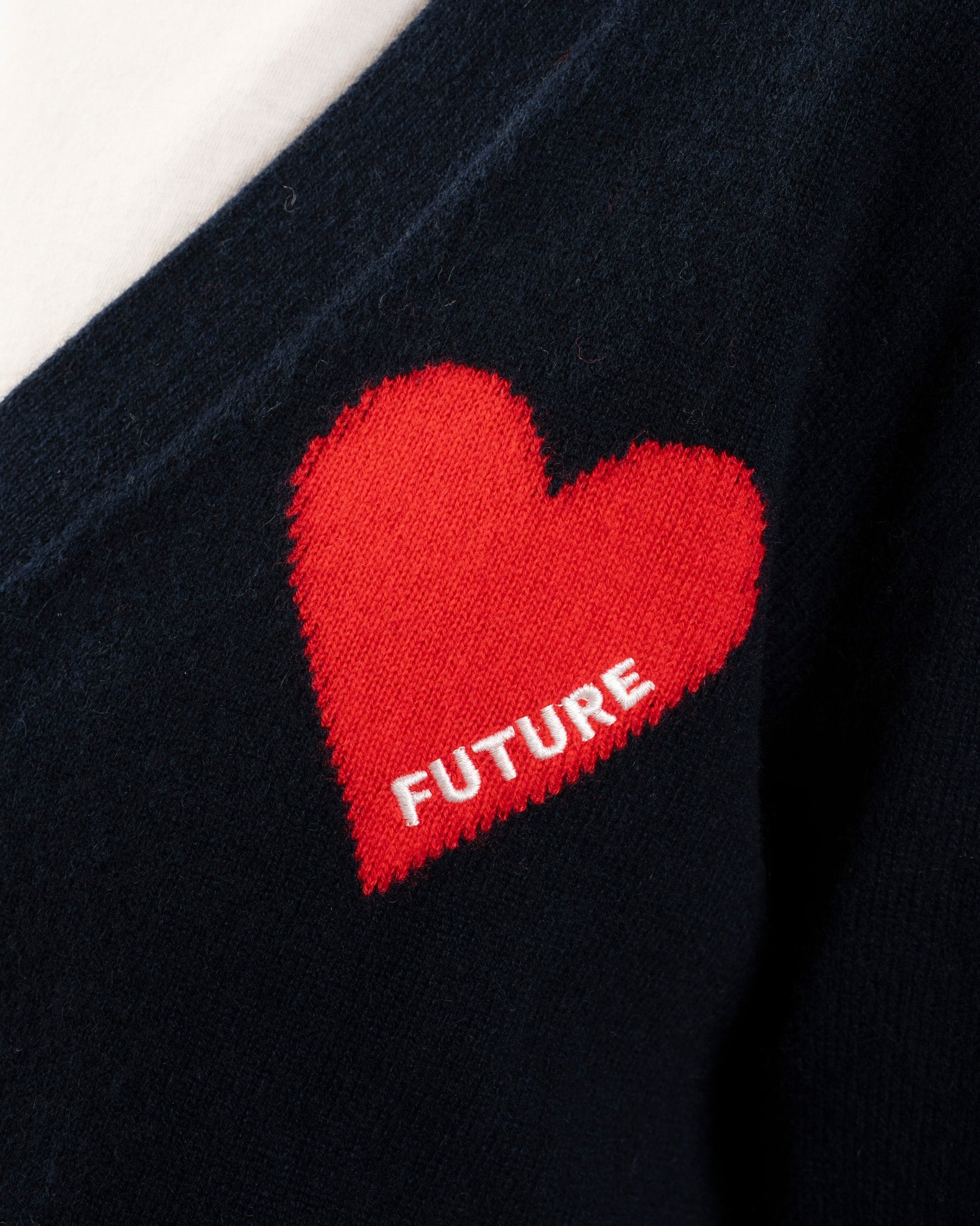 A must-have in the FROM FUTURE wardrobe, this short cardigan sweater features a soft, light knit made from 2-thread cashmere. Featuring long sleeves, ribbed edges and a buttoned closure, it reveals a V-neck and an intarsia heart decorated with FUTURE embroidery on the chest. Worn alone or over a t-shirt, it pairs easily with casual jeans.