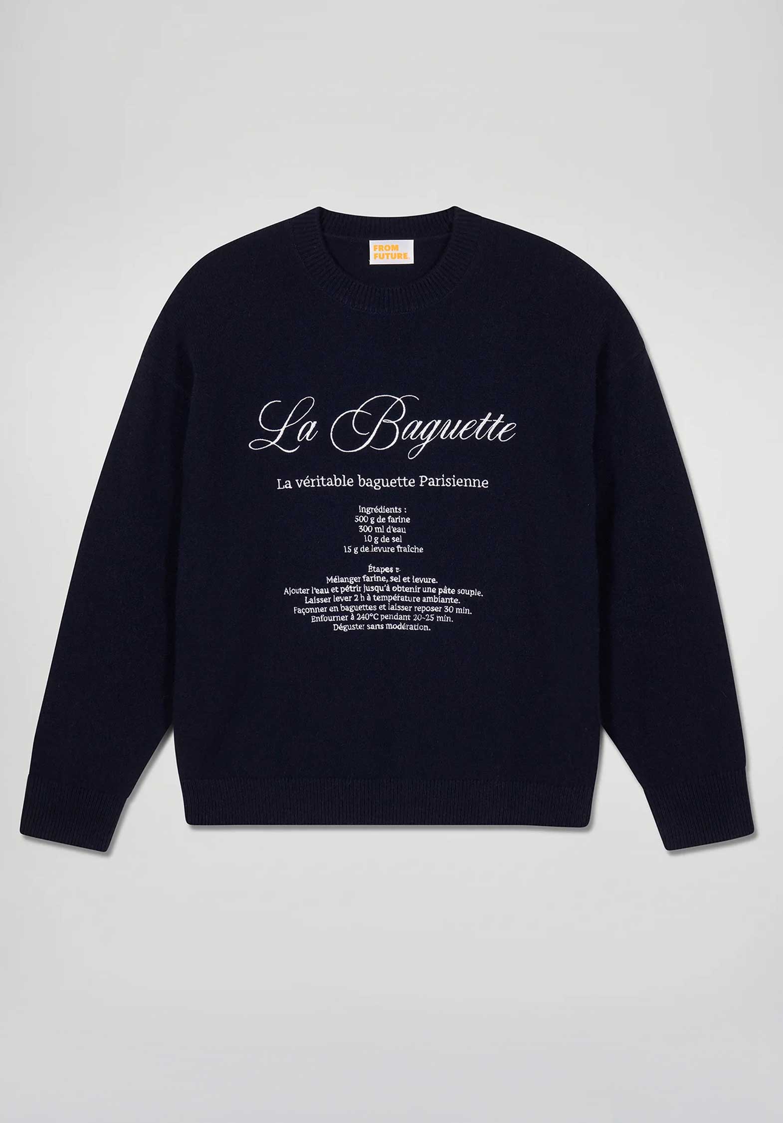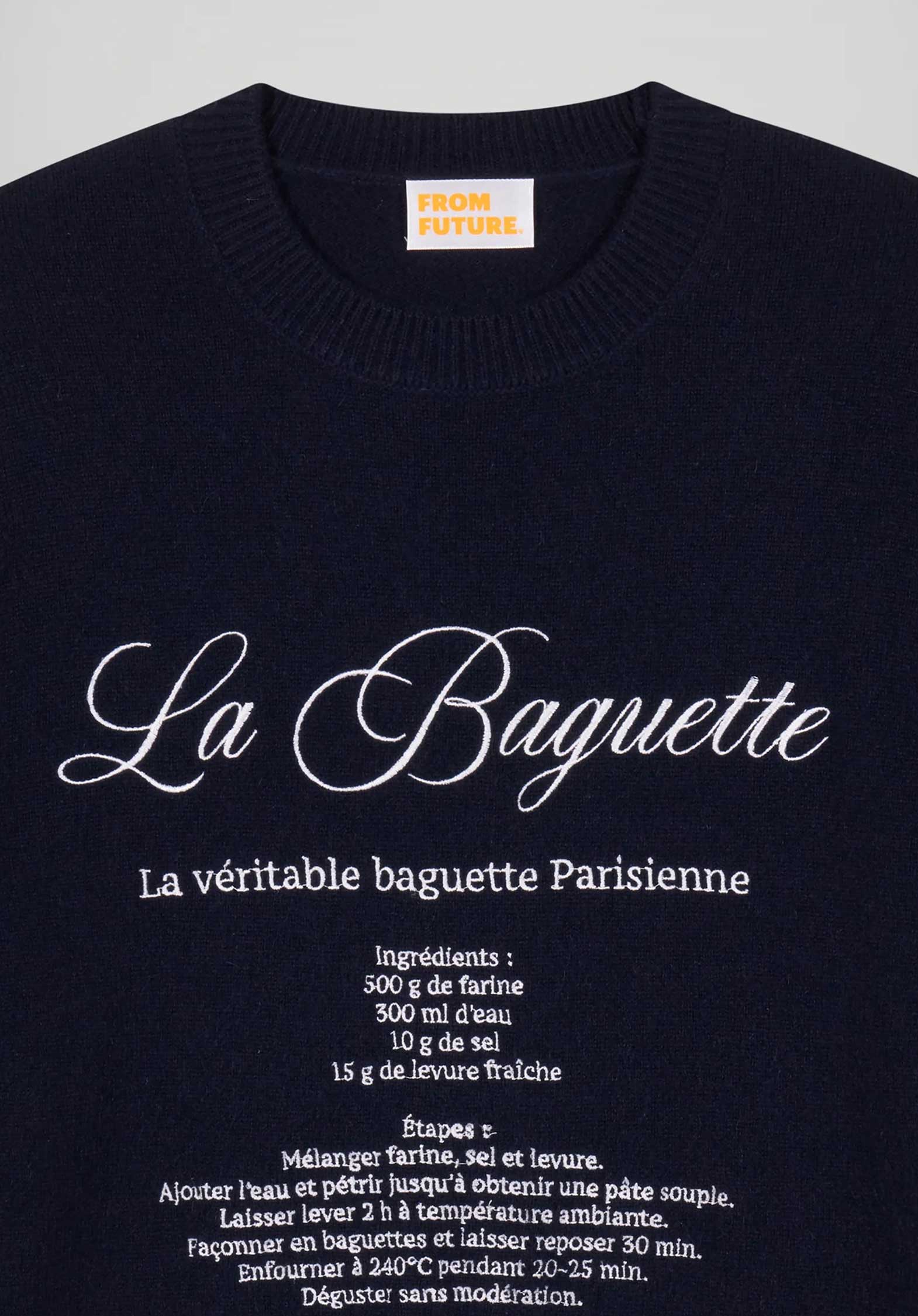 - Women's GCS certified 2-ply cashmere sweater - La Baguette recipe embroidery - Round neck - Long sleeves - Short, regular cut - Ribbed finishes - The Good Cashmere Standard (GCS) is an independent standard for more sustainable and responsible cashmere.It aims to improve the welfare of Kashmiri goats