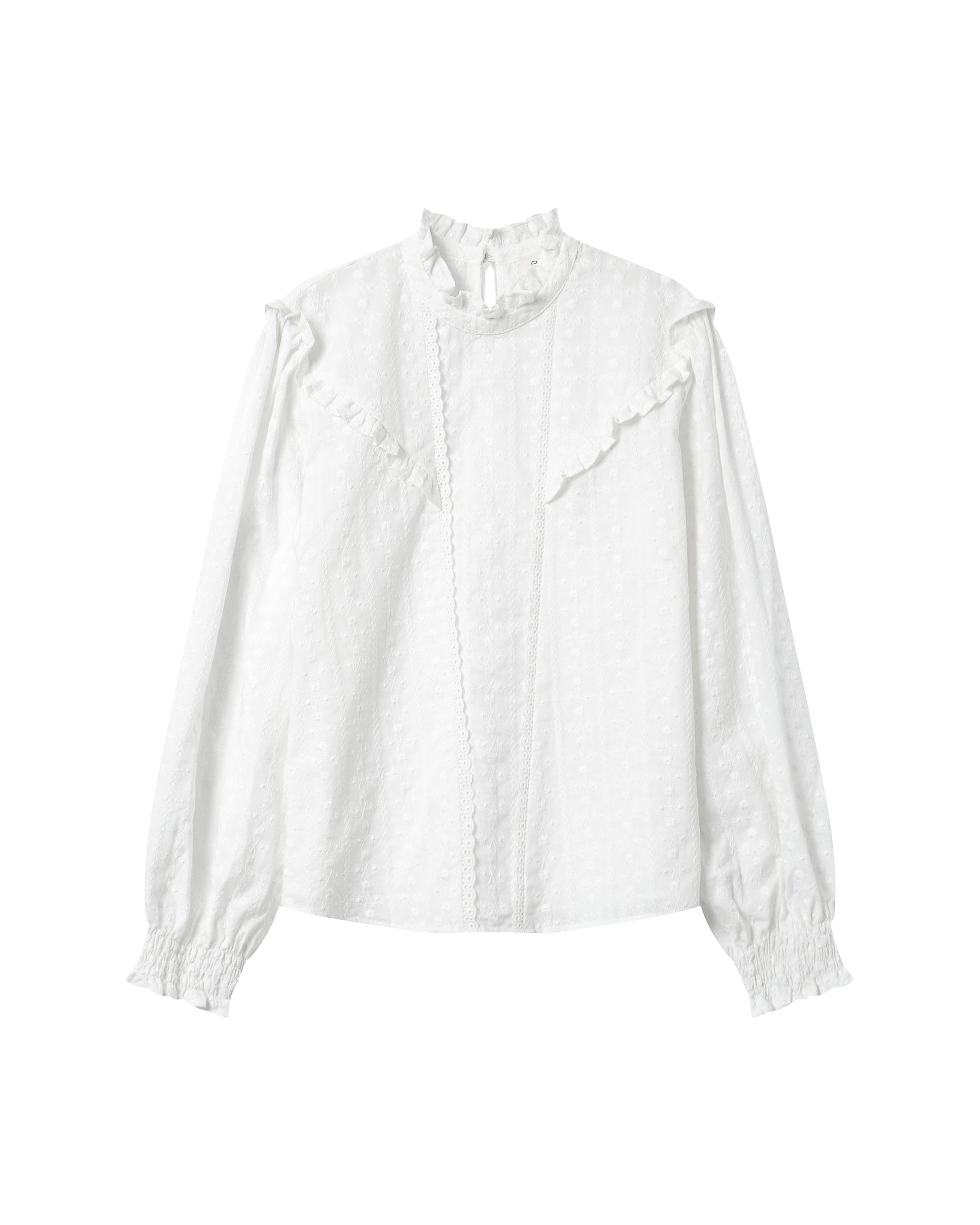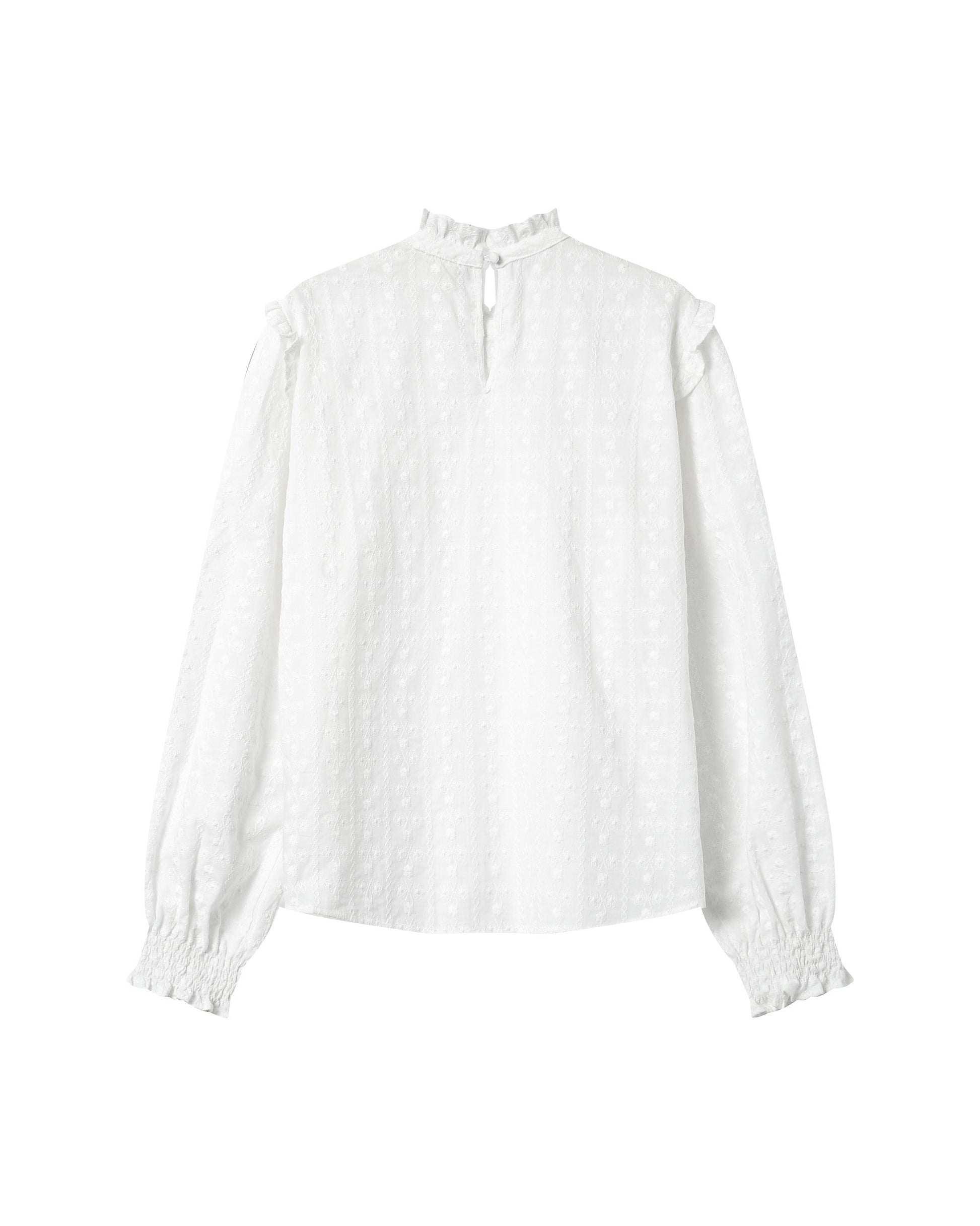 The attractive cotton blouse is a feminine and elegant piece sublimated by neat details. The steering wheel on the front and the smocked wrists draw a classic and timeless silhouette. The model is enhanced by a round neckline and a buttoned drop opening on the back.