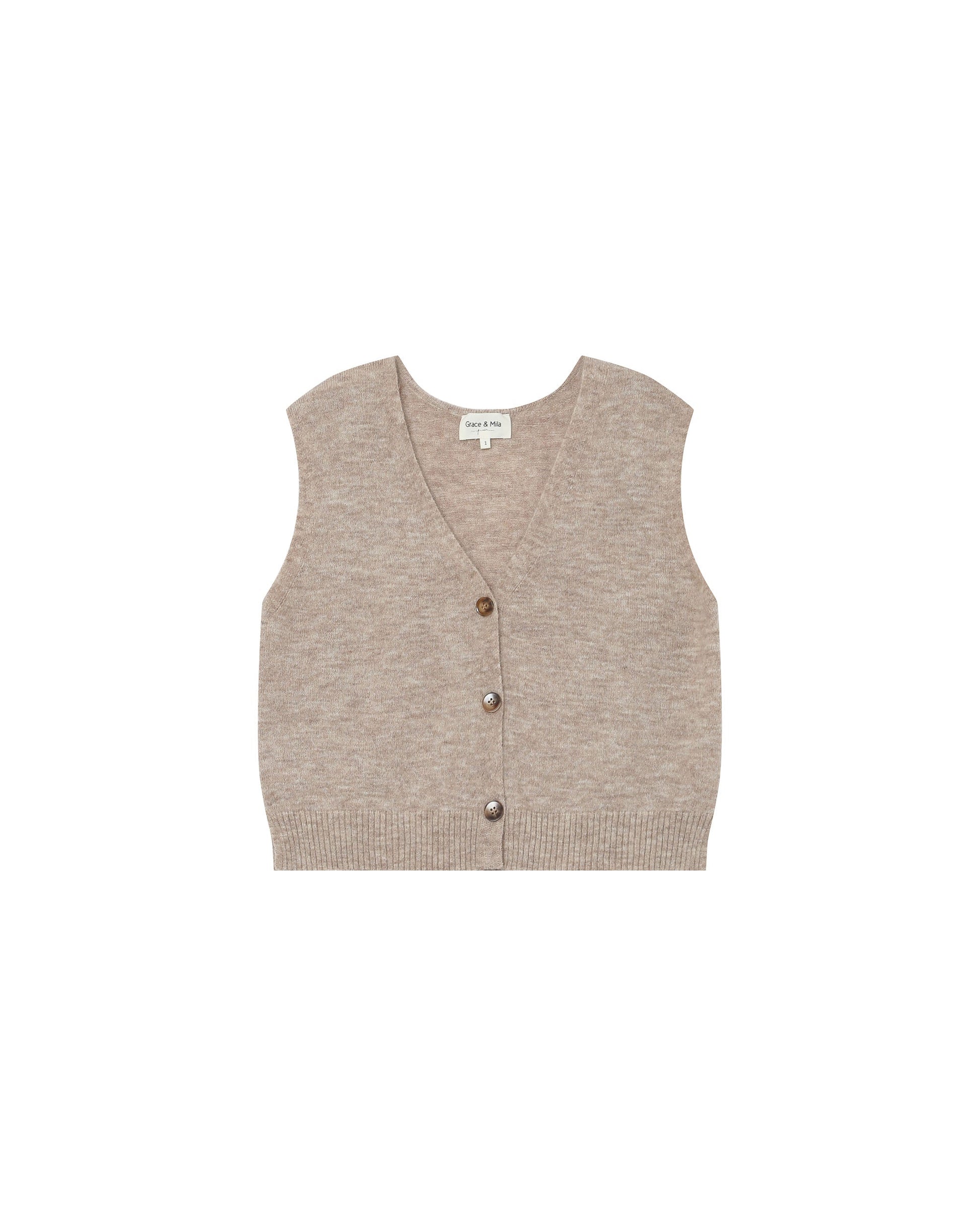 Made in a woolen and Mohair thread, the Santa sleeveless cardigan is a hot room that offers a modern and trendy look.The cardigan has neat finishes such as buttoned opening on the front and slots on the sides, which make it a worked model.The woolen cardigan and Mohair Santa is a must for the season.