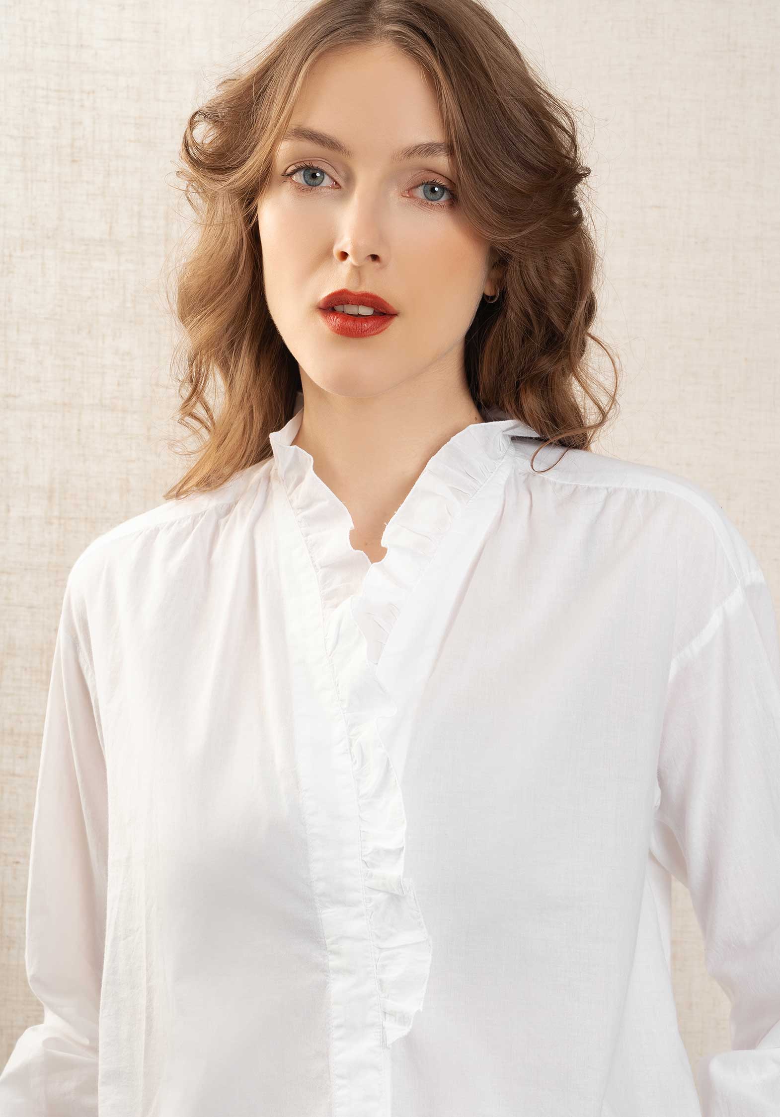 Women's long-sleeved shirt in Cotton Voile. Ruffled collar, invisible button placket with mother-of-pearl buttons. Finished with ruffled cuffs and gathered shoulder details.