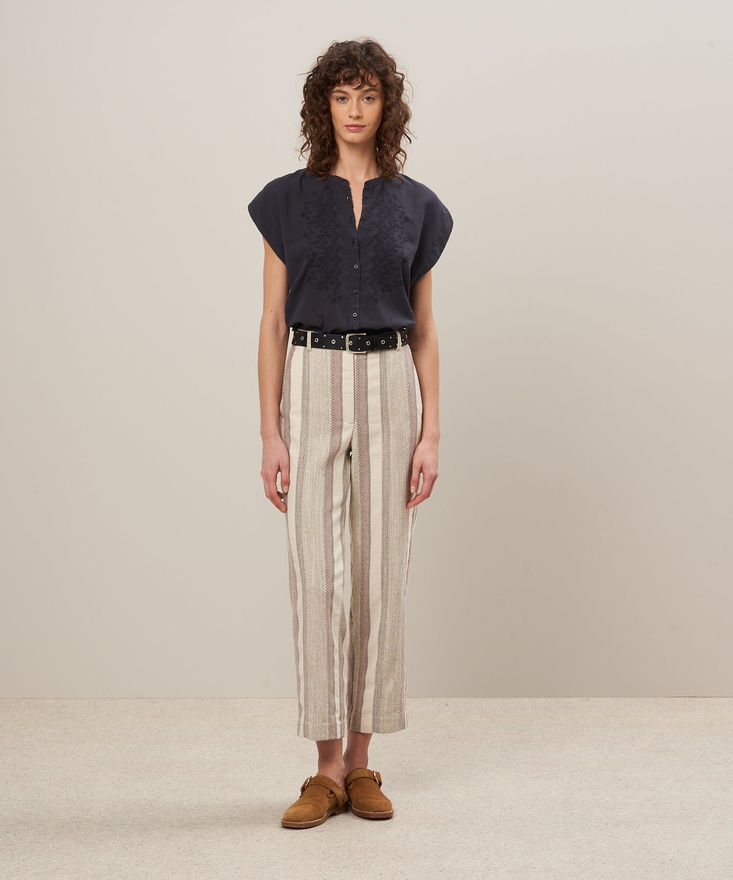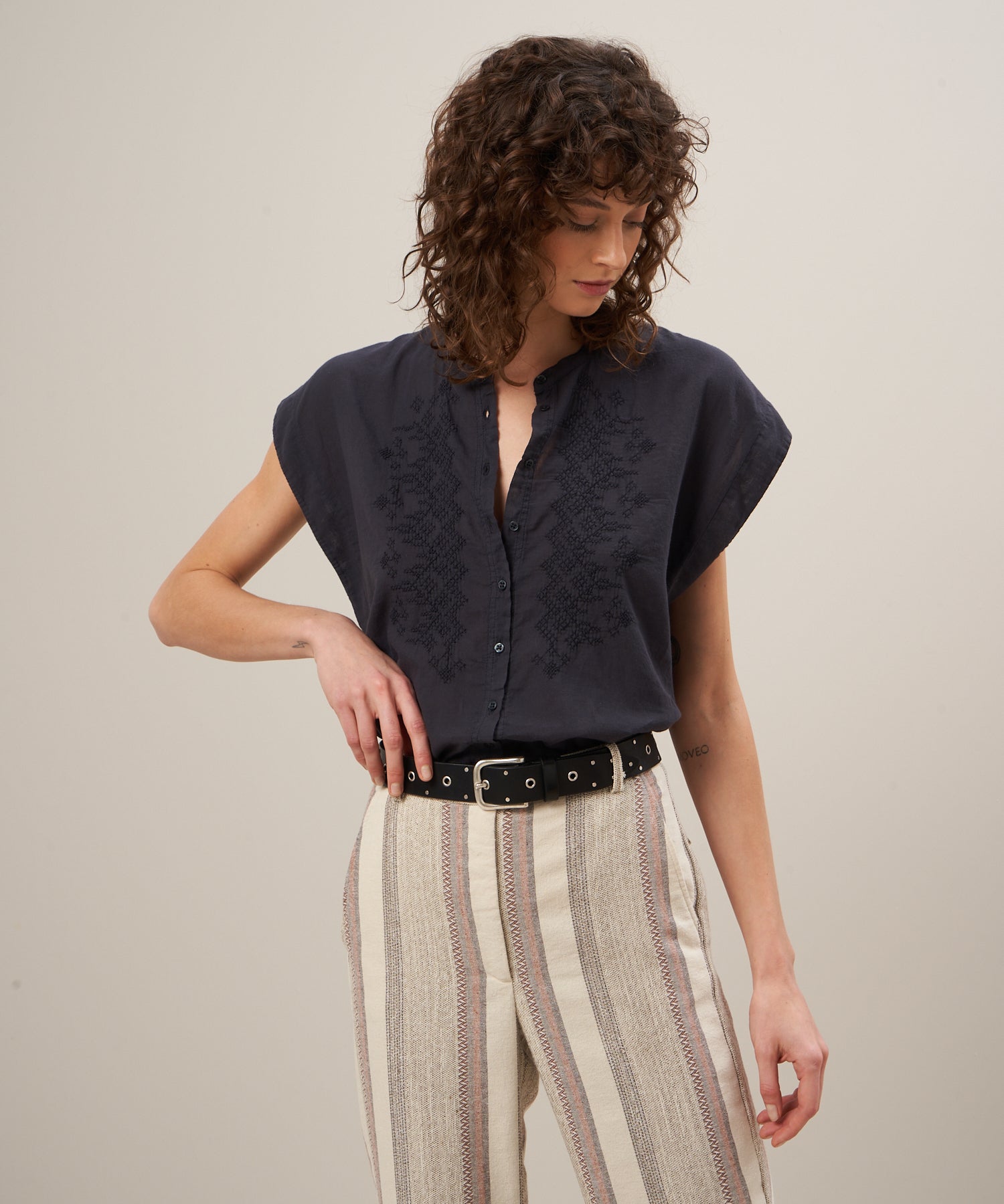 • Women's embroidered shirt "Teary" in bi-fabric cotton. Cotton gauze on the front and jersey cotton on the back. Collarless, sleeveless and visible button placket.