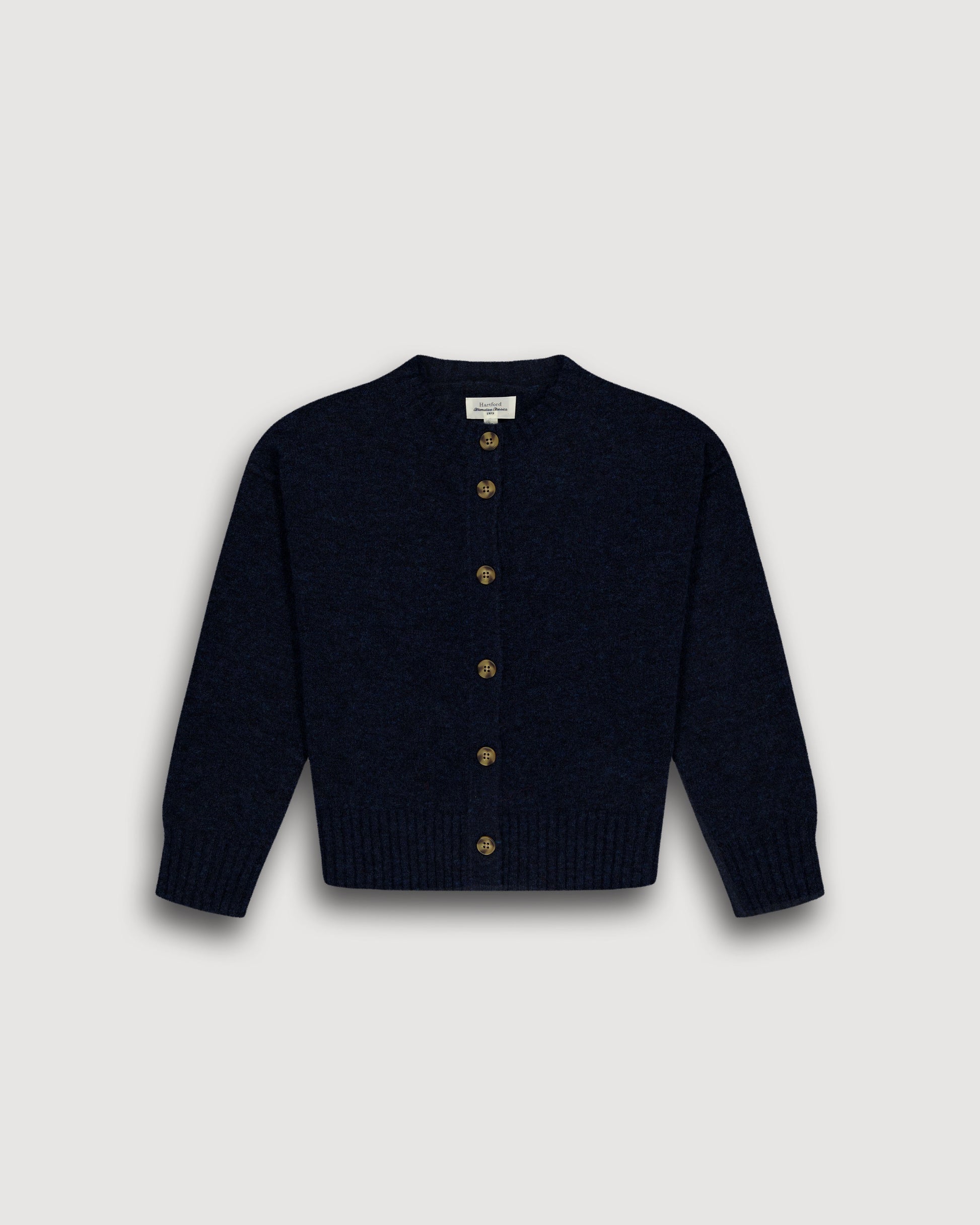 Loose-fitting women's cardigan with round collar and long sleeves. Six-button placket. Dropped armholes with exposed seam detail and center back seam. Ribbed edges.