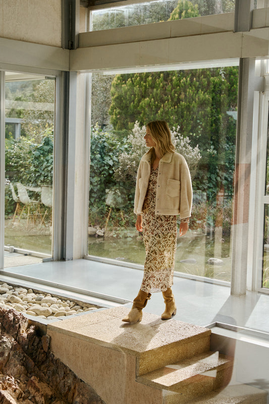 Super soft jacket with fur fabric, dropped shoulders and slightly puffed sleeves. It has a snap closure in the front and a half- placket closure in the back, so you can wear it loose and give a different touch to your look.