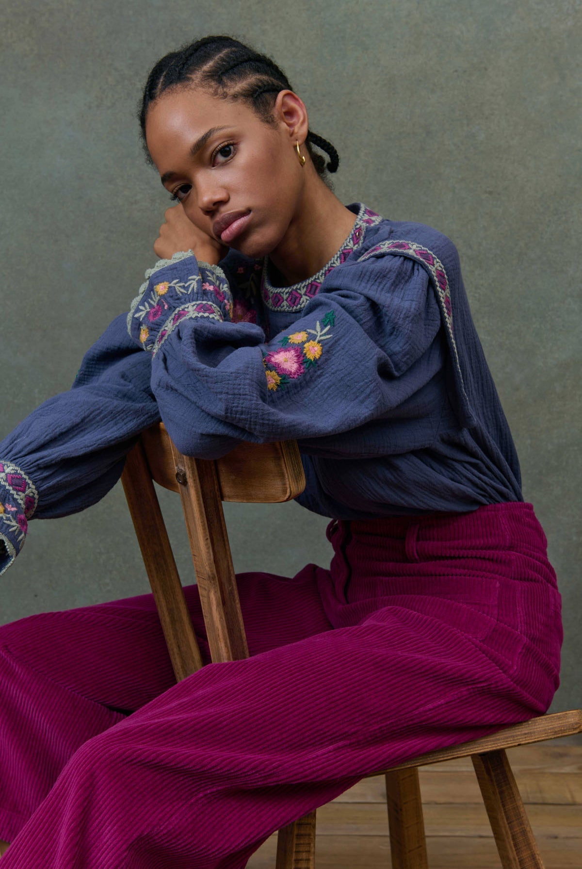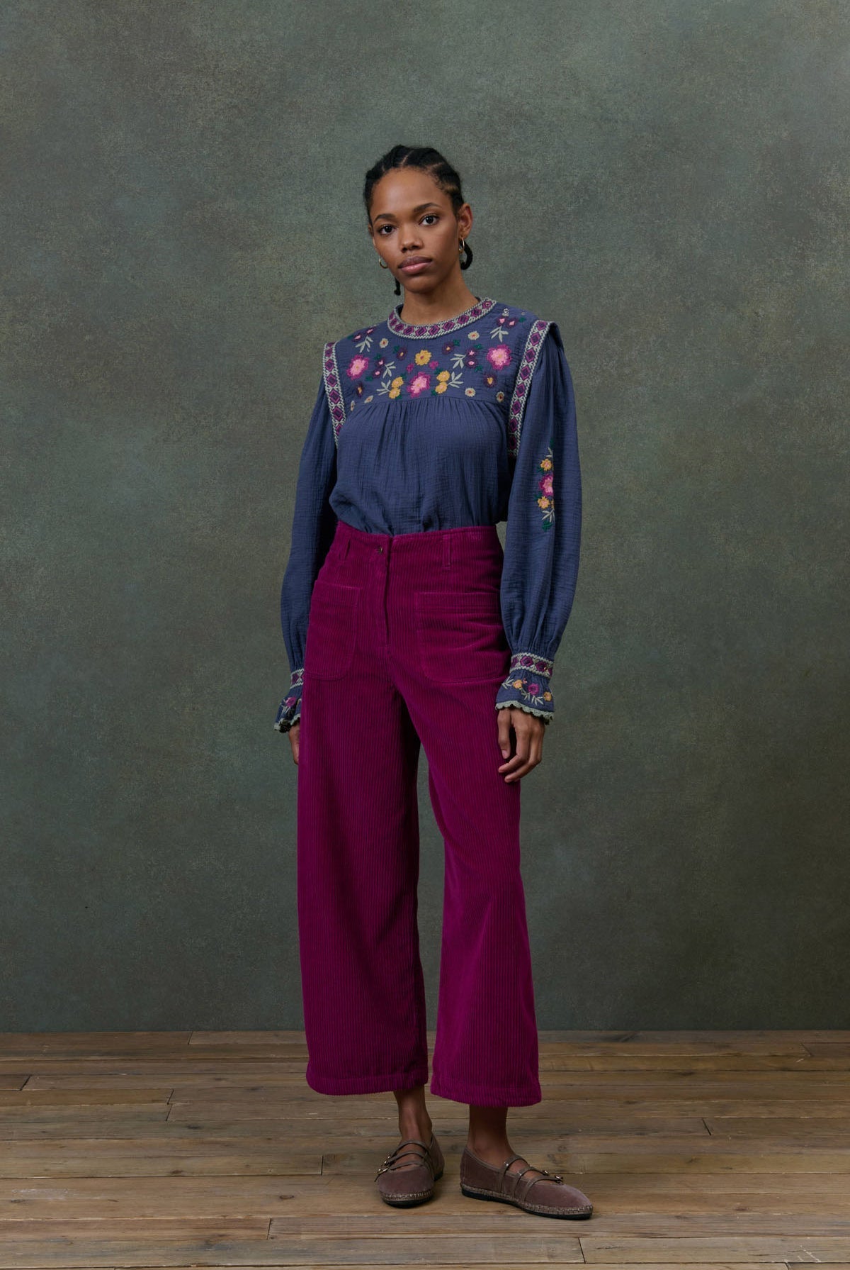 Embroidered ruffled cuffs with snap button and lace trimming.