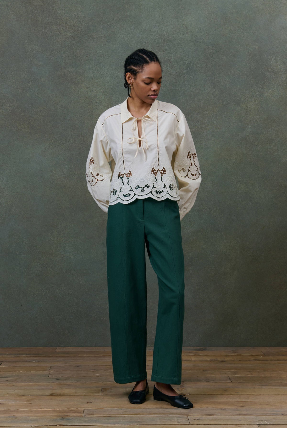 Hand-embroidered openwork details at bottom hem and on the sleeves.