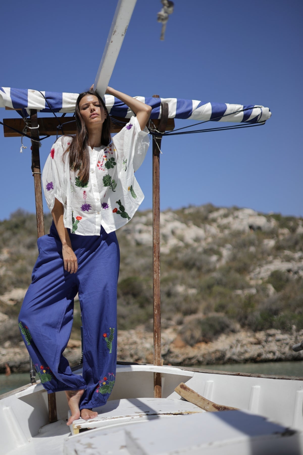 Summer blouse in white cotton.A contrast that provides an artisanal roque contributes for its cactus embroidery.With round neck, short manga and front opening with buttons.Without adjusting.This blouse combines style and comfort.With this garment you will get a relaxed and feminine look with an irresistible bohemian air!