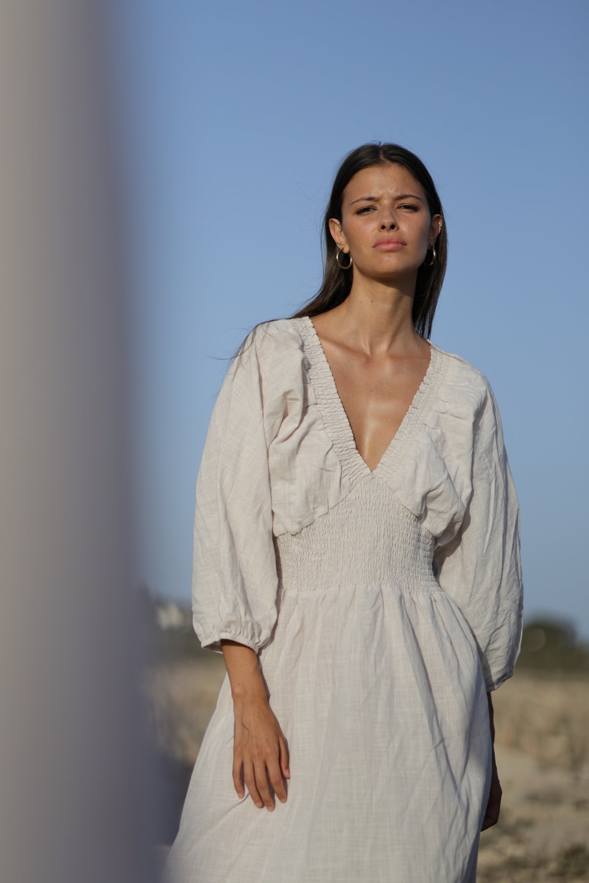 The Edith dress in a solid colour fabric is ideal for a casual look! With a midi cut, it has a flattering V-neckline with gathering that extends to the waist, creating a slim and feminine silhouette. The free-falling skirt provides fluidity and movement, while the long, wide sleeves, finished with a delicate gathering, add a bohemian and elegant touch. Follow your usual size. It is available in two colours: blue and acqua! Choose the shade that best suits your style!