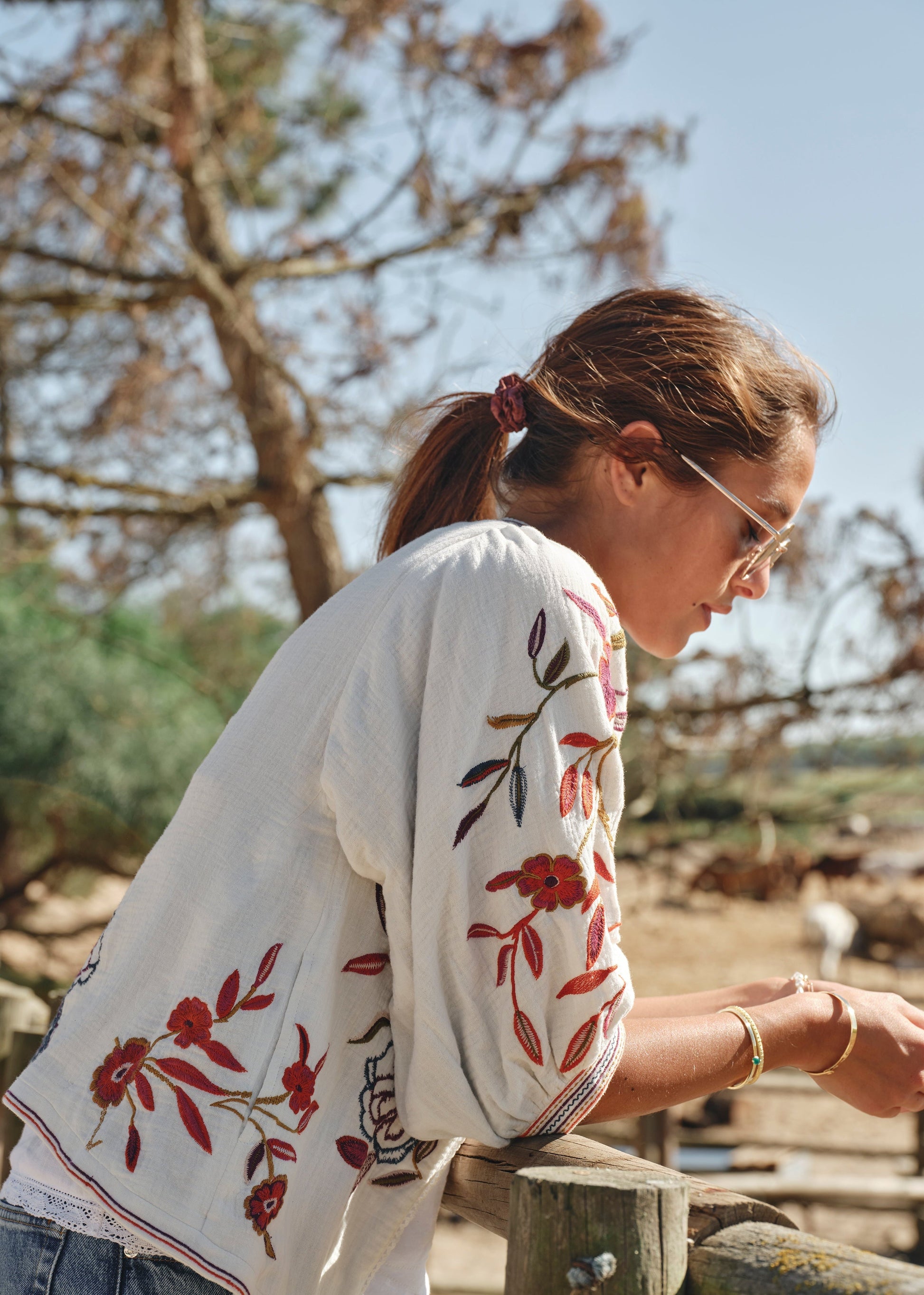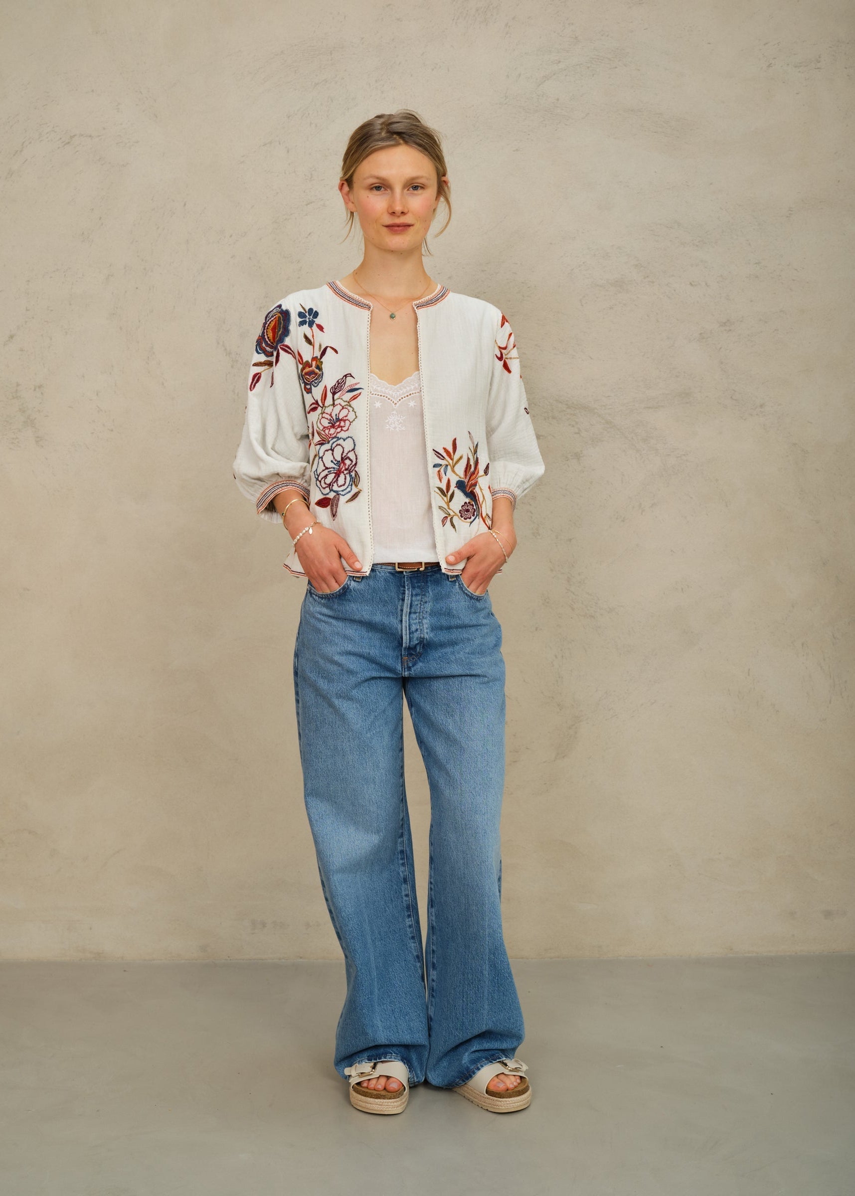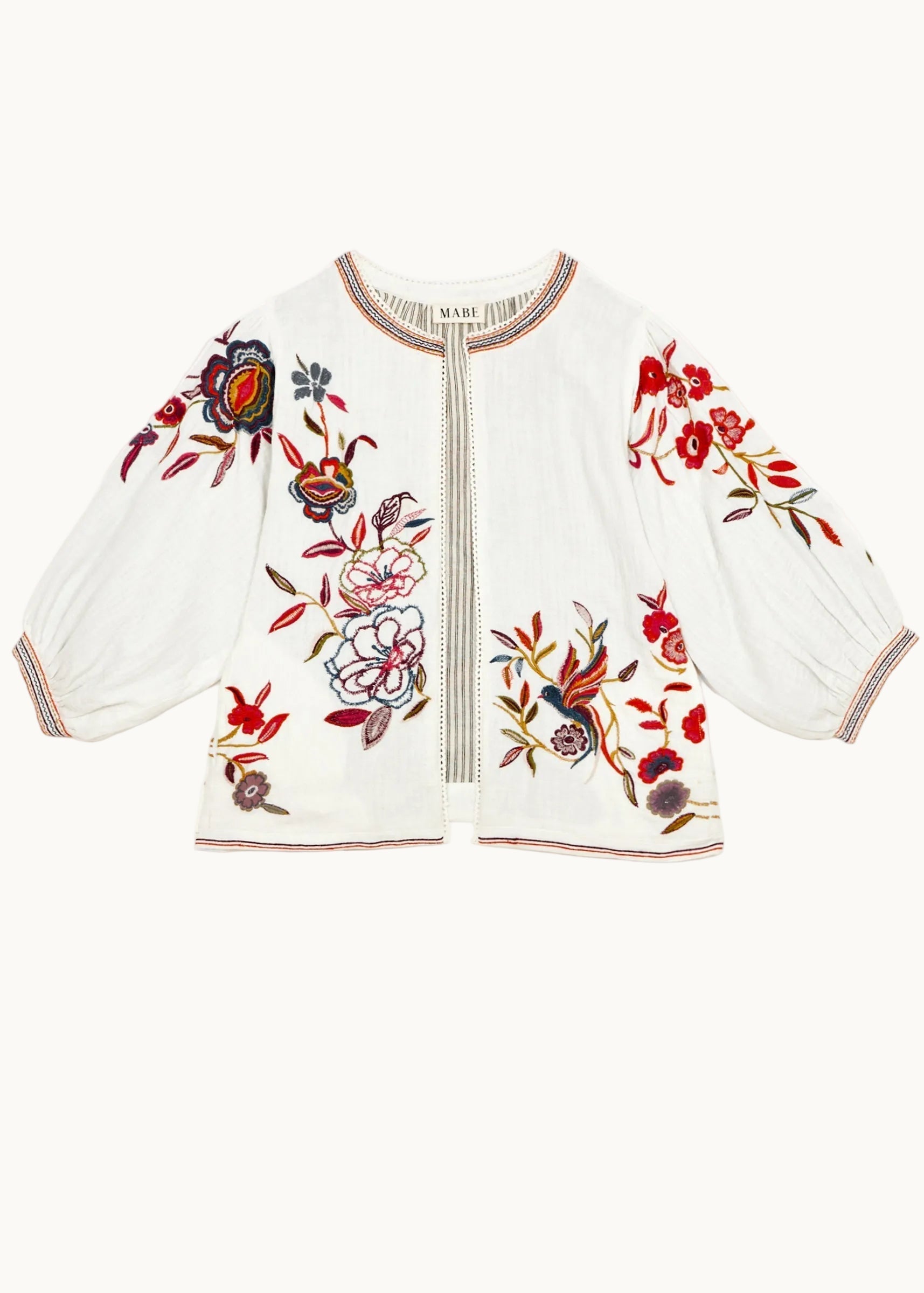 Description Designed with floral and bird patterned embroidery the Orly jacket is made from a mid weight textured cotton and lined with a woven pin stripe. The free and easy fit makes it effortless to wear. Details - Floral embroidery detail- Double gauze cotton body- Striped woven cotton lining- Gathered 3/4 sleeves-