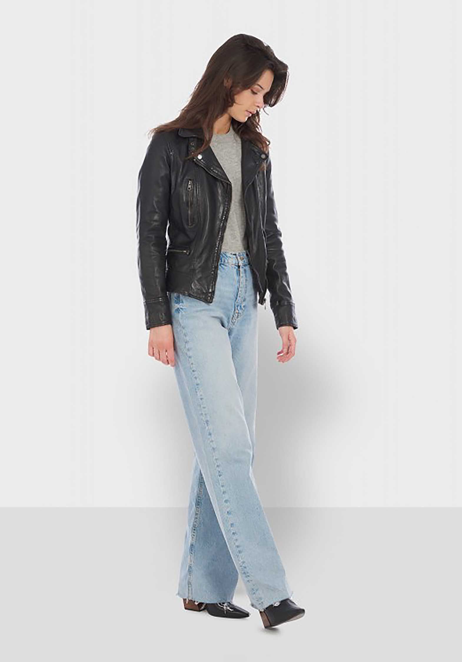 This genuine sheep leather jacket with washed effect has an extraordinary power: to sublimate you in the blink of an eye and to offer you a style that will take your breath away! Slim fit, asymmetrical zipper, fastening belt at the collar, decorative press buttons, chest zipped pocket, horizontal zipped pockets, thightening plackets on the sides, inside zipped pockets, blended cotton lining.