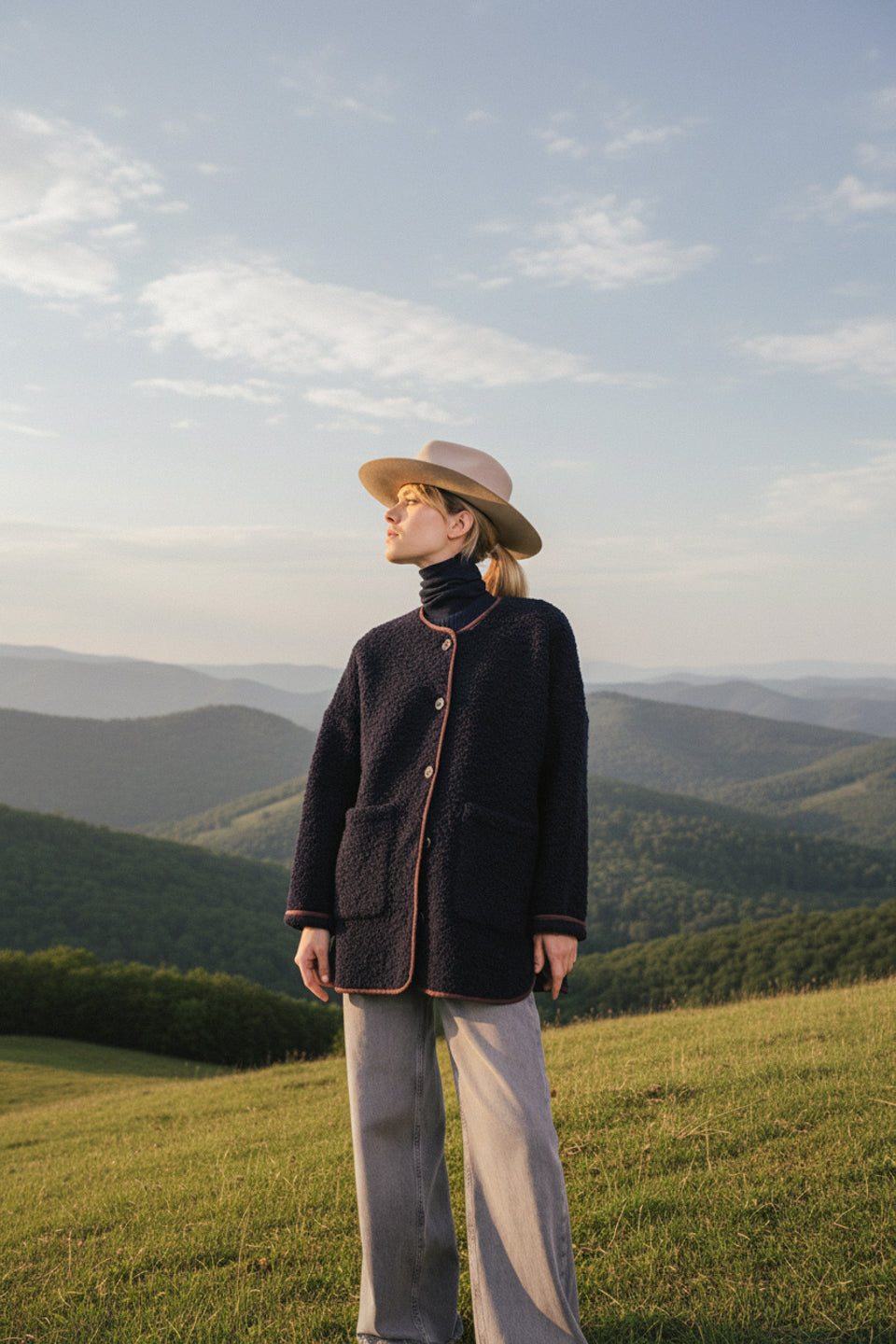 Mid-length jacket, in navy loop wool, doubled in front and back, bass plug, two pocket pocket in front.Apparent buttons, oversized cut, without col.Woven in Italy.Striped contrasting bias.