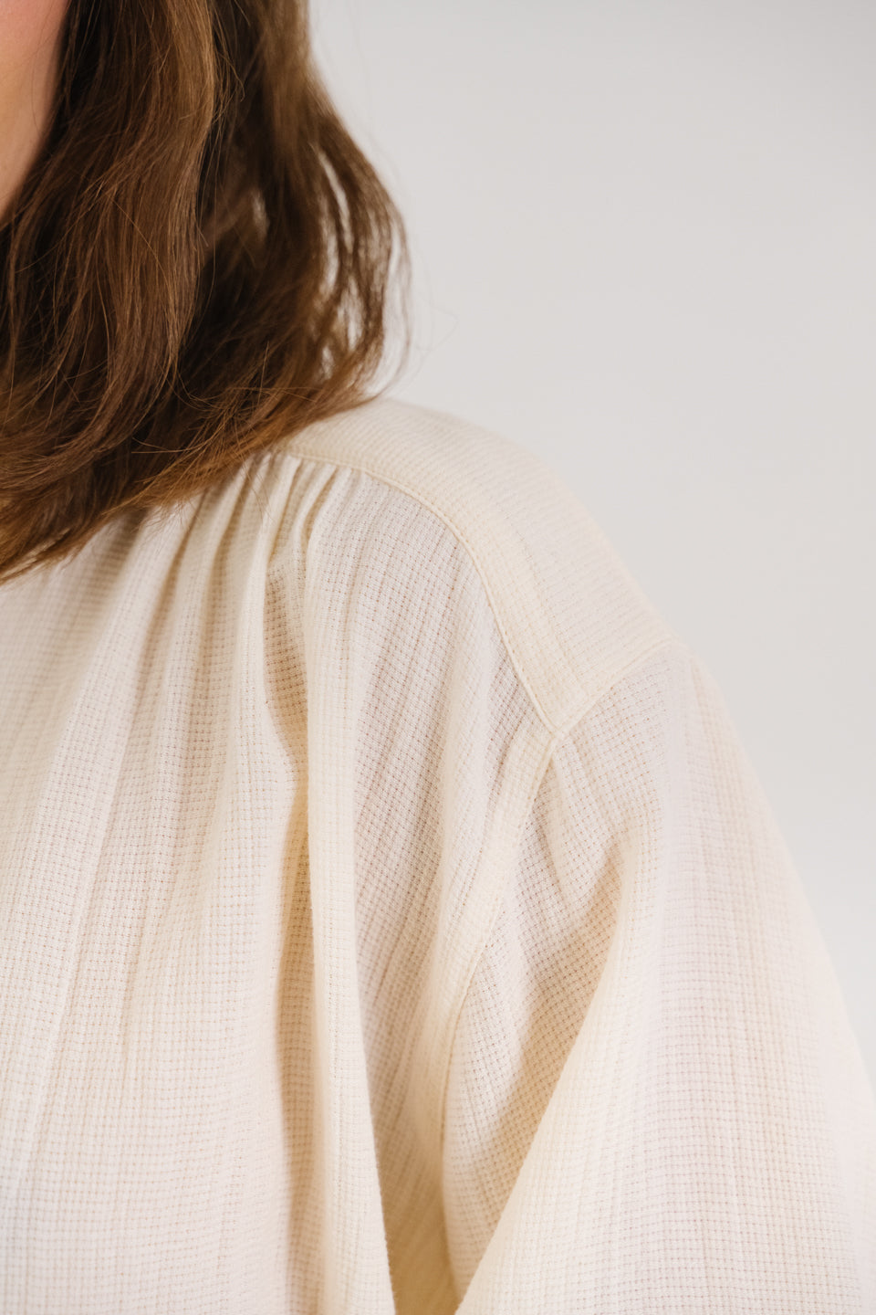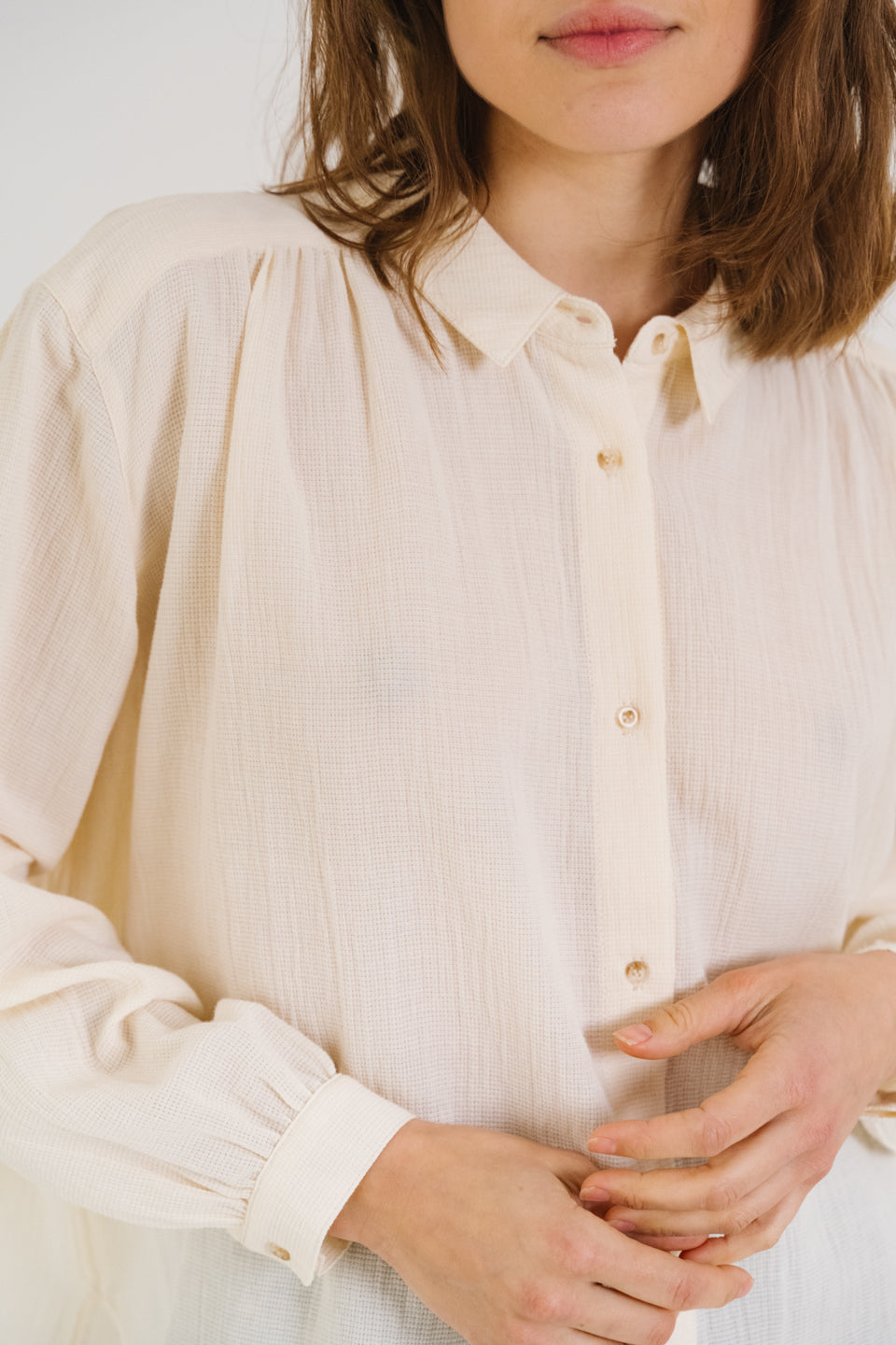 Long -sleeved female blouse, textured ecru, made of cotton.The cut is ample.On the detail side we find a classic shirt collar as well as chips to the shoulders and at the bottom of the sleeves.