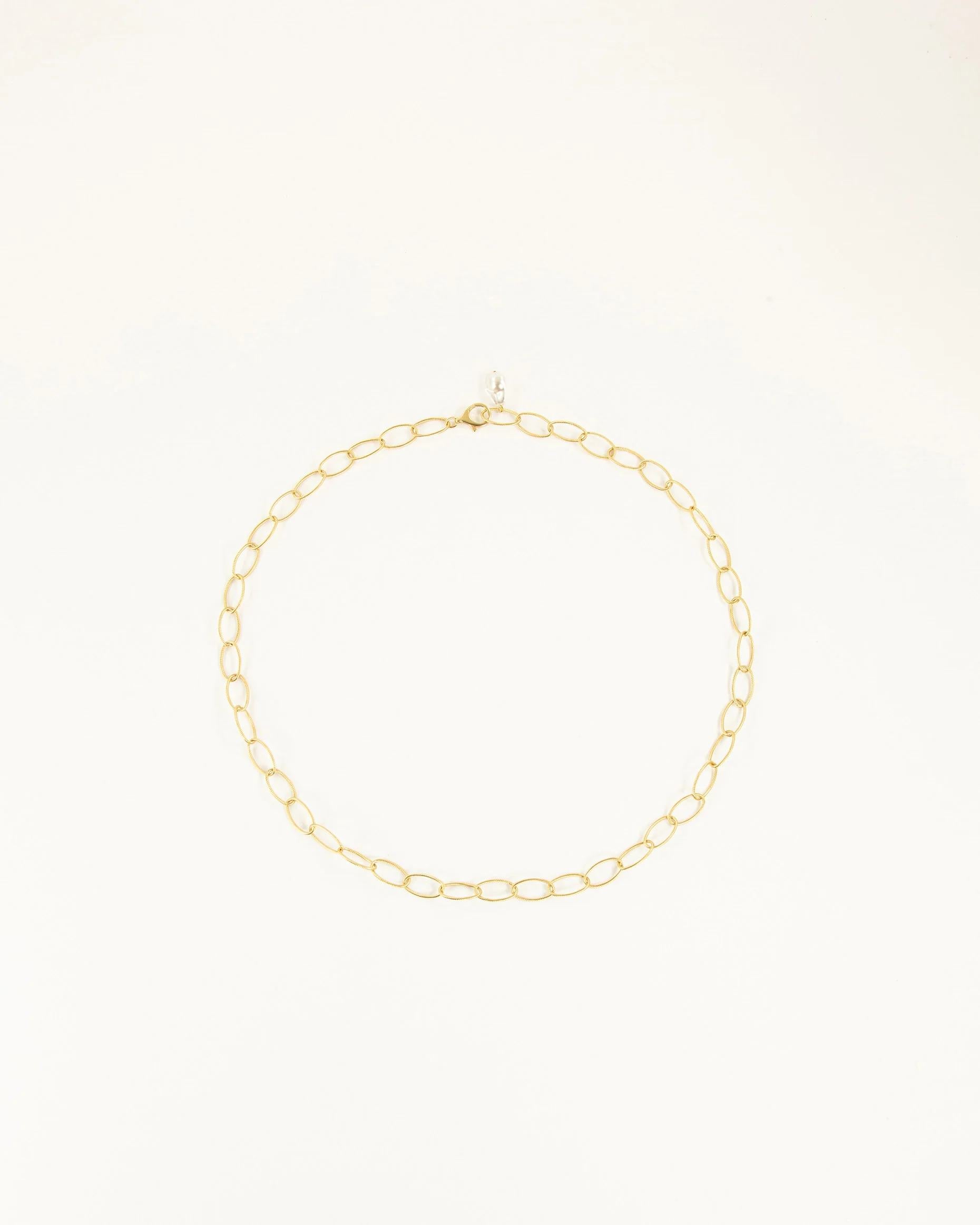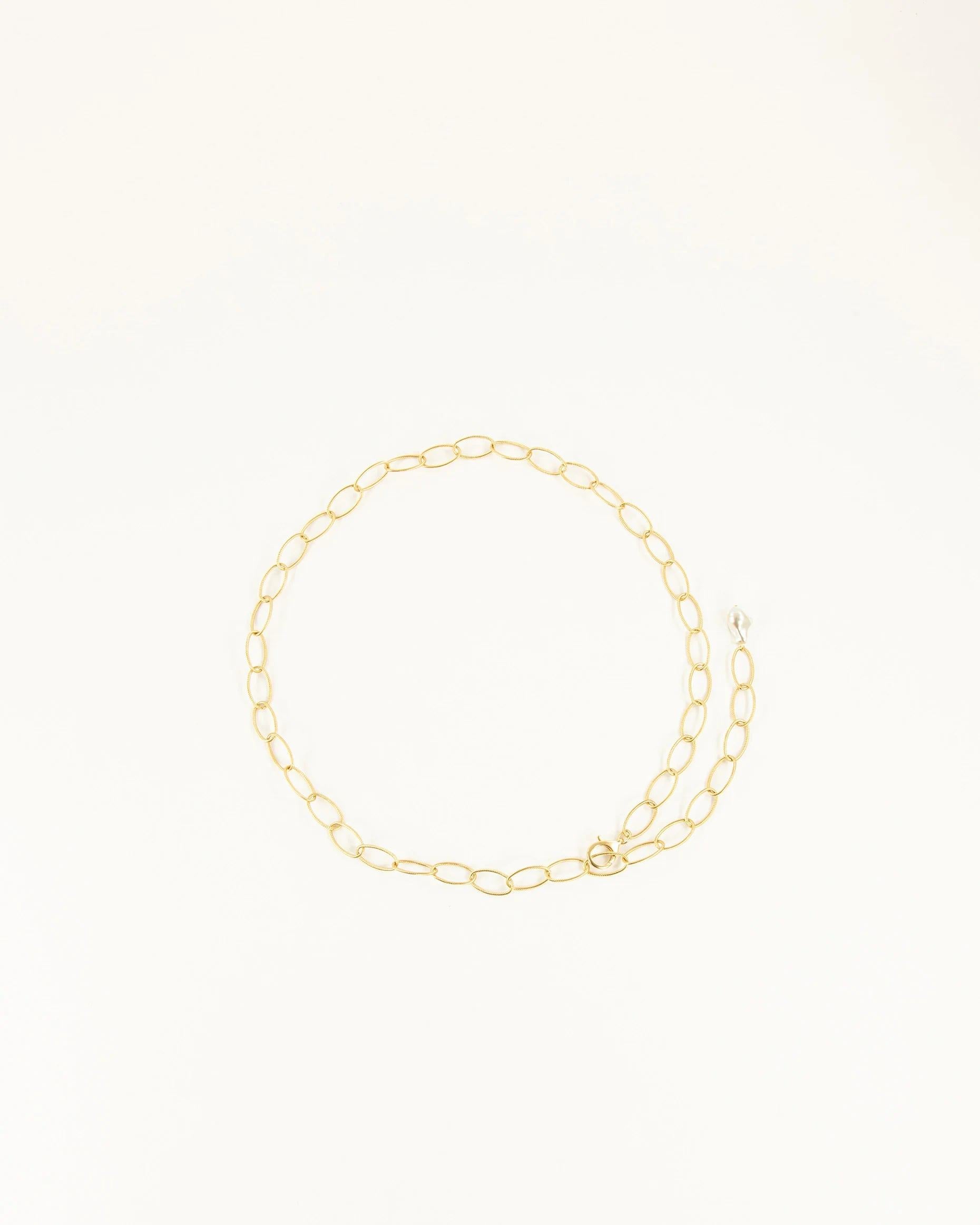 Chain belt with freshwater pearl and Diviluz decorative metal part. Closes with a snap hook.