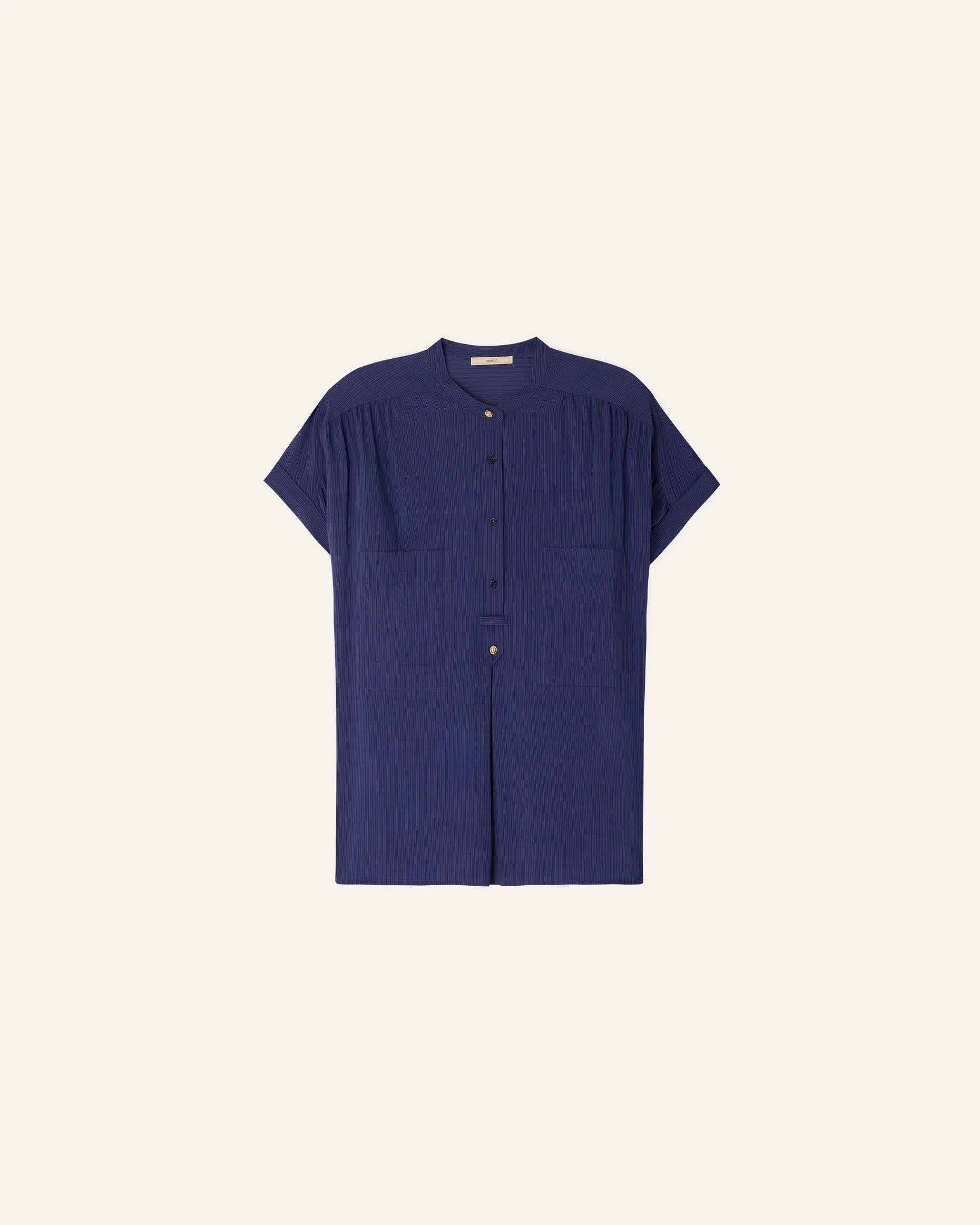 Sleeveless blouse with a polo placket in a compact voile fabric with fine fancy jacquard stripes.