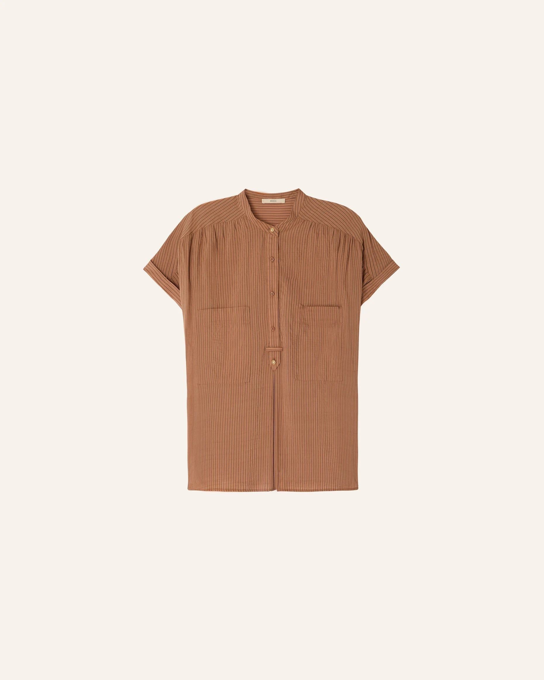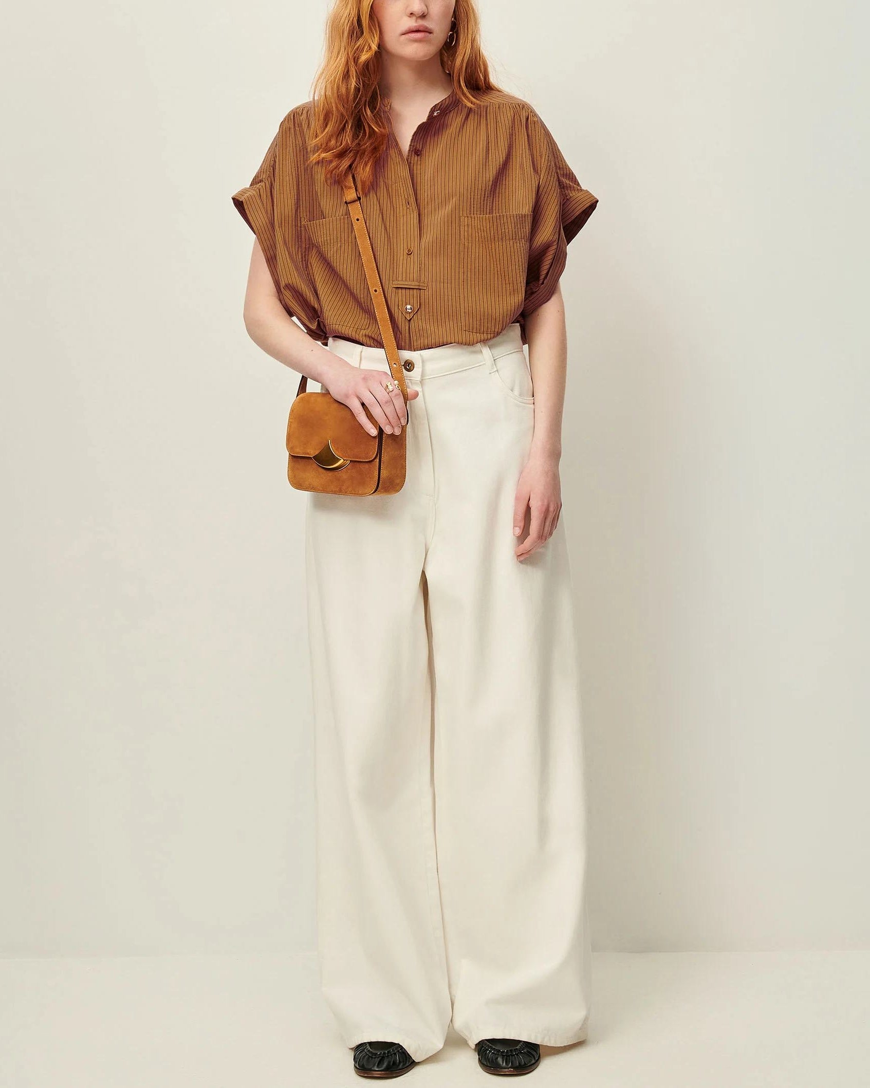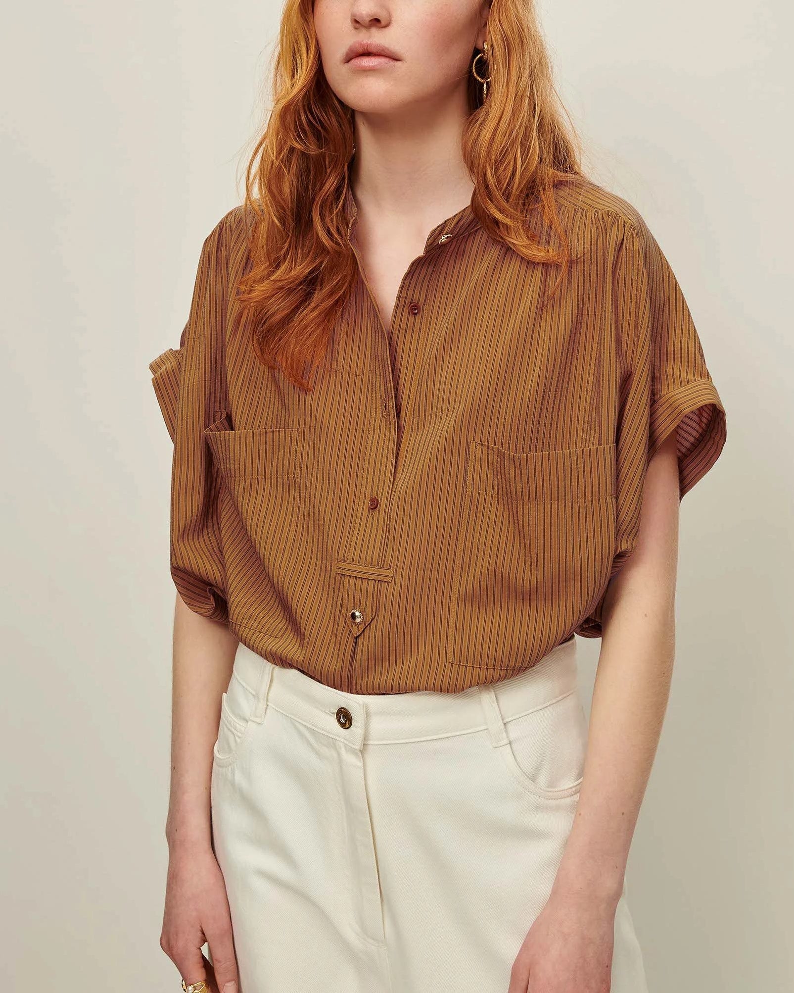 This blouse is cut for an easy, streamlined silhouette that layers beautifully. It runs true to standard women’s sizes. For a roomier fit through the bust or shoulders, consider sizing up. Please refer to the size chart for precise bust, waist, and length measurements to ensure the right fit.