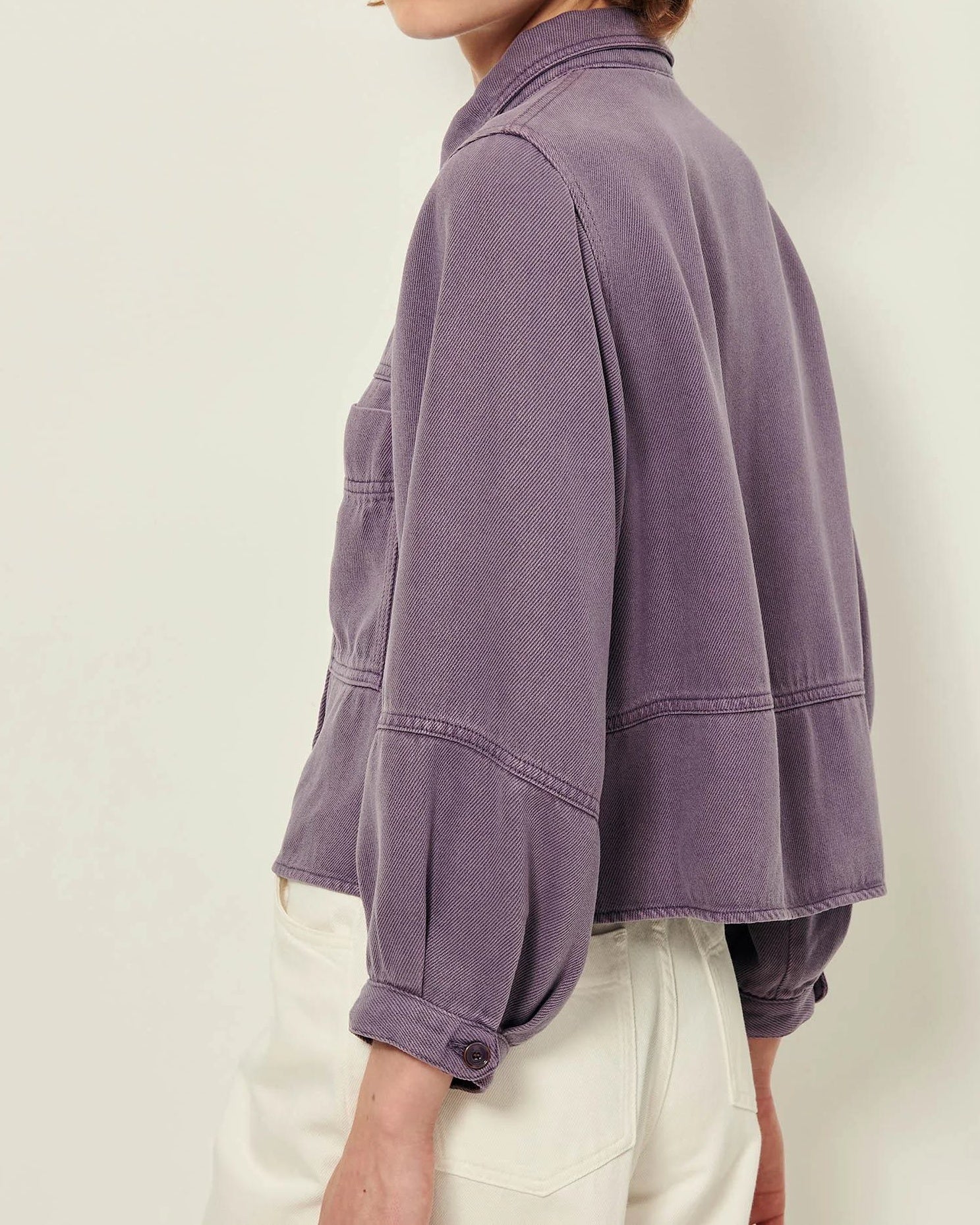 The oversized balloon sleeves lend a graceful volume, while the stonewashed light denim wash adds a lived-in ease that pairs equally with a crisp blouse or a simple tee. With contrasted top-stitches that catch the eye, this overshirt becomes a versatile layering piece you reach for when mornings turn cool or office temperatures dip.