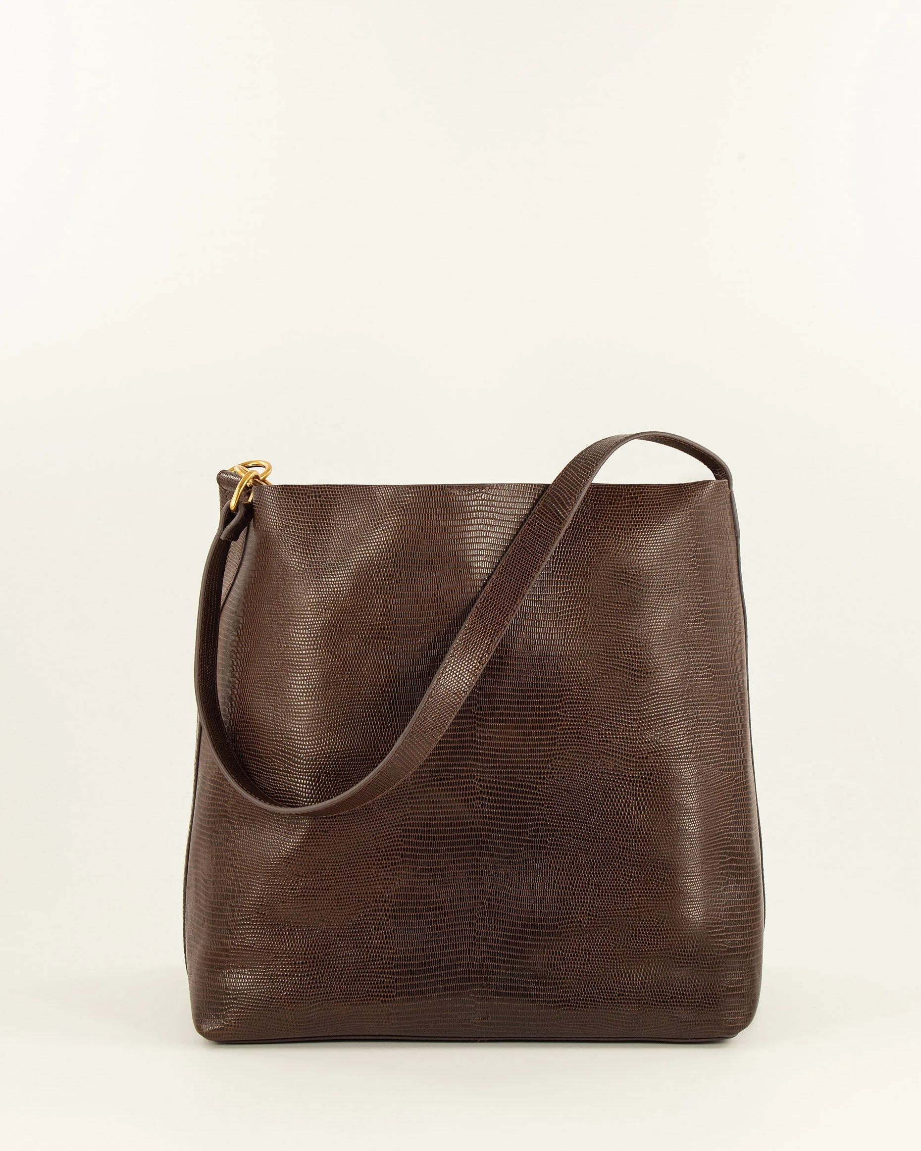 Large tote bag in lizard-print cow leather with suede goatskin lining. Detachable zipped pocket.