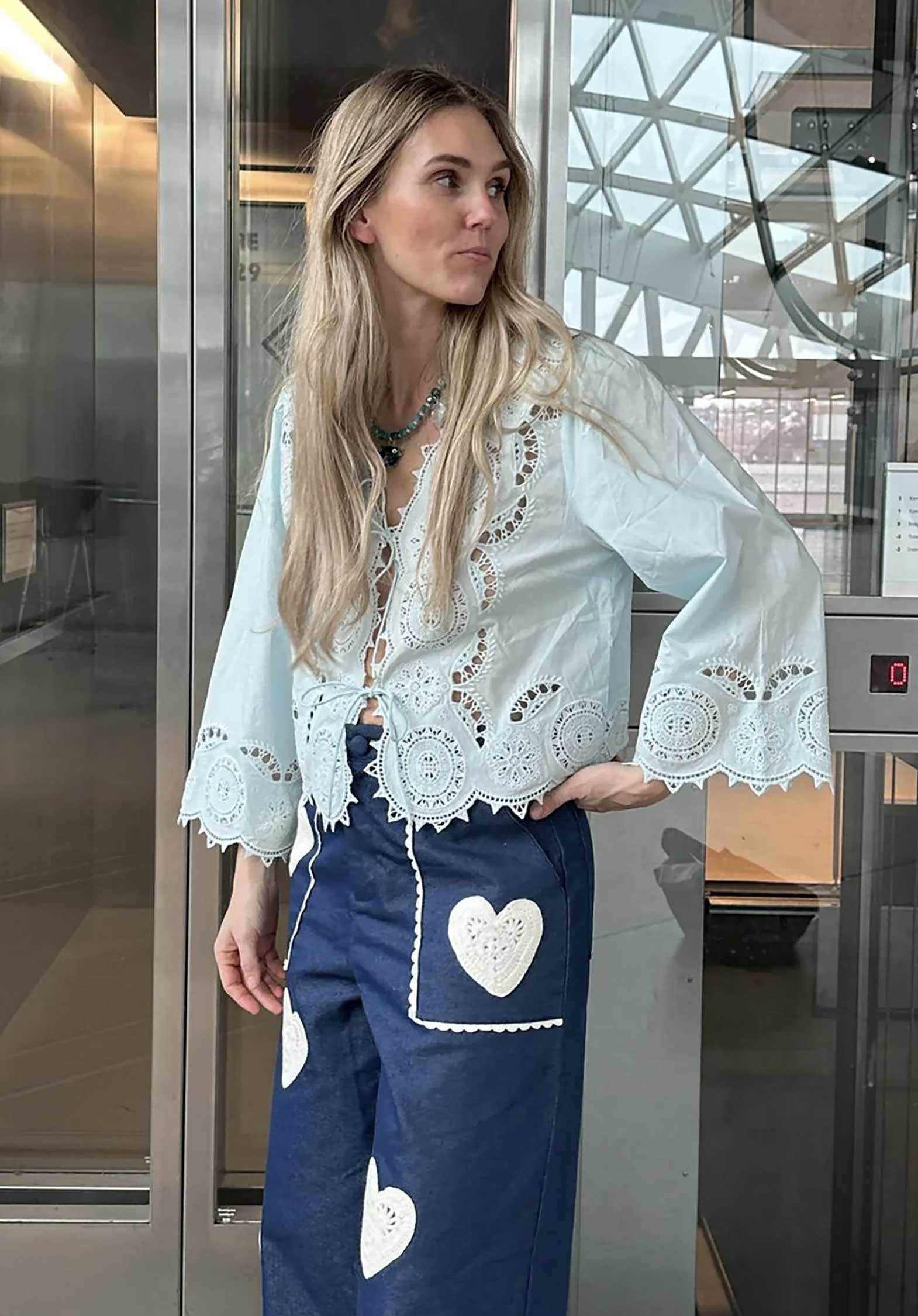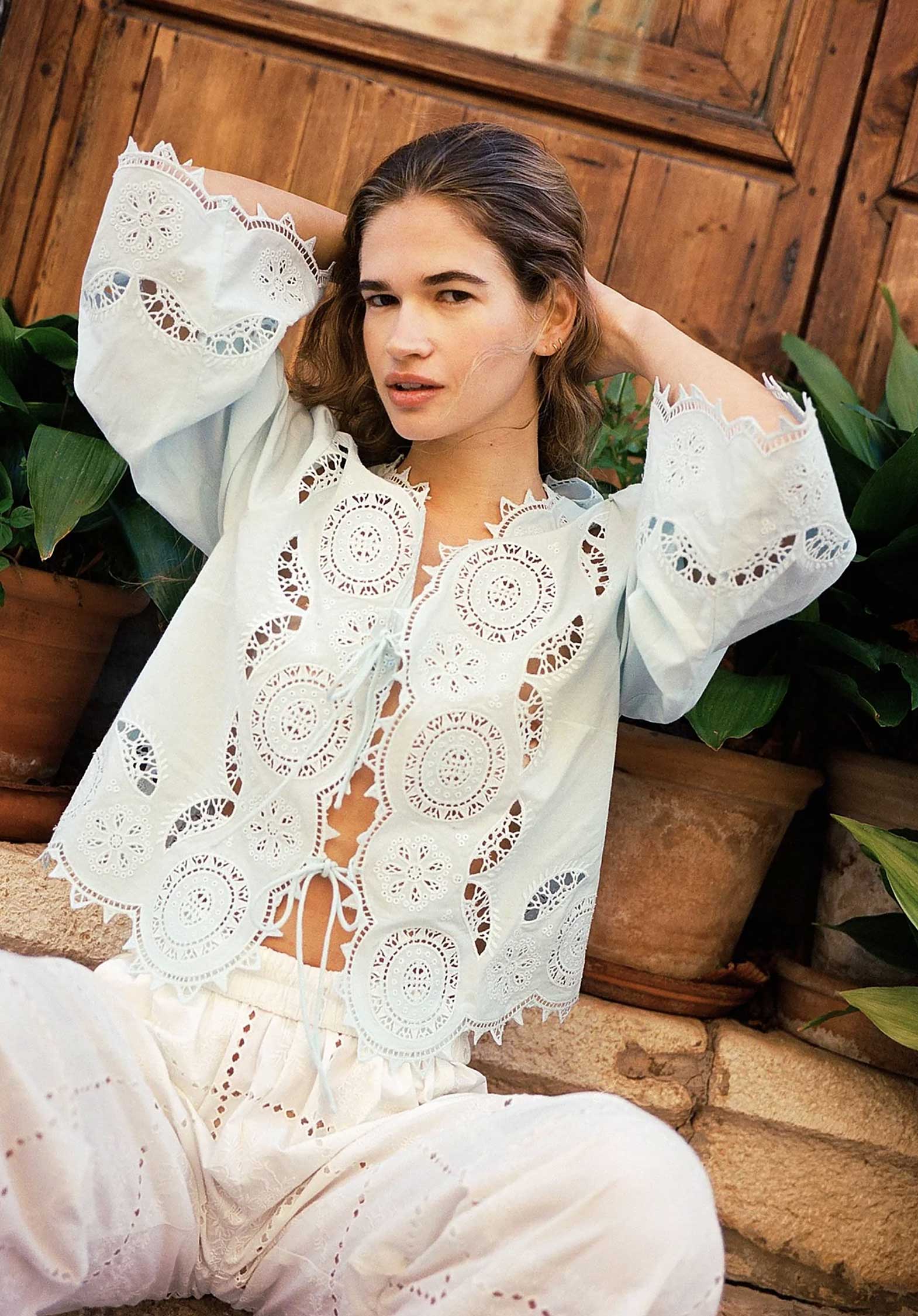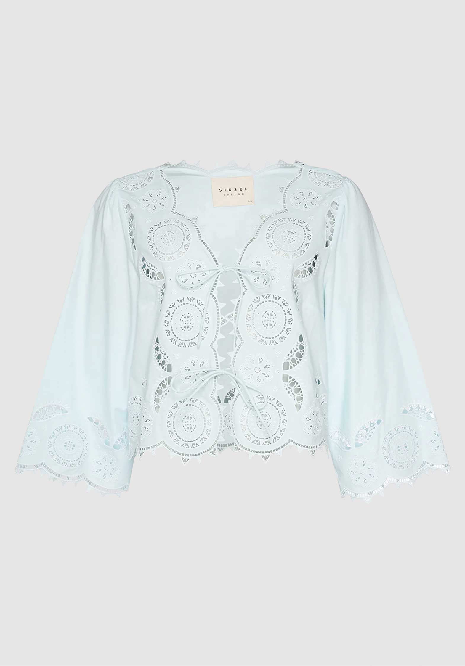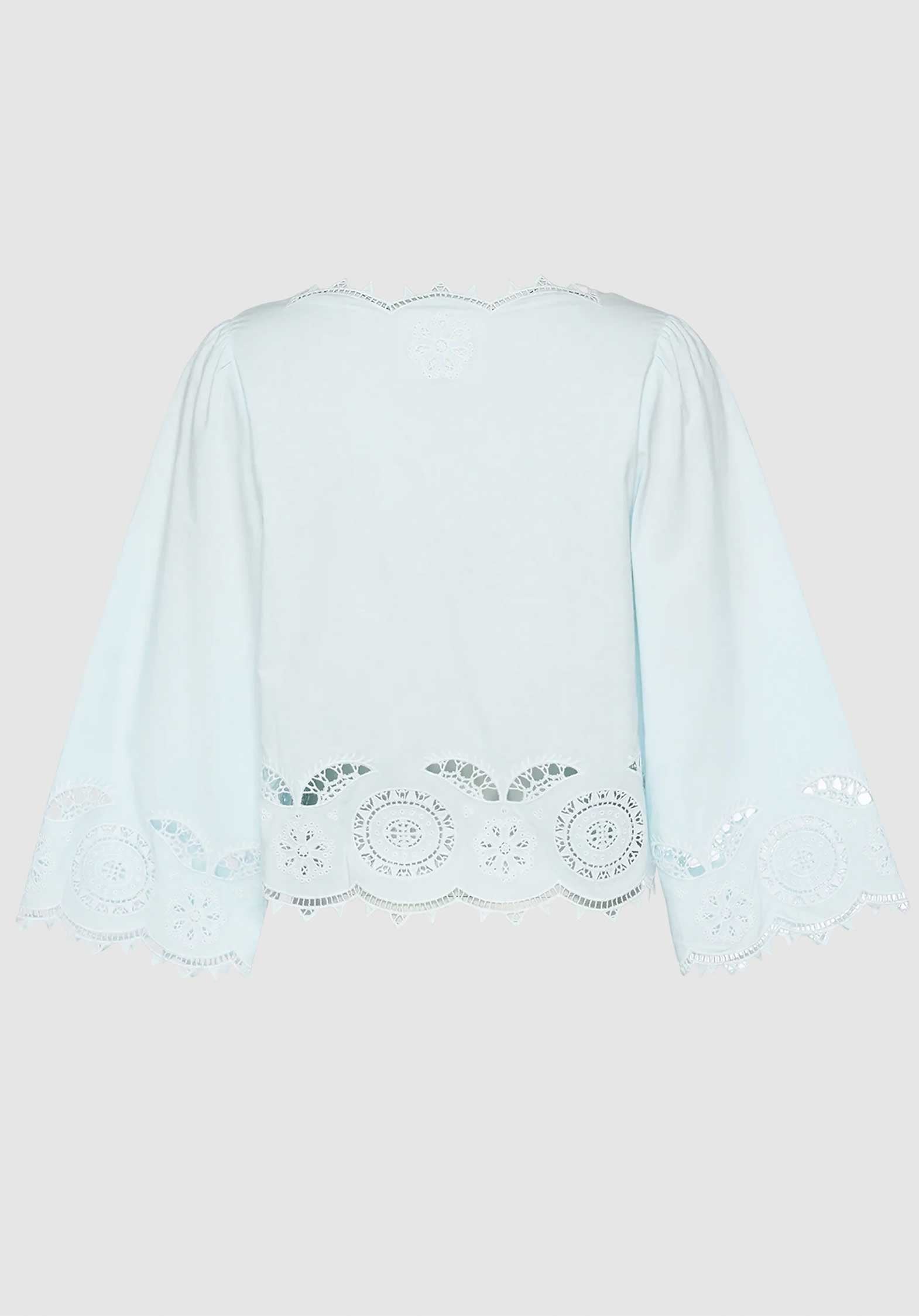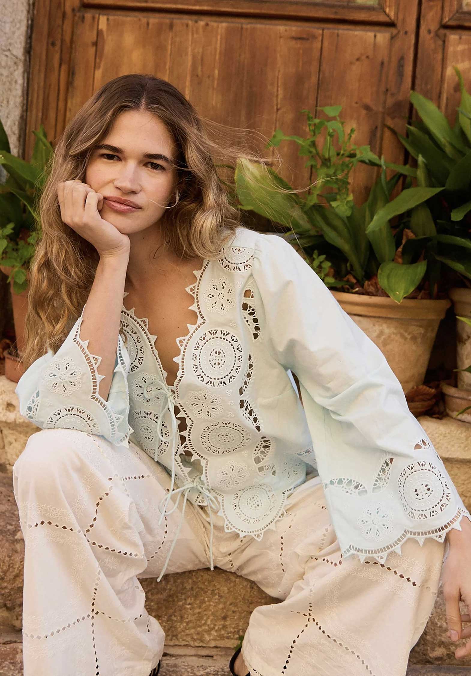 Anjali Top is a feminine top made in 100% organic cotton poplin. The sleeves have a straight shape with a flared opening. The top has a V-neckline and can be tied with two sets of round tie strings at the front. A beautiful abundance of vintage-inspired cutwork embroidery decorates the top, and all edges are scalloped and adorned with the same detailed embroidery.