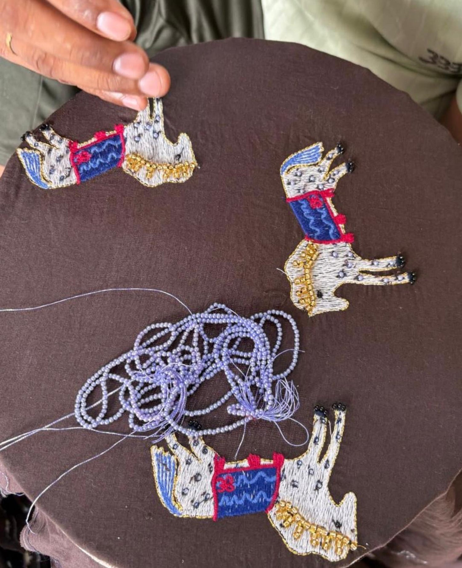 Emmy Top is a feminine top made from 100% organic cotton. It features long, straight sleeves and an O-neckline. The front placket is adorned with frog buttons made of golden metallic thread. The top has two front pockets decorated with golden metallic ribbon, and it is embellished with a cute, magical universe consisting of flowers, hearts, and horses, created with beads, embroidery, and sequins. The shirt is lined with organic cotton featuring a dot print.