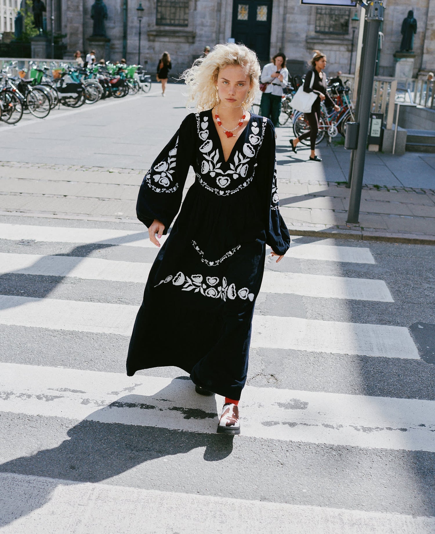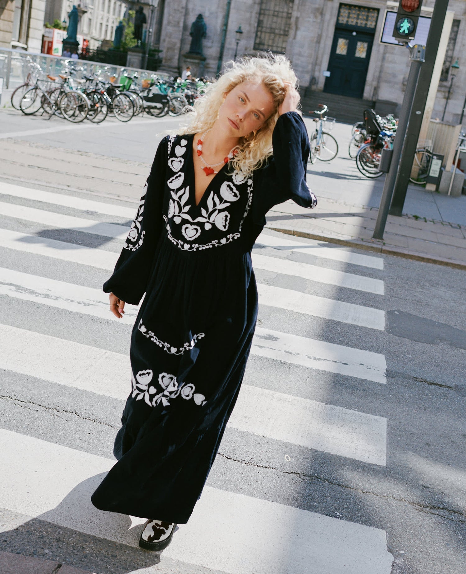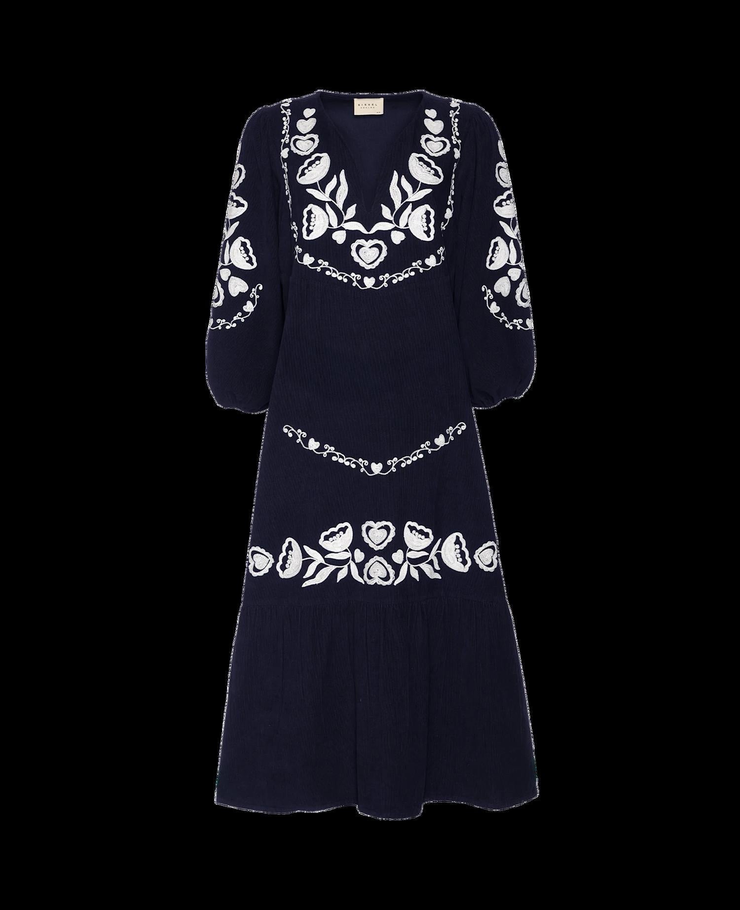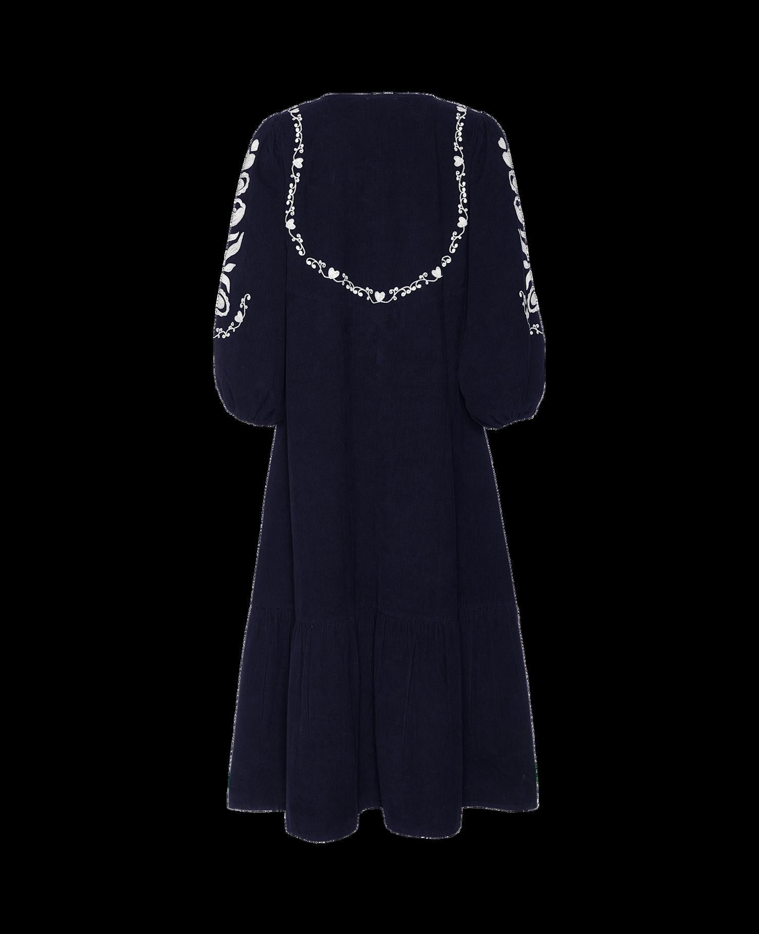 Kamma Dress is a long dress with a loose, feminine fit made from leftover cotton baby corduroy. It has balloon-shaped sleeves with elastic tape at the sleeve cuffs, creating a small frill. The dress features gathered cutlines, one placed below the chest and one below the knees. The V-neckline is finished with facing on the inside. It is beautifully adorned with mirrored, romantic artwork made of embroidery, inspired by a dreamy kaleidoscope, in a contrasting color. The dress comes with a belt.