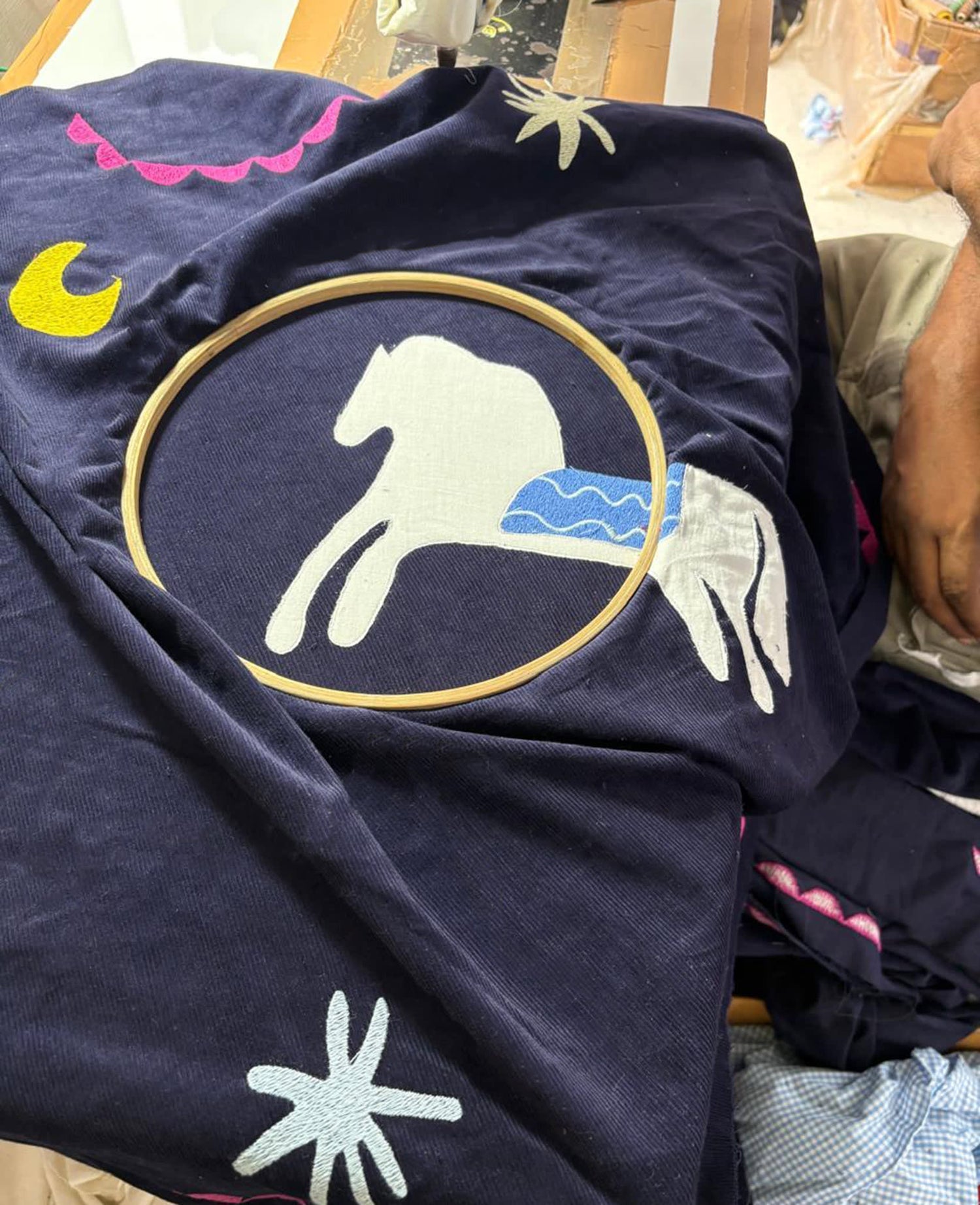 This Suzani embroidered item is decorated with the manually controlled chain stitch technique of Suzani embroidery. Our Suzani embroidery is made by Indian artisans, mostly using the tambour to create a unique and vivid Suzani embroidery pattern. The name Suzani comes from the Persian word "su-zan", meaning needle. The Indian artisans use a hooked needle instrument called a tambour to create the intricate chain stitching that is the hallmark of Suzani embroidery. Due to the manually controlled nature of Suzani embroidery, you may notice little variations from one garment to another that add to the unique charm of a Suzani decorated item.