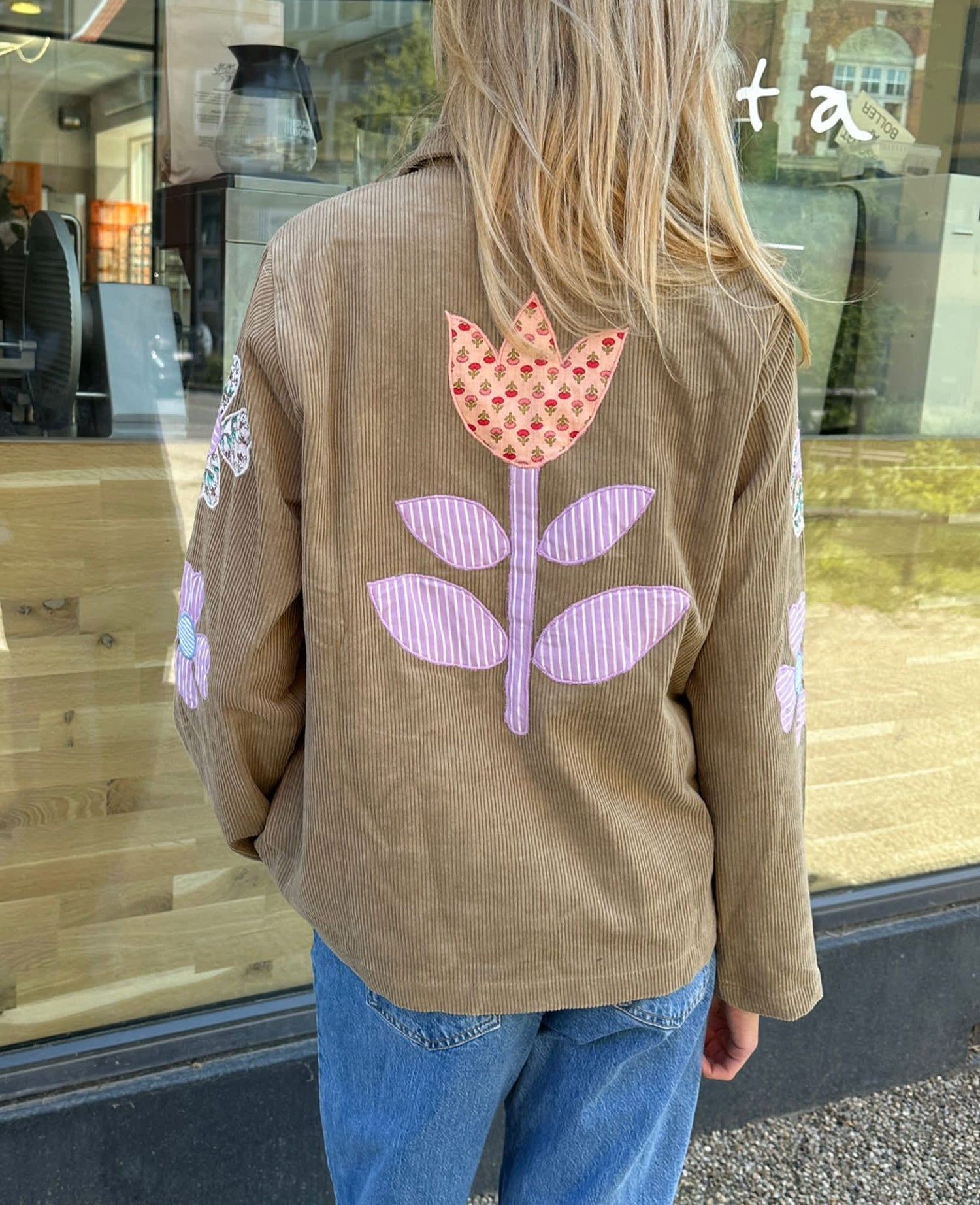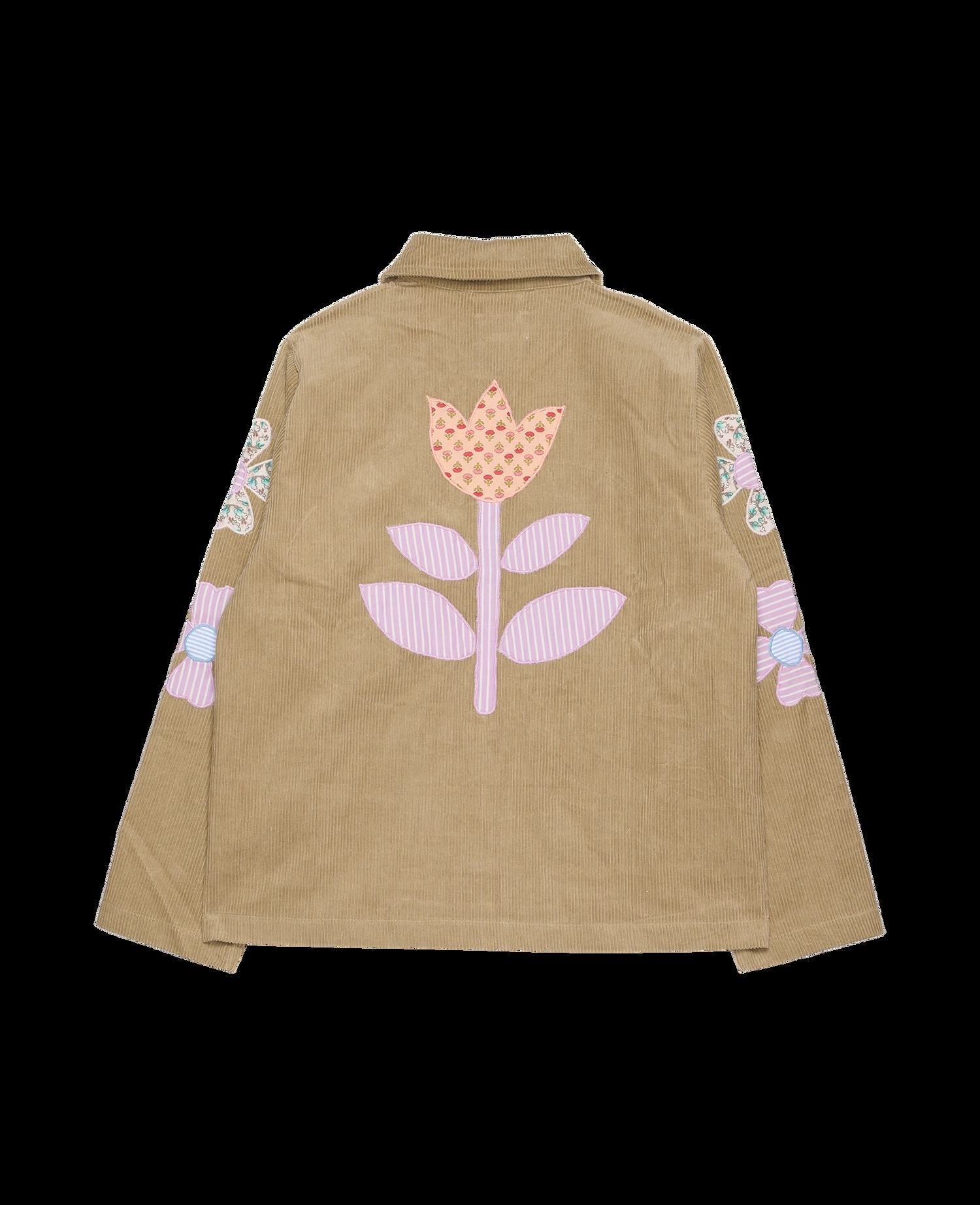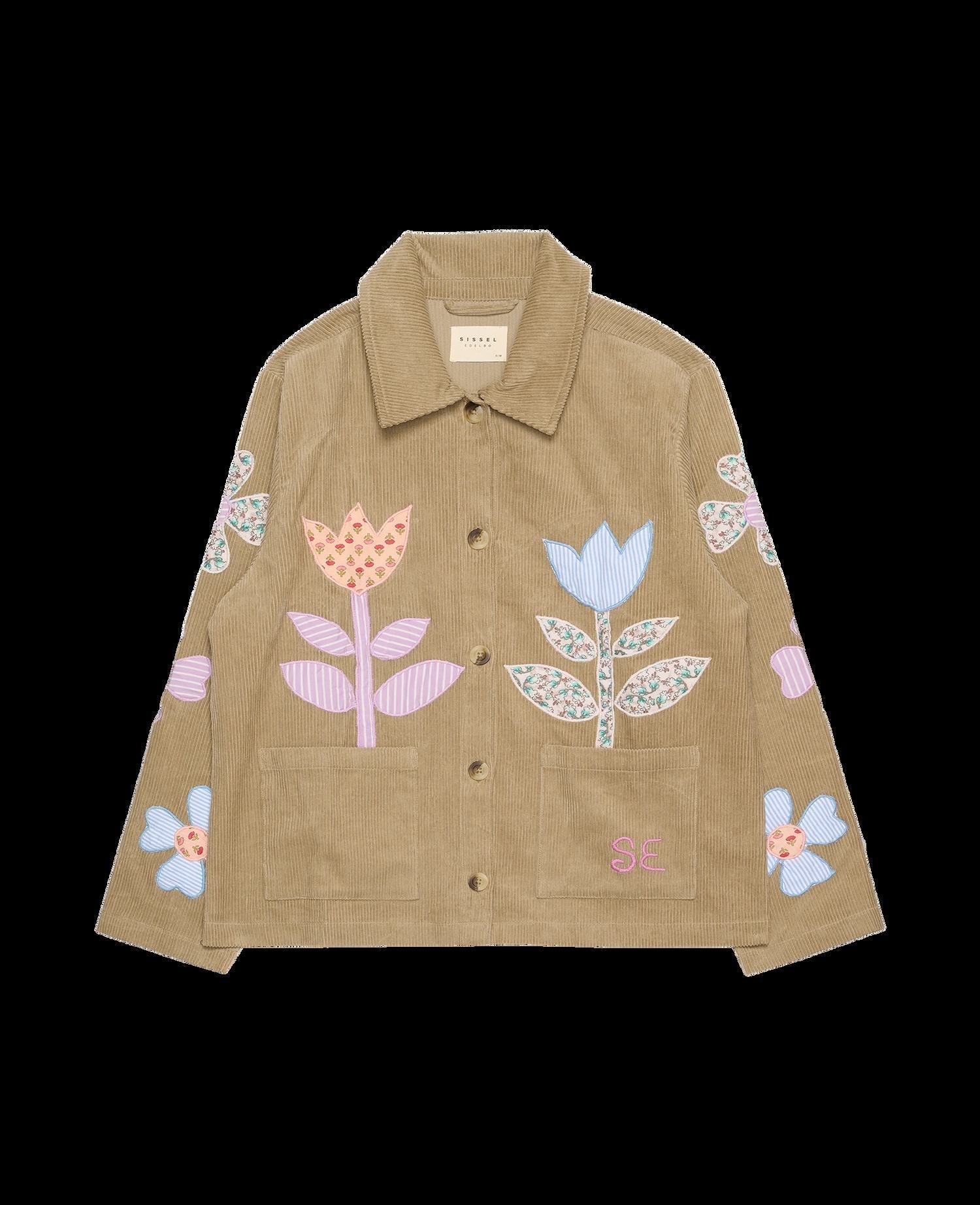 Twiggy Jacket is made in leftover corduroy and is beautifully decorated with hand-applied flower embroidery. It has a casual silhouette with a small shirt collar and long sleeves. The placket at the front is closed with buttons, and two pockets are placed at the body bottom at front.