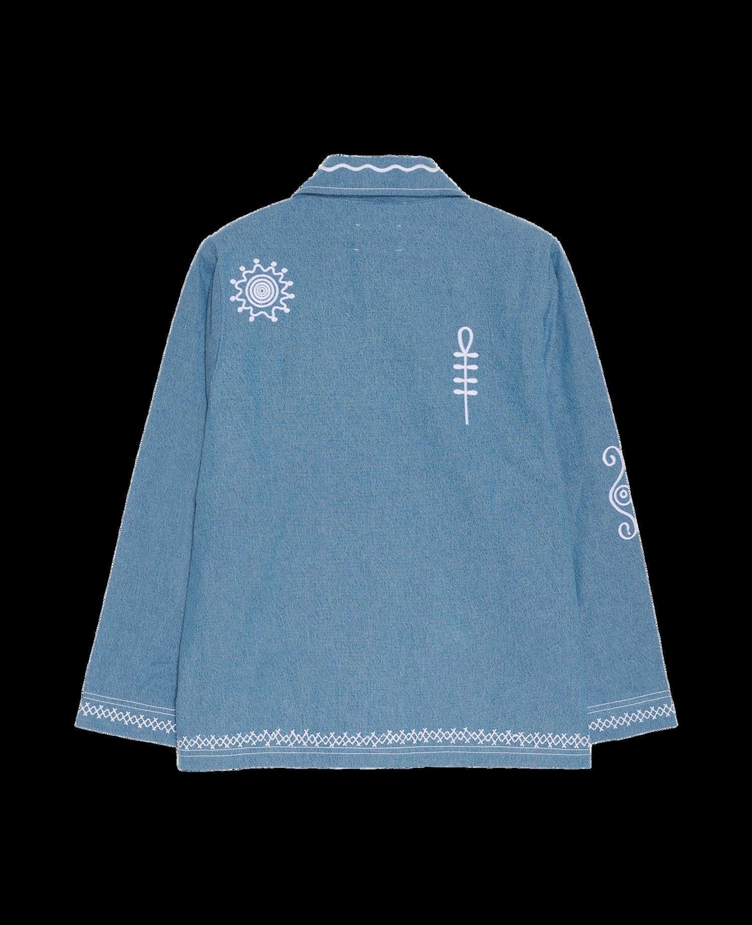My Jacket is a casual shirt jacket with buttons in front at placket. The jacket has a small shirt collar and long sleeves with cuffs. The jacket is made in 100% organic cotton canvas and is beautifully decorated with contrast colored embroidery. LOVE written in Hindi and a Hamsa hand (a universal sign for protection, power, and strength). All the different embroideries on the jacket are inspired by our love for India.