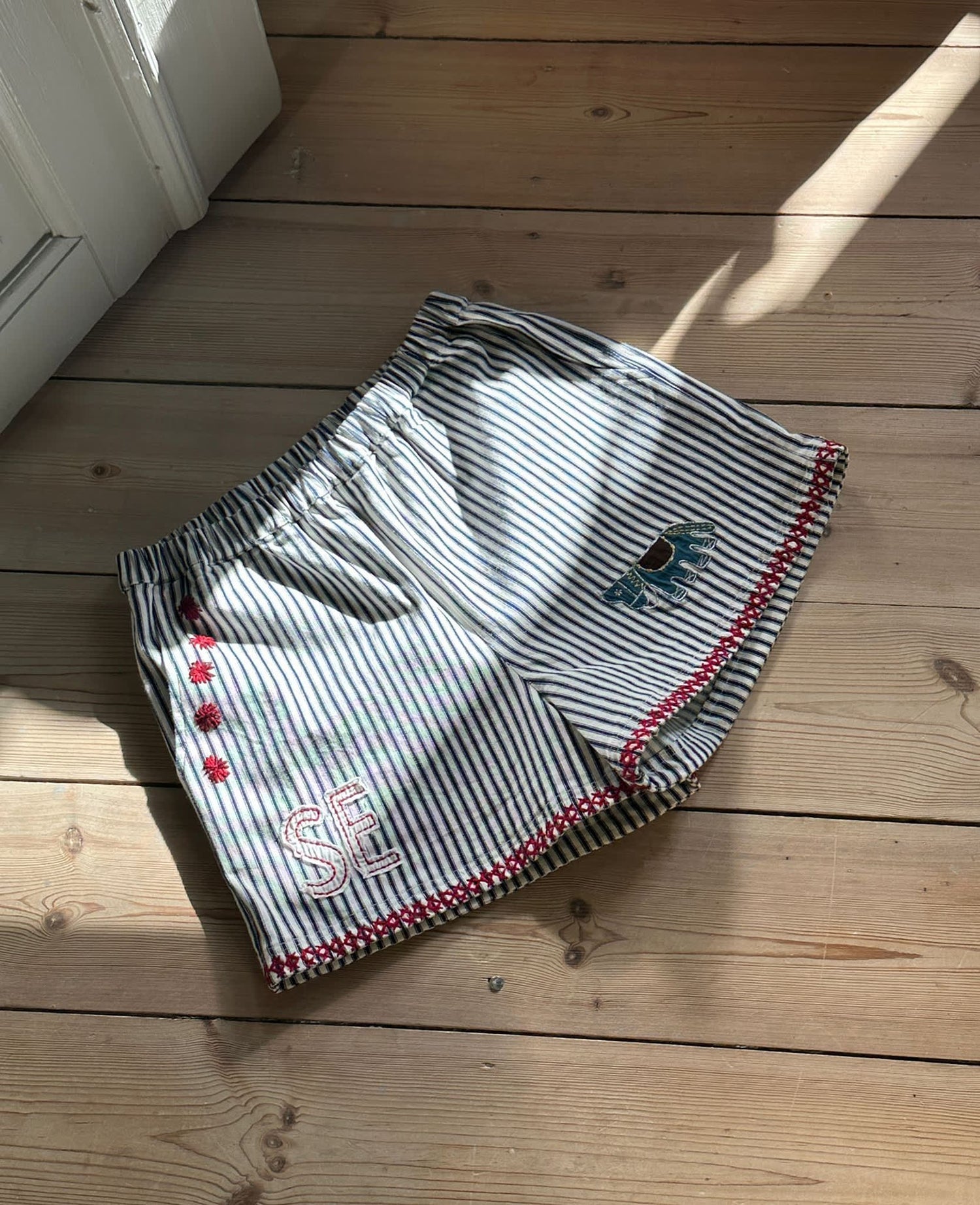 Myra Shorts are made in leftover cotton canvas with 3% stretch and have a casual fit. The shorts feature an elasticated waistband and side seam pockets. They are decorated with embroidered motifs of a sun, a tiger, a horse, ‘SE’ signature embroidery, and other adorable motifs.{CR}{LF}{CR}{LF}At SISSEL EDELBO, we love to find new, innovative ways to make fashionable clothes. One way is to use leftover fabrics found in markets and in our supplier’s stockrooms, also called ‘deadstock fabrics’. As part of our values, we cherish the idea of using different kinds of existing leftover fabrics instead of producing new materials. Our styles made in the leftover fabrics will always be limited edition, due to the limited fabric amount that is left.{CR}{LF}{CR}{LF}S/M{CR}{LF}Waist relaxed: 71 cm{CR}{LF}Waist stretched: 112 cm{CR}{LF}Hips: 110 cm{CR}{LF}Inseam length: 9 cm{CR}{LF}{CR}{LF}M/L{CR}{LF}Waist relaxed: 79 cm{CR}{LF}Waist stretched: 120 cm{CR}{LF}Hips: 118 cm{CR}{LF}Inseam length: 9.7 cm