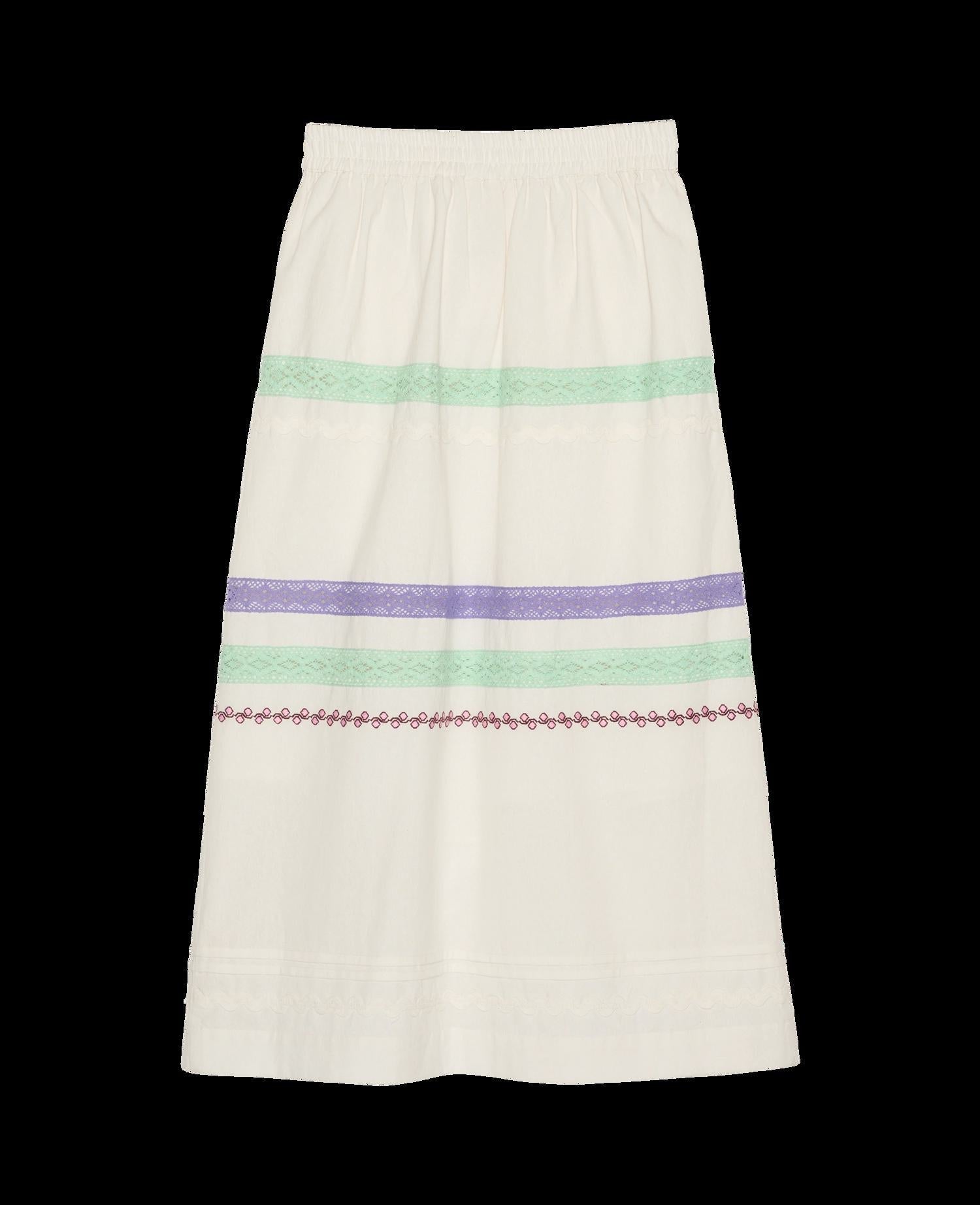 Isha Skirt is a calf-length skirt made in 100% organic cotton. The skirt has a slightly A-line silhouette and features an elasticated waistband for a comfortable fit. It includes side seam pockets and is decorated with delicate embroidery.{CR}{LF}{CR}{LF}100% organic cotton{CR}{LF}{CR}{LF}ONESIZE{CR}{LF}Waist relaxed: 71 cm{CR}{LF}Waist stretched: 104 cm{CR}{LF}Hips: 112 cm{CR}{LF}Length: 85 cm