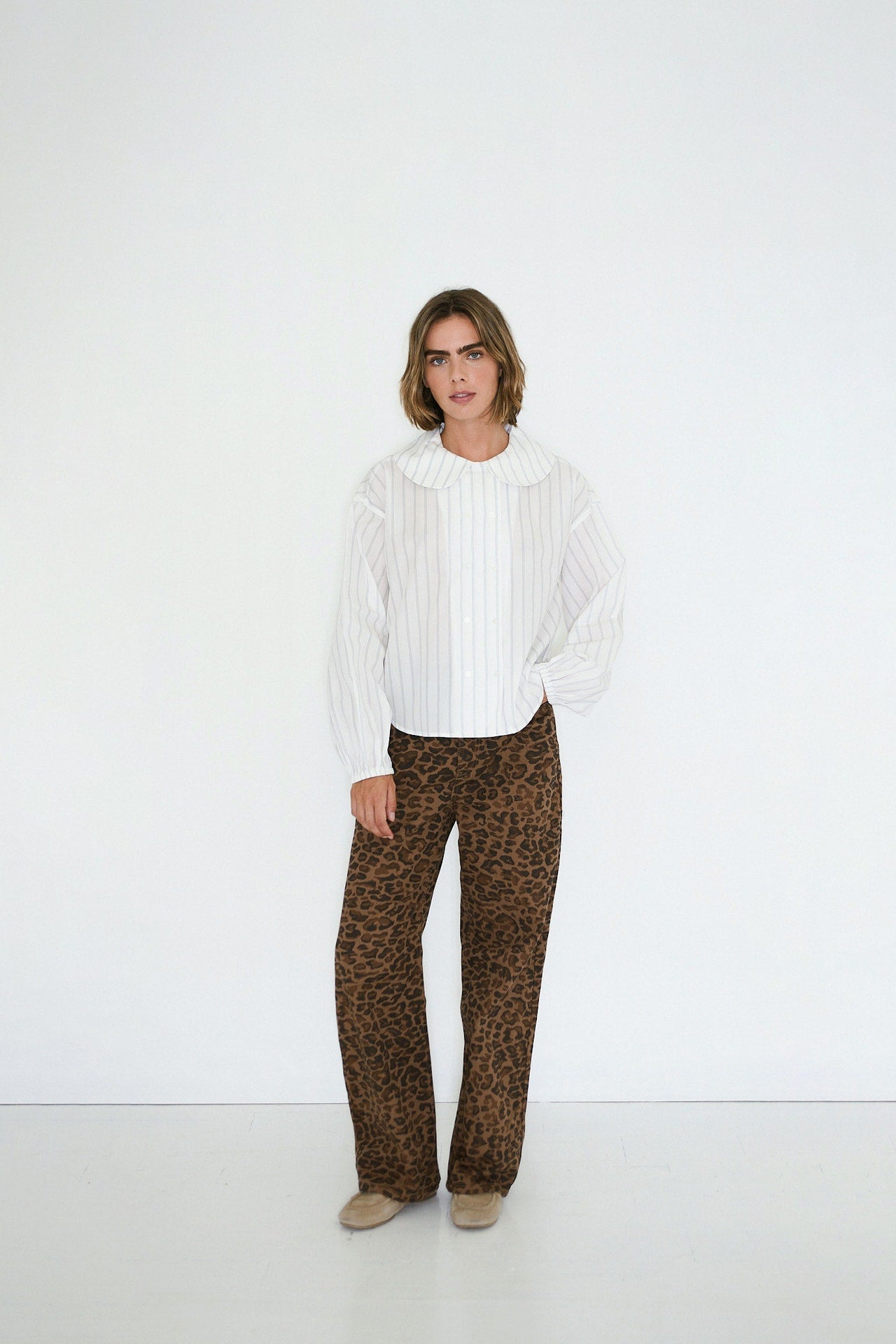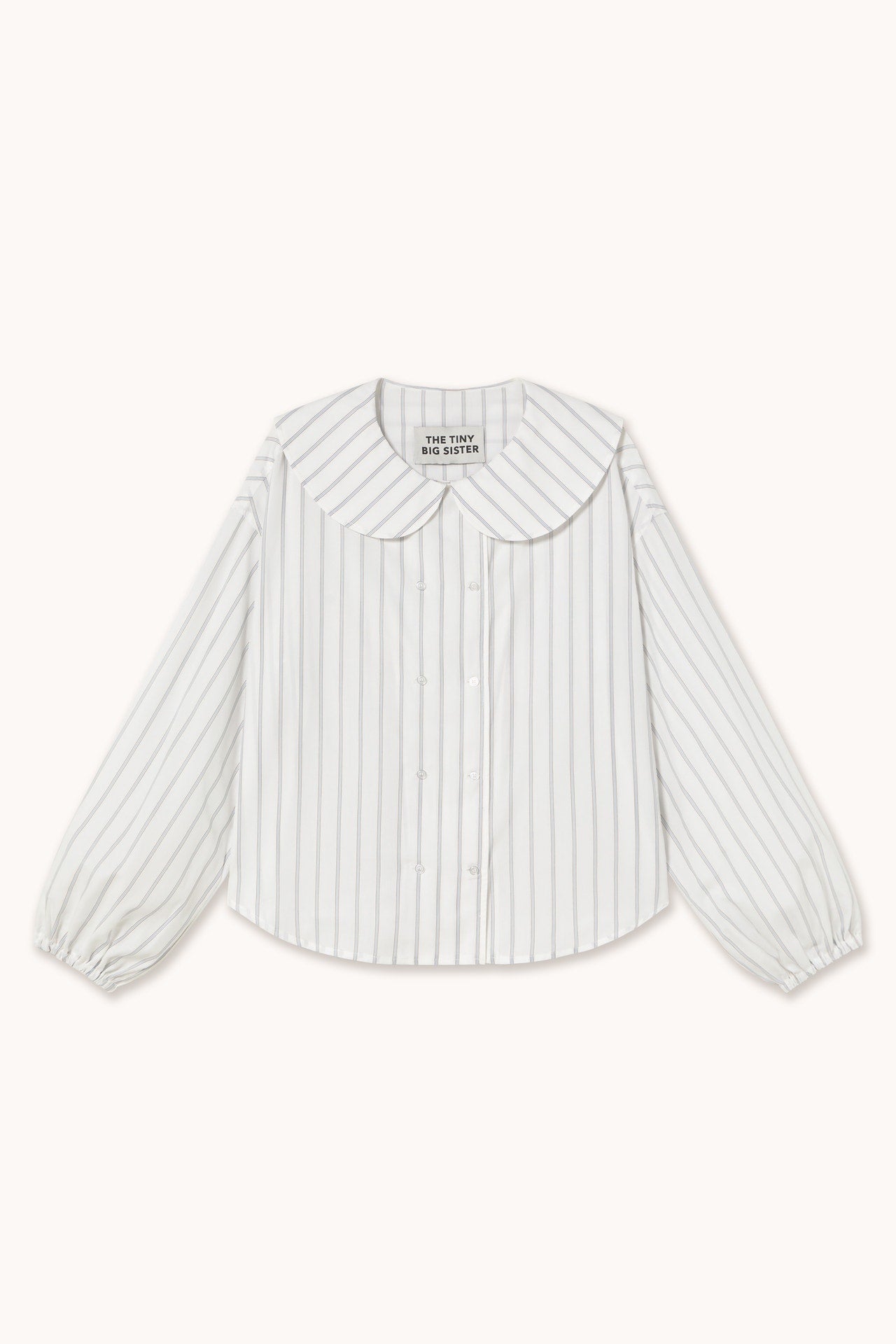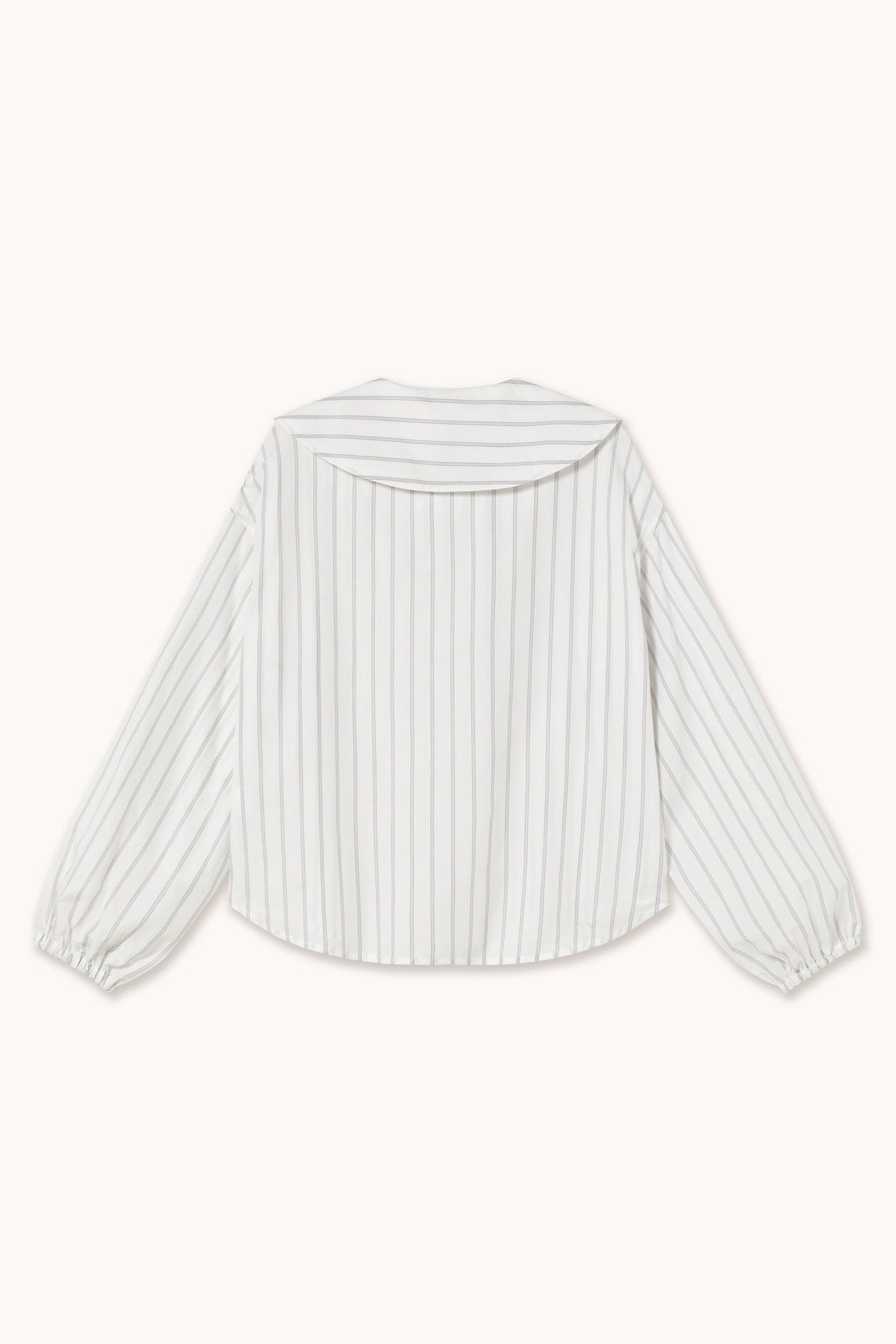 Crafted from yarn-dyed striped cotton poplin with an off-white base, this relaxed-fit blouse features a statement baby doll collar and dropped shoulders. Voluminous sleeves are finished with elasticated hems, creating a balanced silhouette. The double-breasted button opening adds a refined and modern touch.