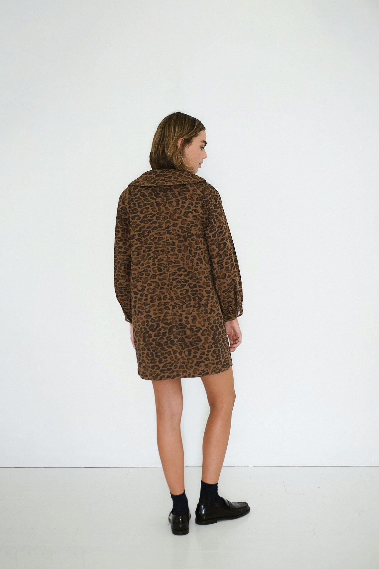 Crafted from heavy twill with a mocha base and tonal animal print. This dress features a statement collar and a double-breasted front with silver snap closures. Designed with side pockets and voluminous sleeves, finished with cuffs and button openings for a refined silhouette.
