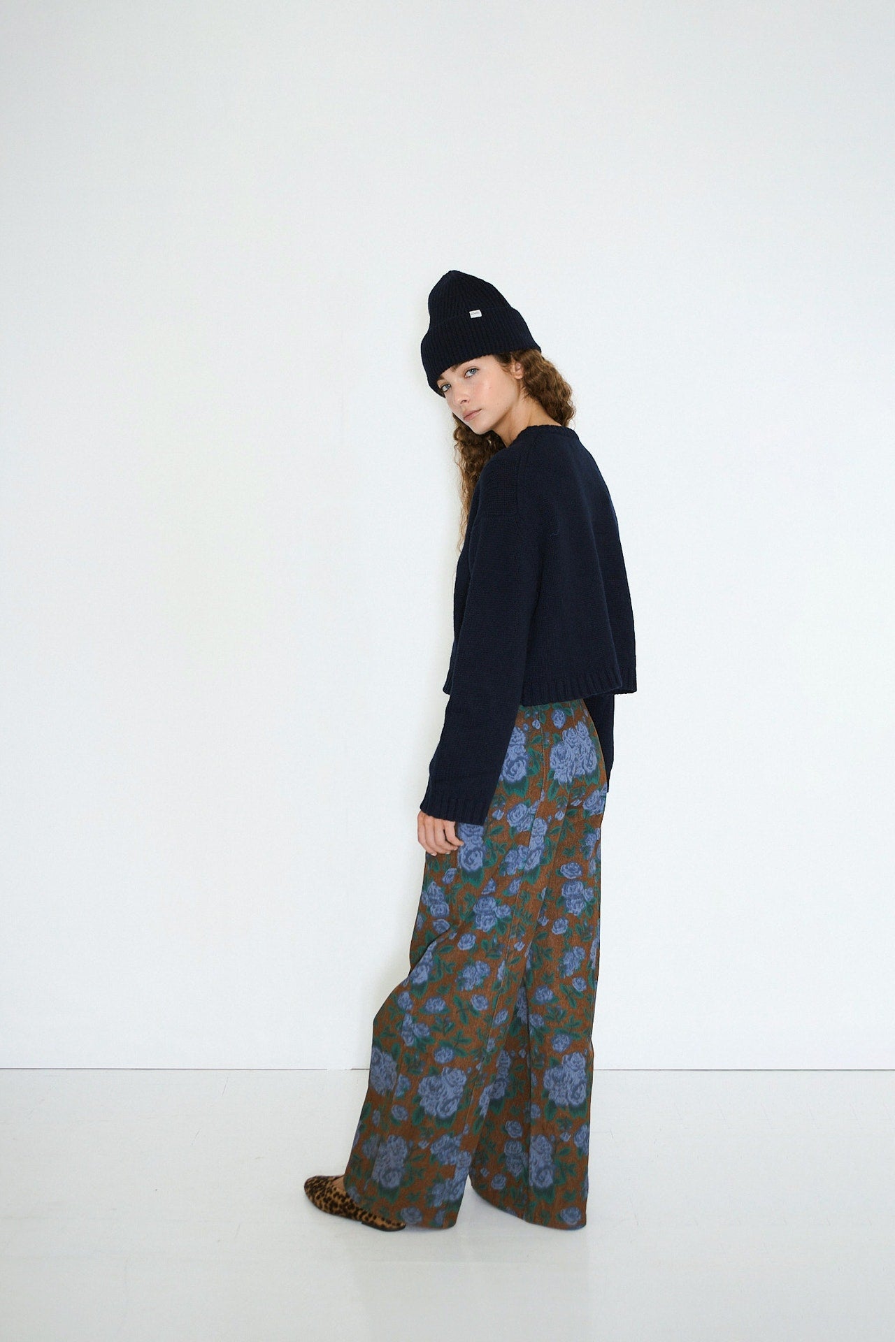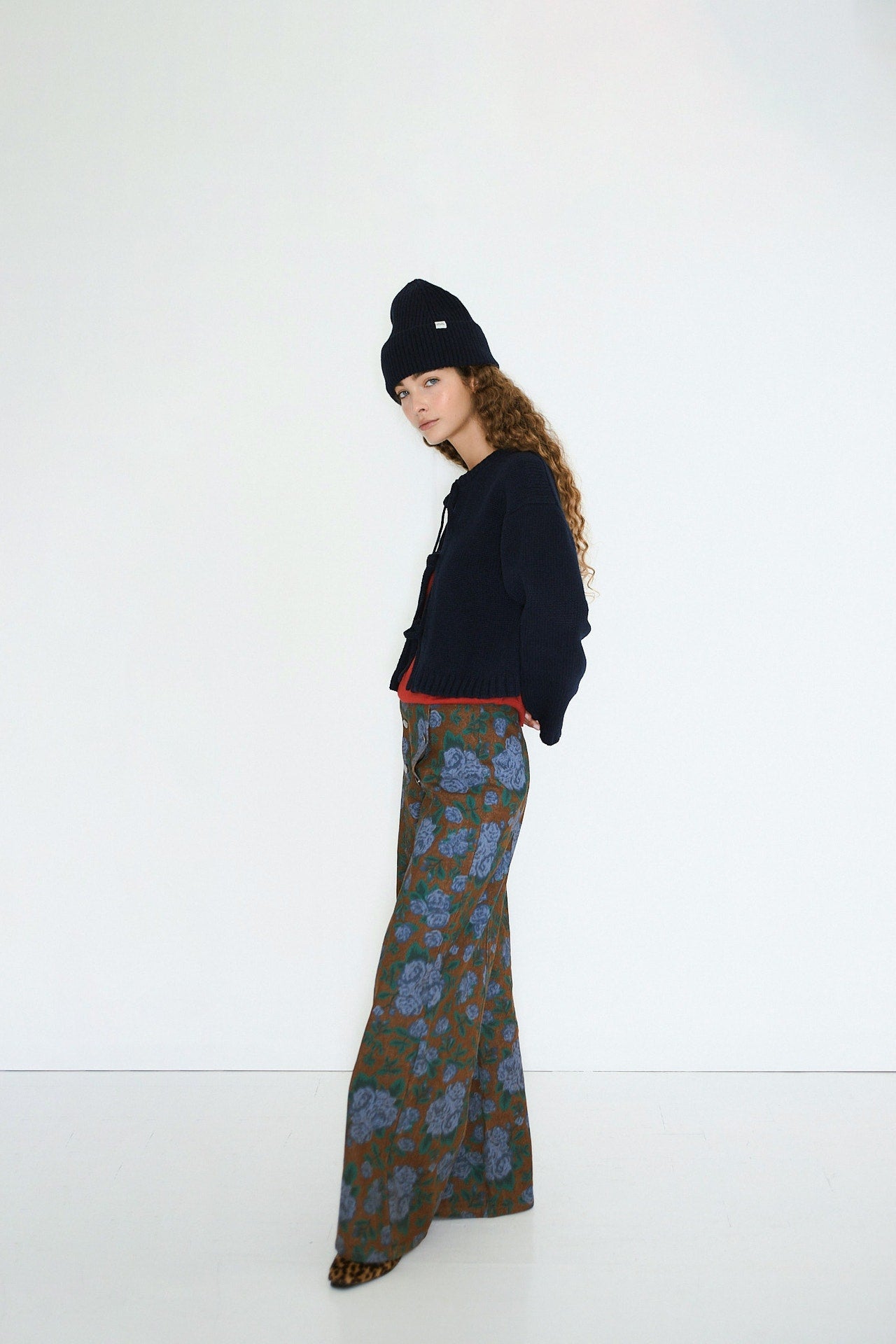 Crafted from warm merino wool in a navy base, this cardigan is a refined option for seasonal layering. Designed with a round neck, ribbed hems, and a front opening with lace-detail closure. The slightly boxy silhouette and wider sleeves offer a modern, softly structured fit.