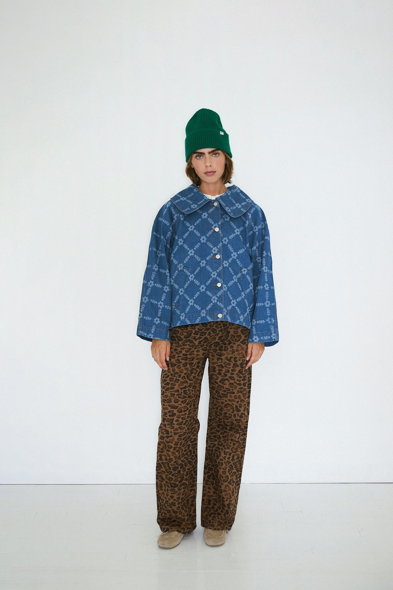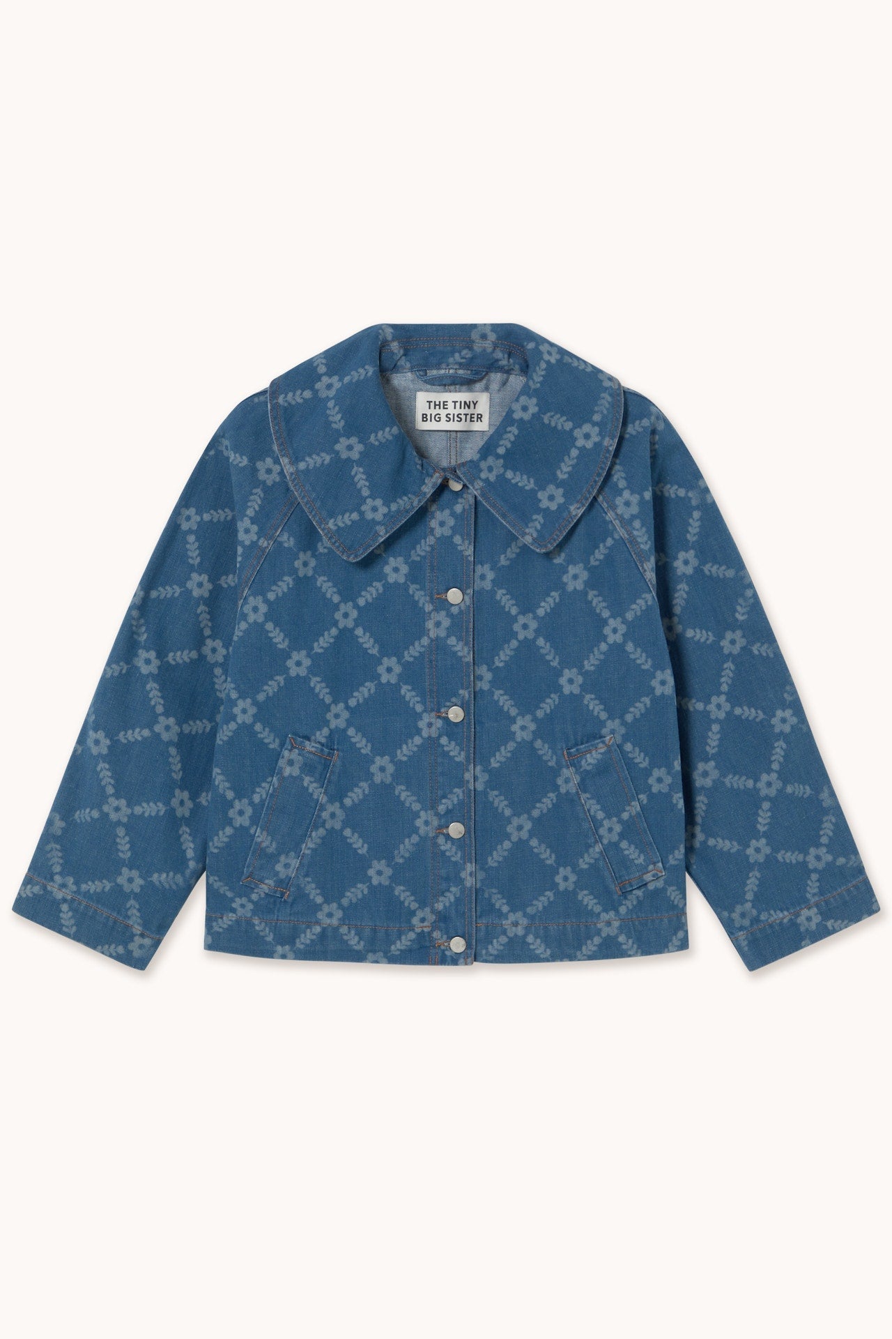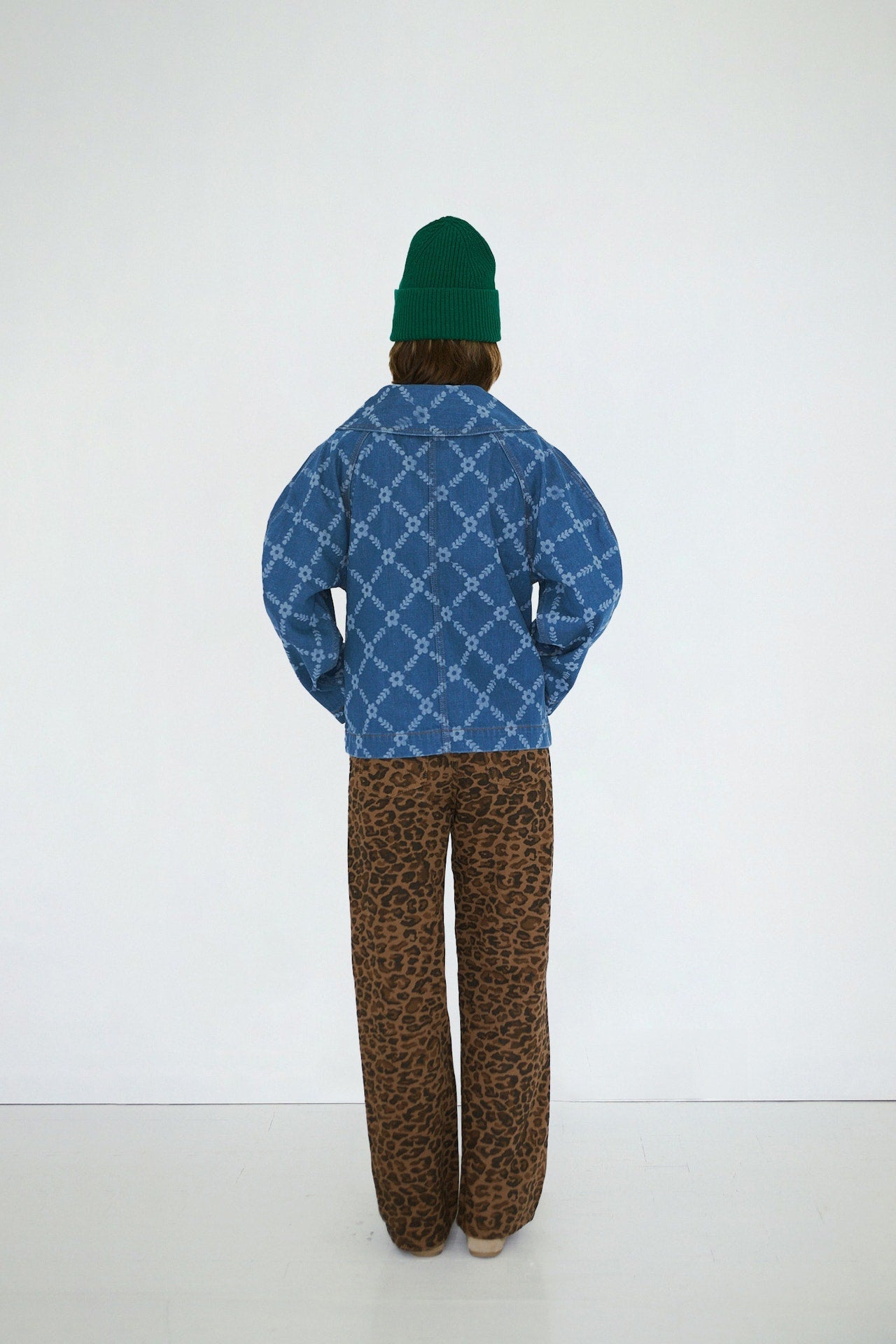 A modern rework of classic denim. This mid-wash jacket features a subtle floral grid laser print across a clean, structured silhouette. Detailed with a statement collar, silver-tone buttons, front welt pockets, and a defined back cutline. Pair with the matching denim for a sharp, cohesive look.